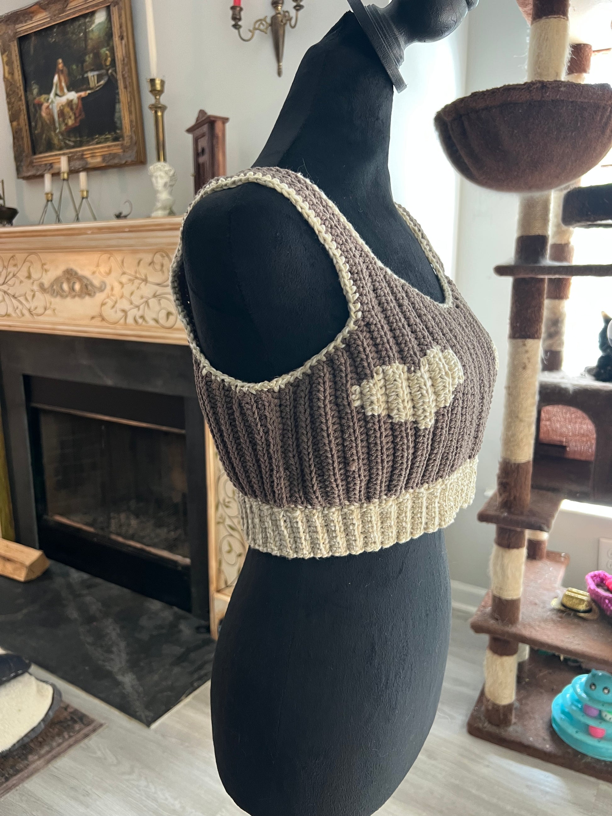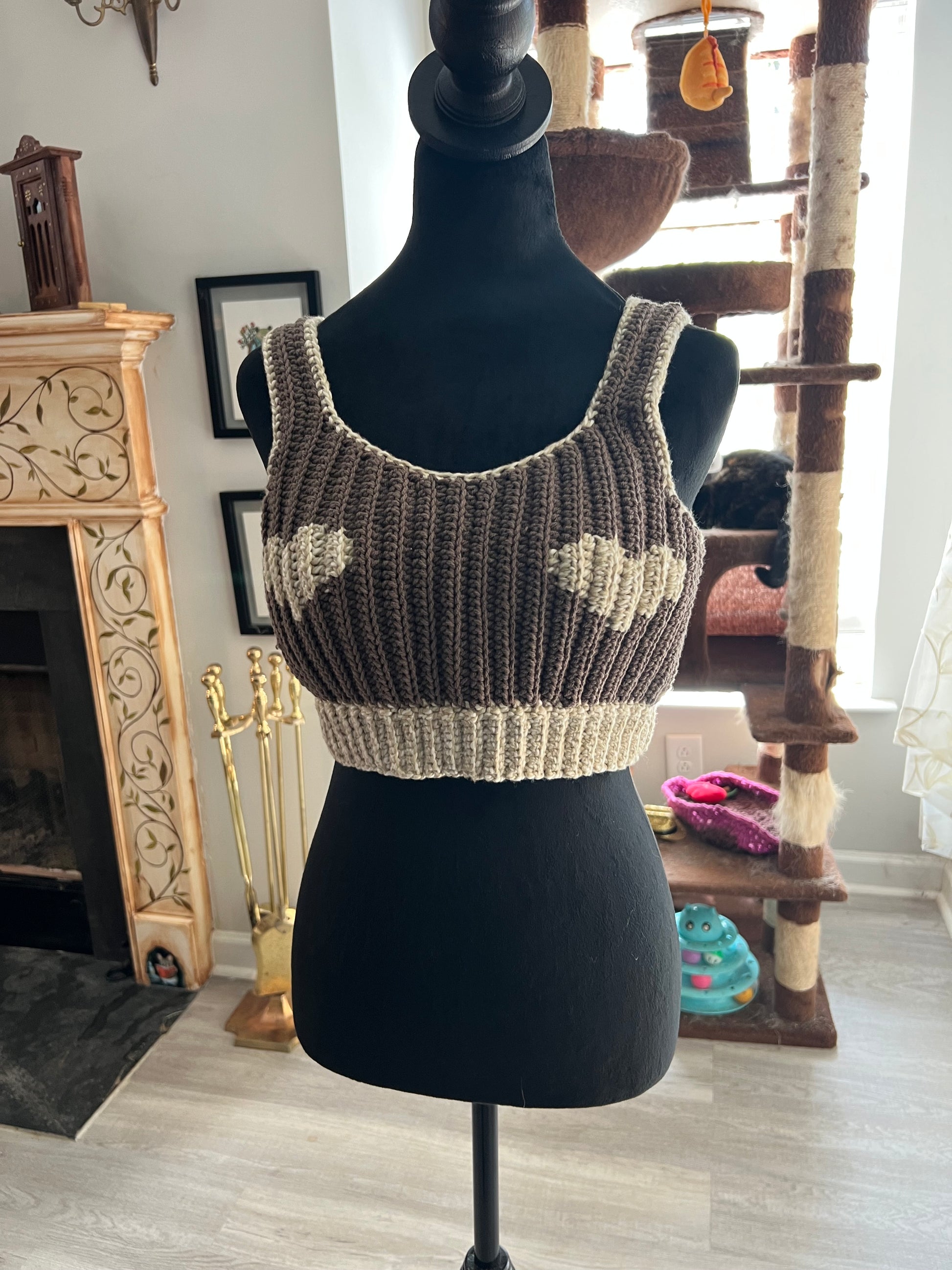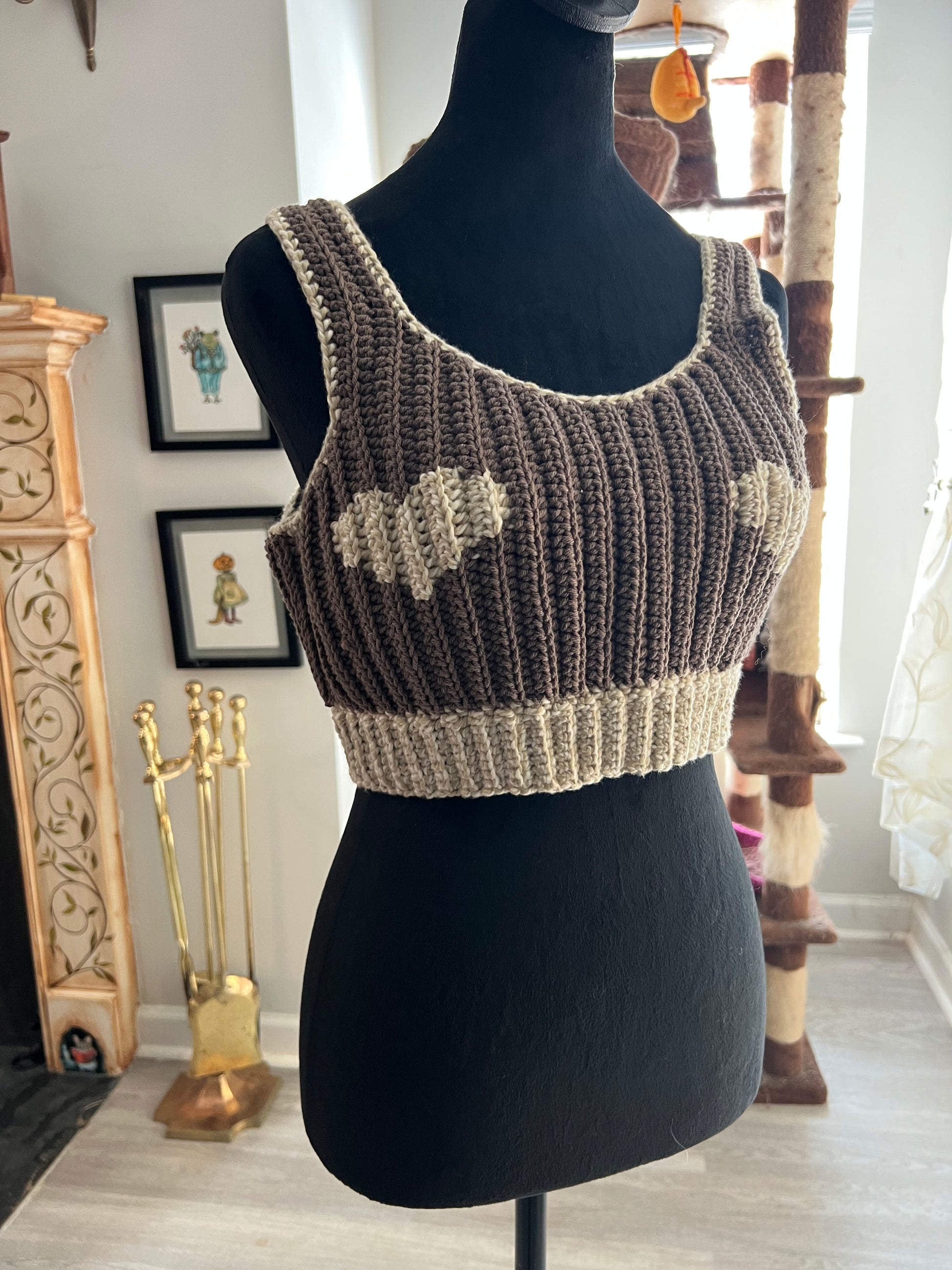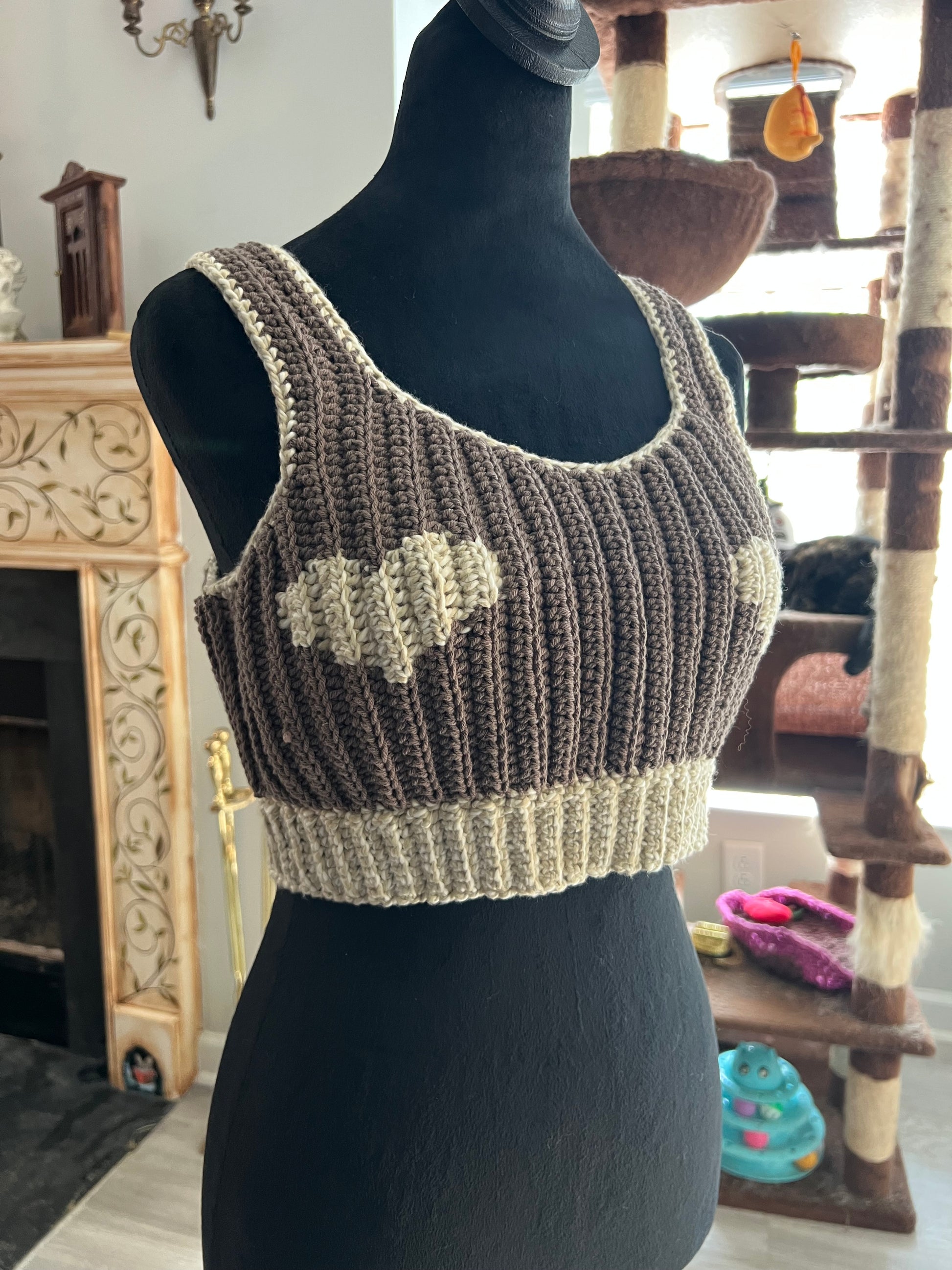 Show your breasties a little love with this tank top! It’s made from an acrylic and cotton blend yarn, and is super stretchy and breathable. Fits like a size medium, but I’m happy to provide measurements upon request.