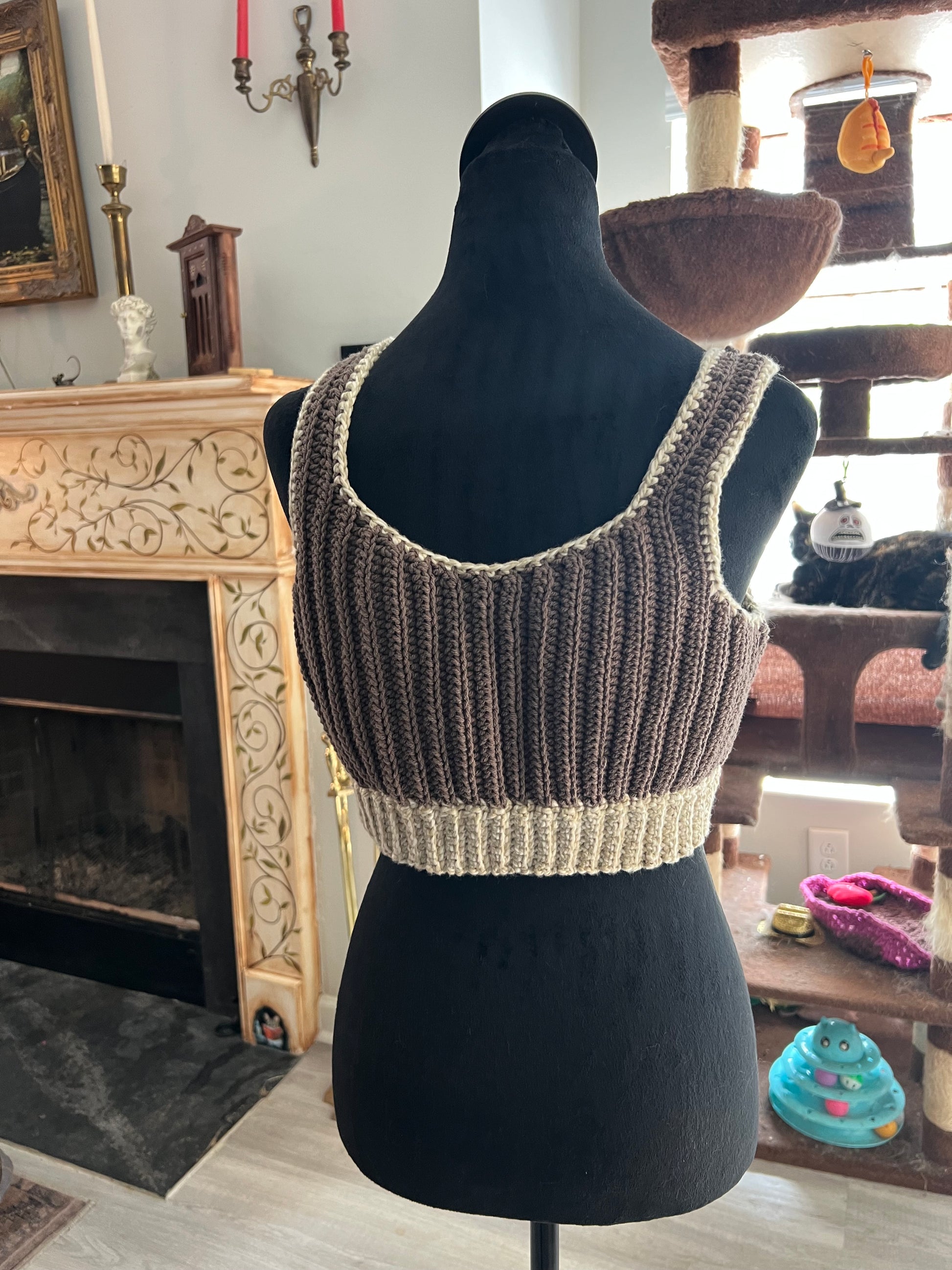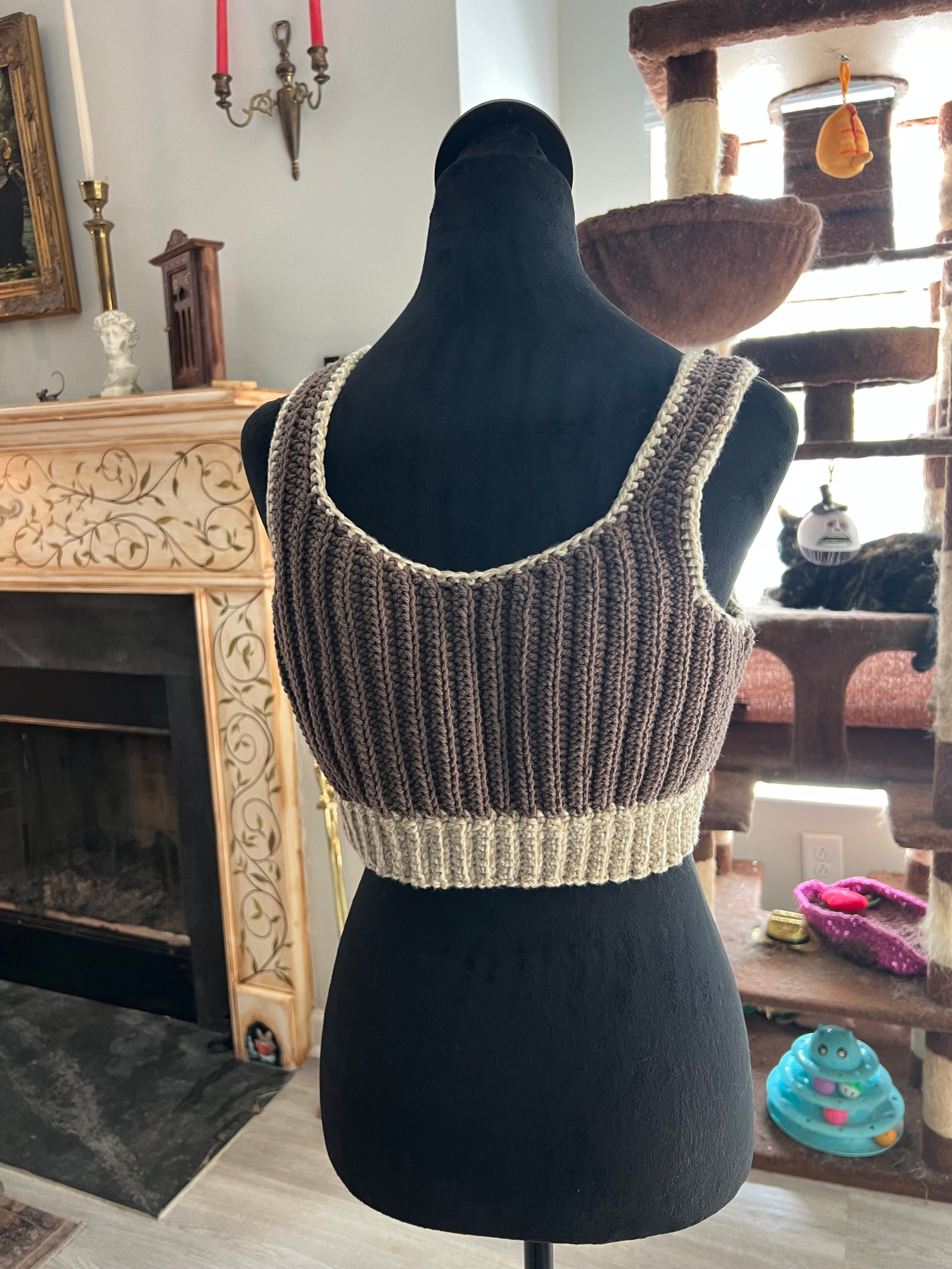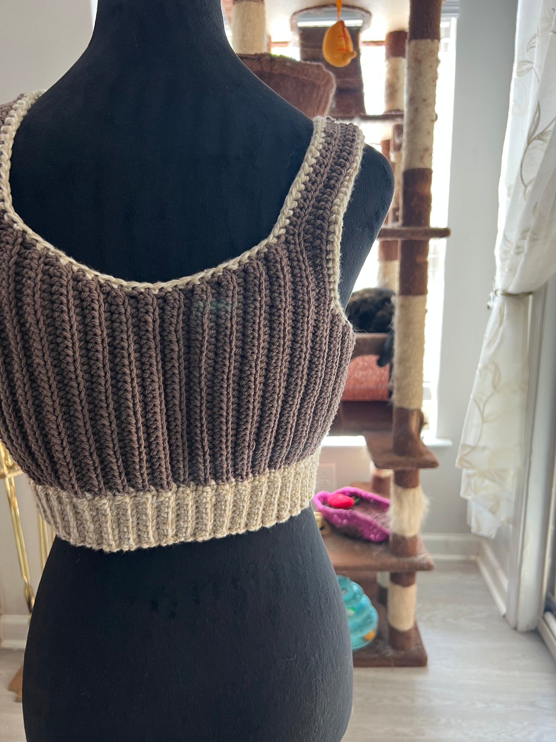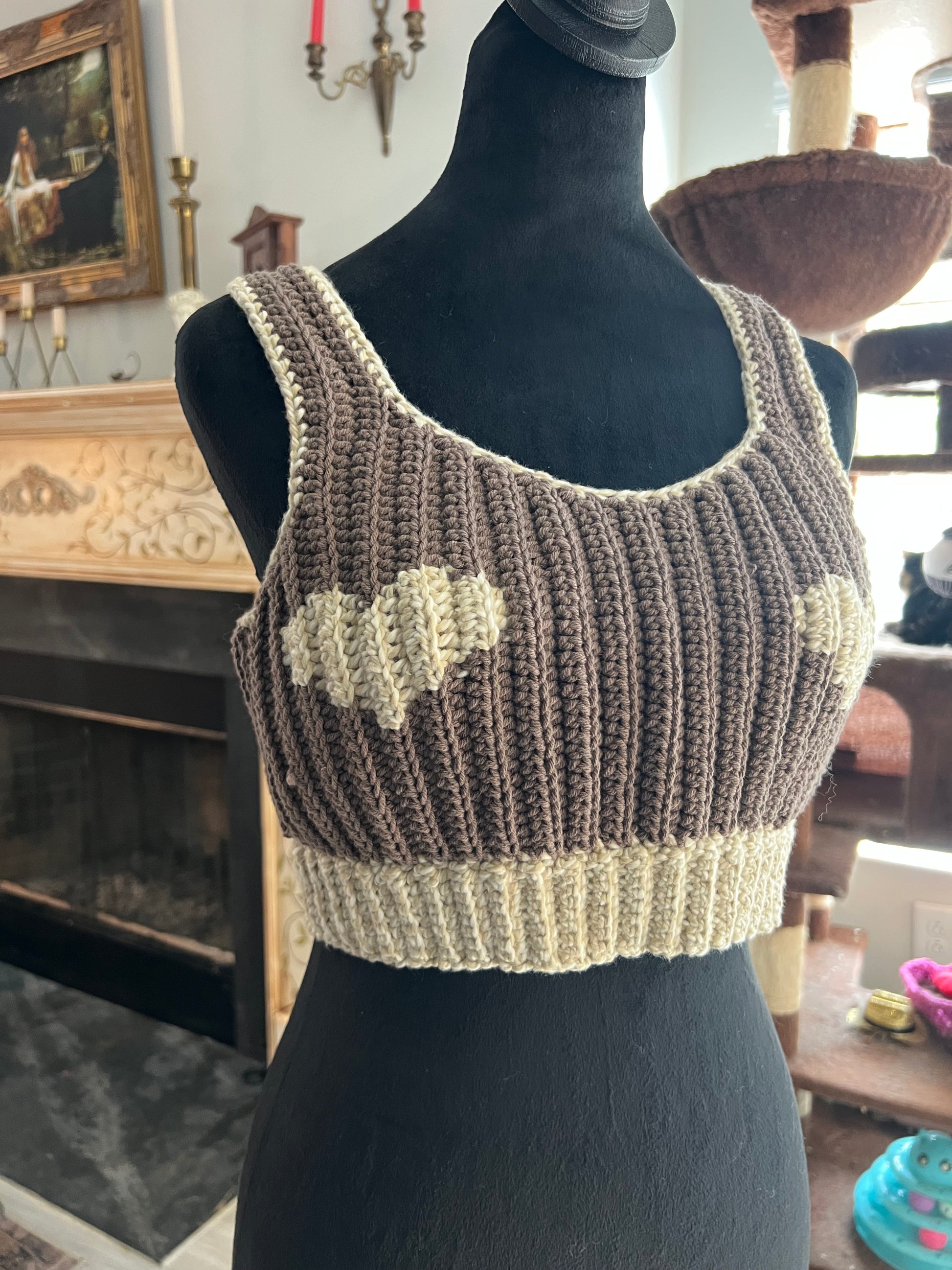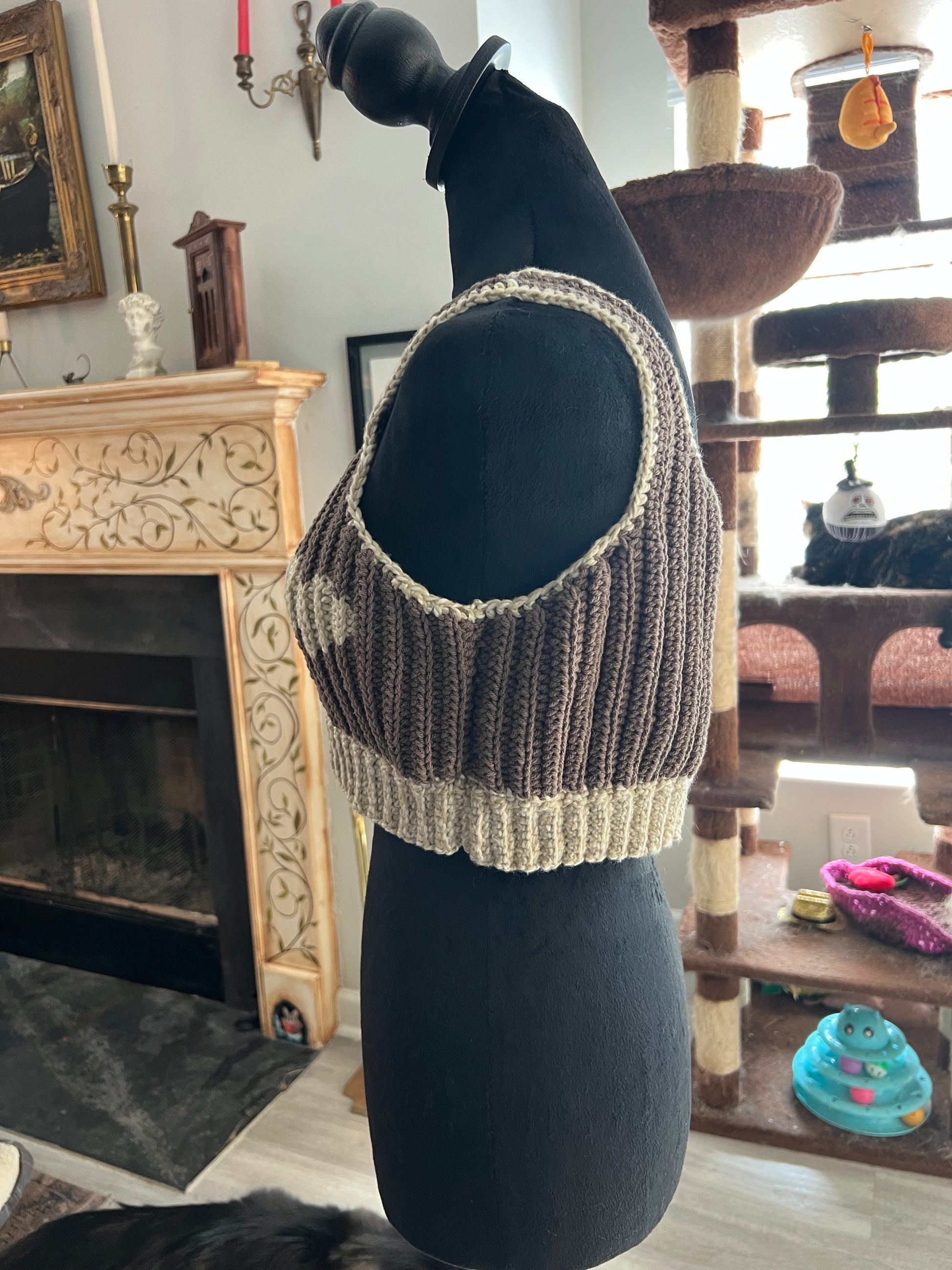 Show your breasties a little love with this tank top! It’s made from an acrylic and cotton blend yarn, and is super stretchy and breathable. Fits like a size medium, but I’m happy to provide measurements upon request.