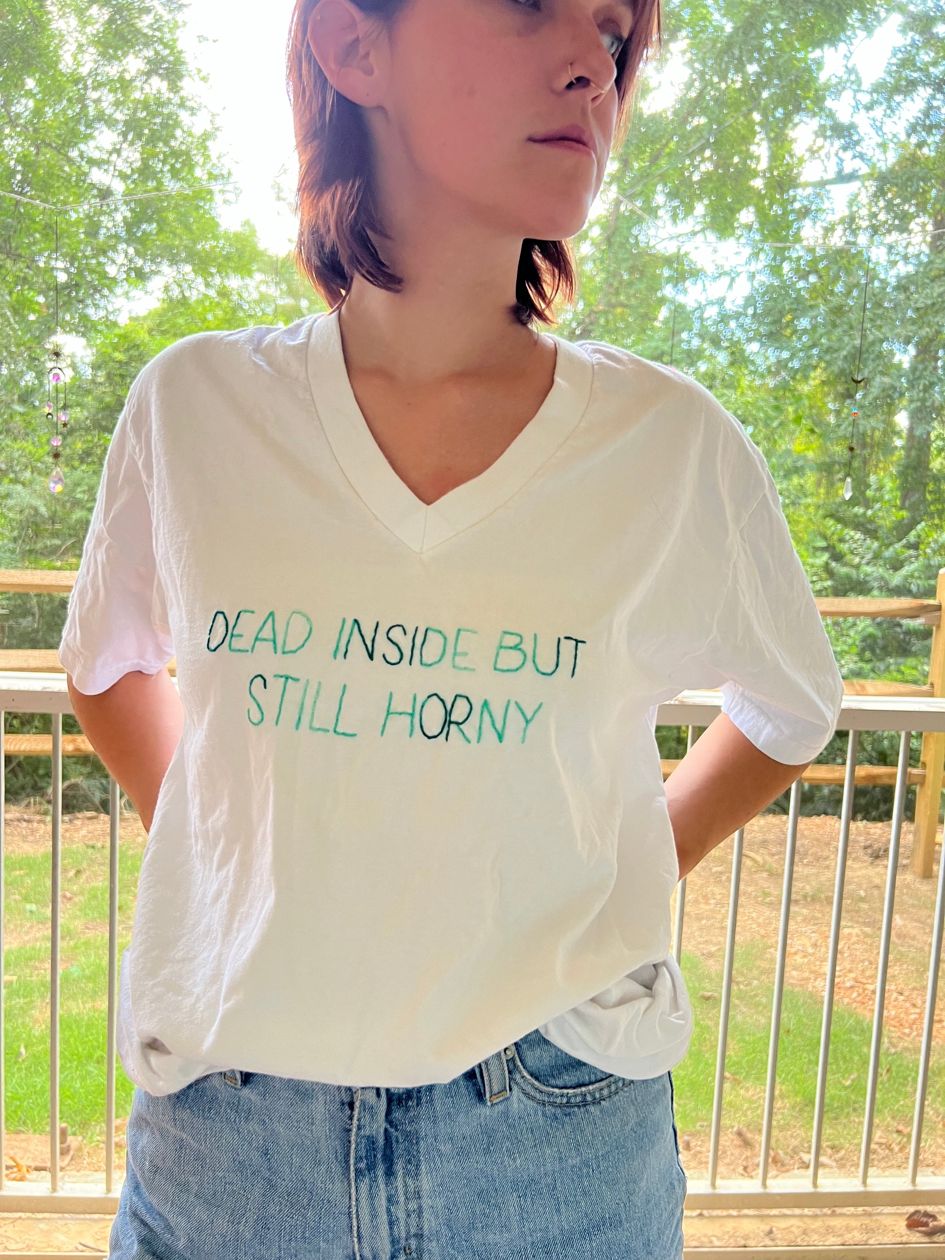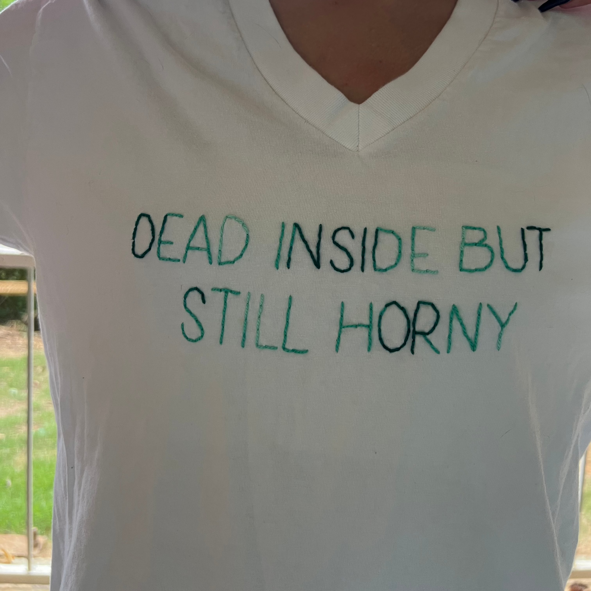 Expertly crafted for the chronically horny and chronically depressed, our Dead Inside But Still Horny Shirt boasts hand-embroidered lettering with a touch of humor. Made with a crisp white v-neck design, this shirt is perfect for those who embrace their desires while also acknowledging their inner struggles. Don't wait, grab yours now before it's gone.