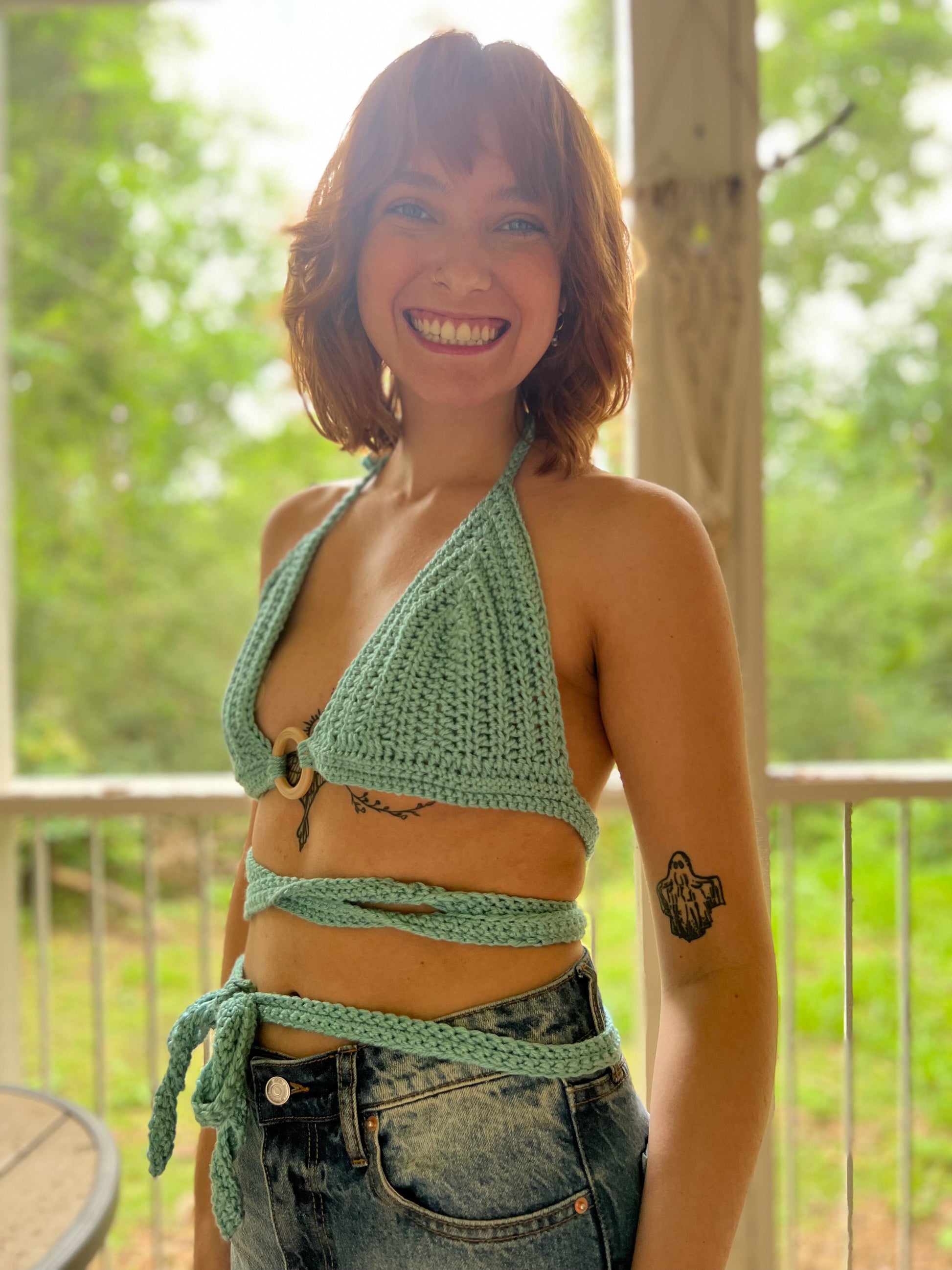 The Festival Wrap Top offers a delicate and versatile look, with its light blue color and wooden ring feature. Its highly adjustable design allows for various ways of wearing, making it suitable for different body sizes. A must-have for any festival-goer or anyone who wants to add a unique piece to their wardrobe.