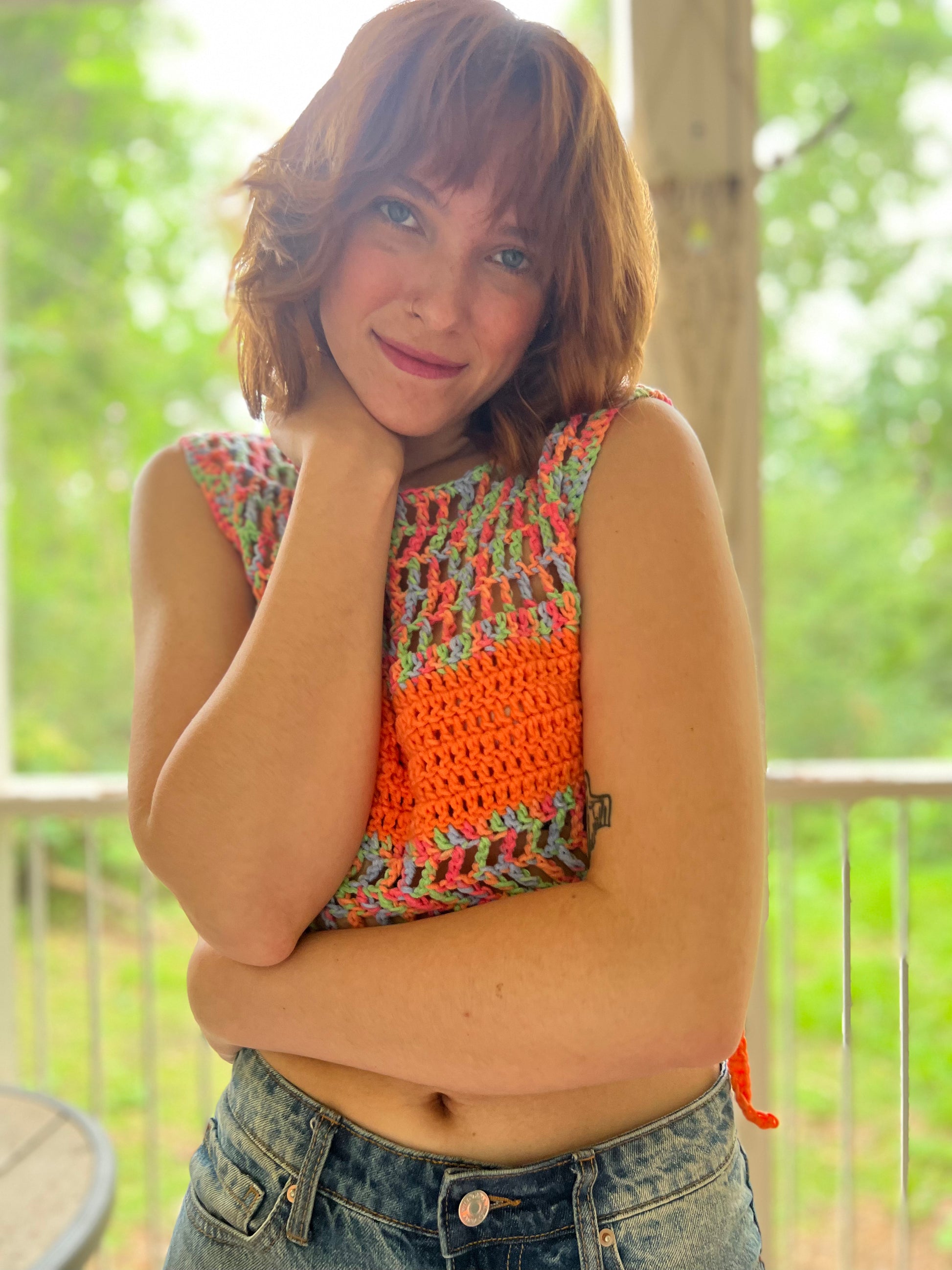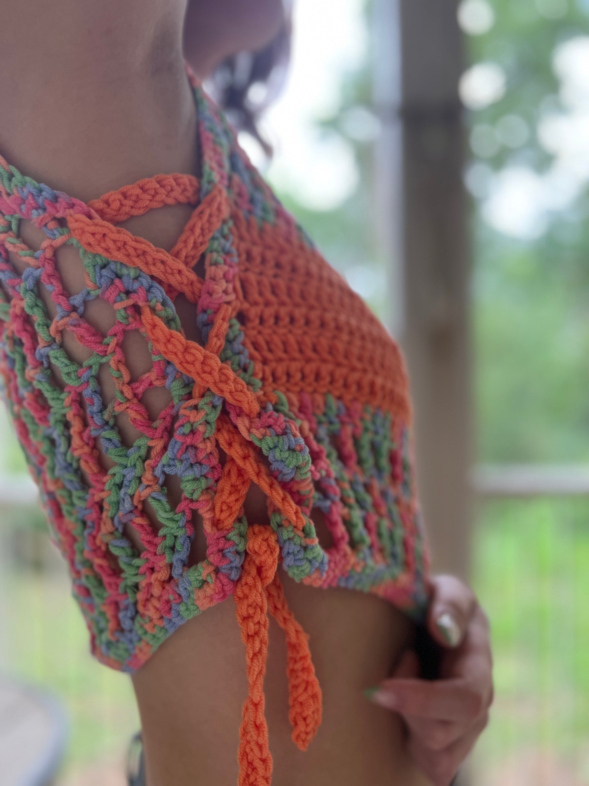Stay cool and stylish this summer with the Froot Loops Top. Loosely crocheted and with adjustable corset sides, this top is perfect for any summer occasion. The vibrant colors, reminiscent of the beloved cereal, will make you stand out. And with a solid panel in front, this top offers both style and coverage. Upgrade your summer wardrobe with our Froot Loops Top.
