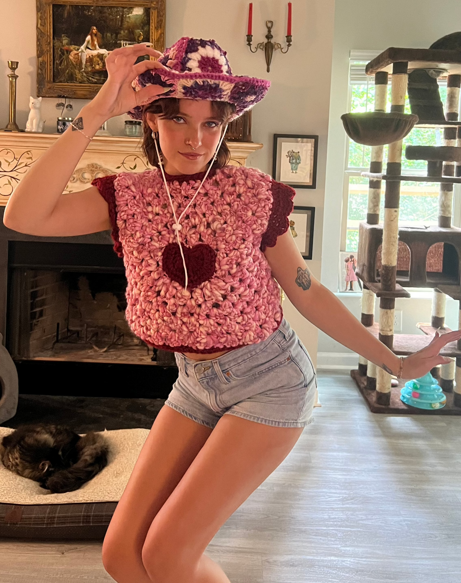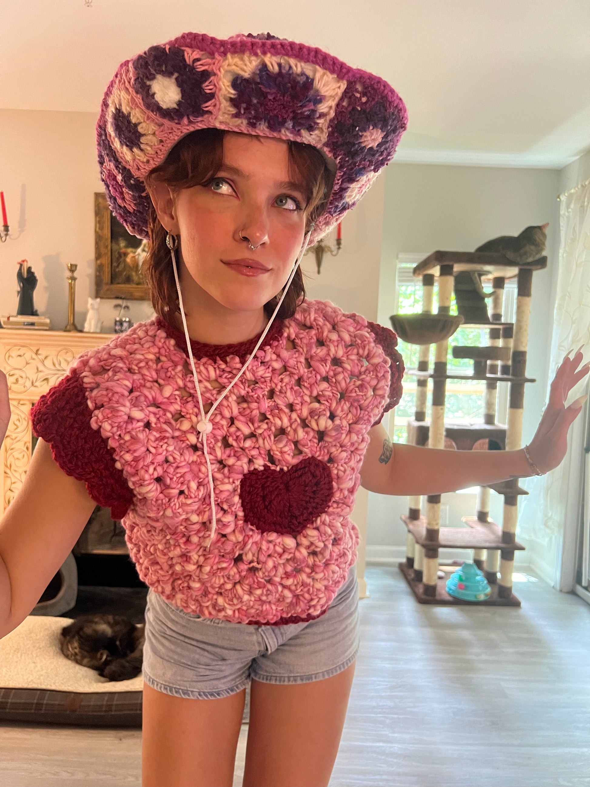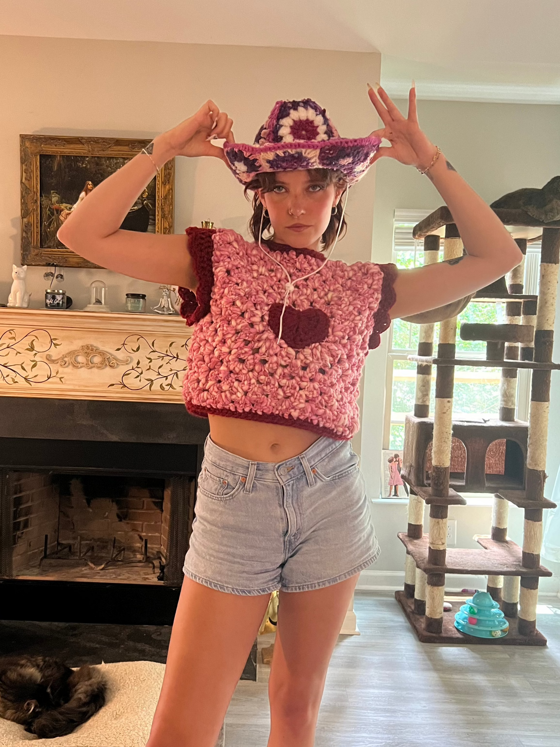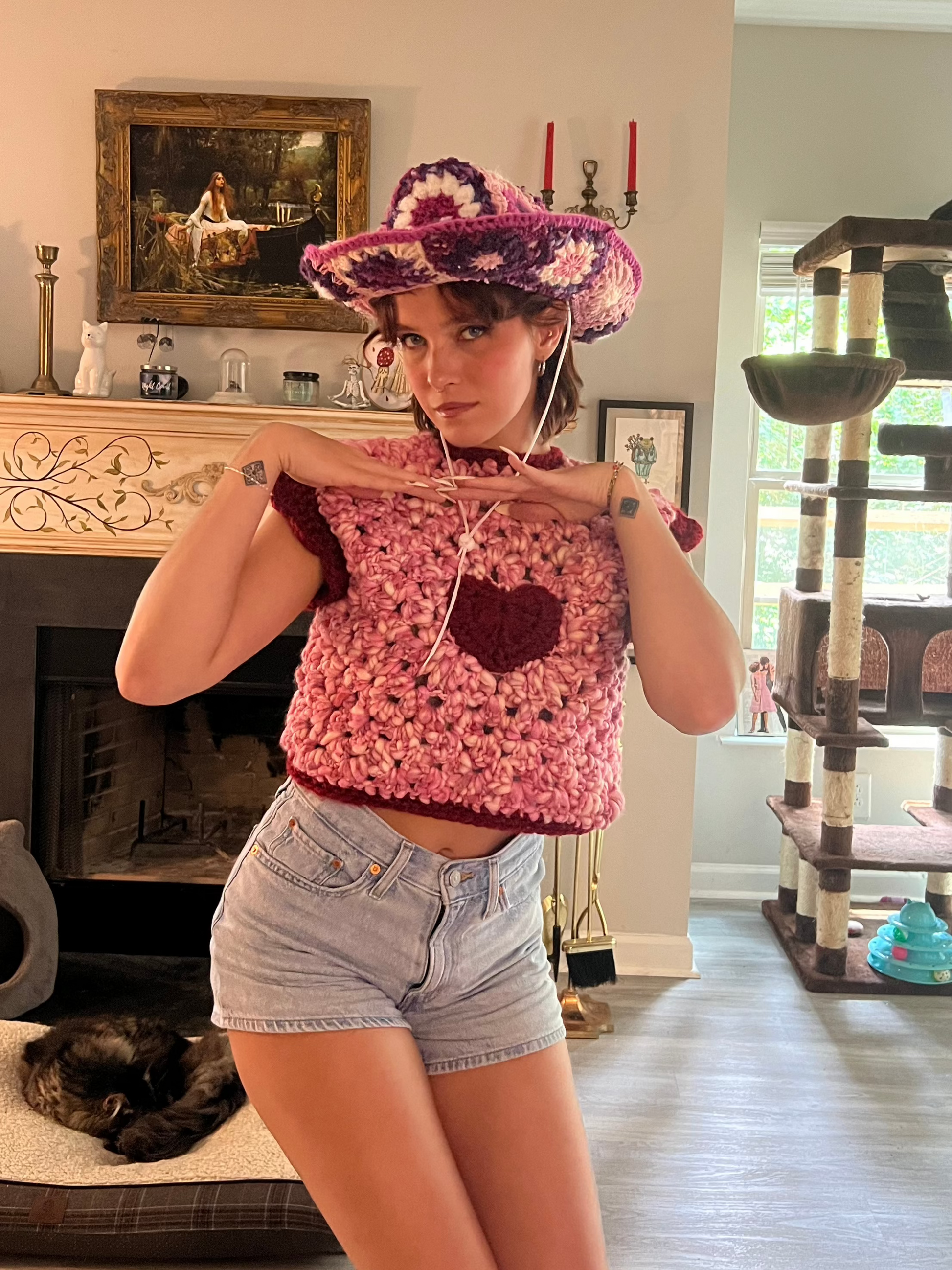The Heart Sweater Vest features soft wool yarn, making it a cozy and warm addition to your wardrobe. With a unique red scalloped cap sleeve cut detail, this one-of-a-kind vest is perfect for those who love both style and comfort. Due to this yarn being discontinued, there will never be another like it. Don't wait, get yours now!