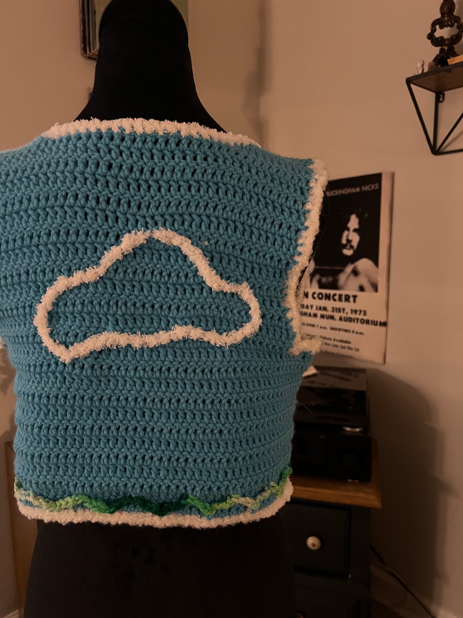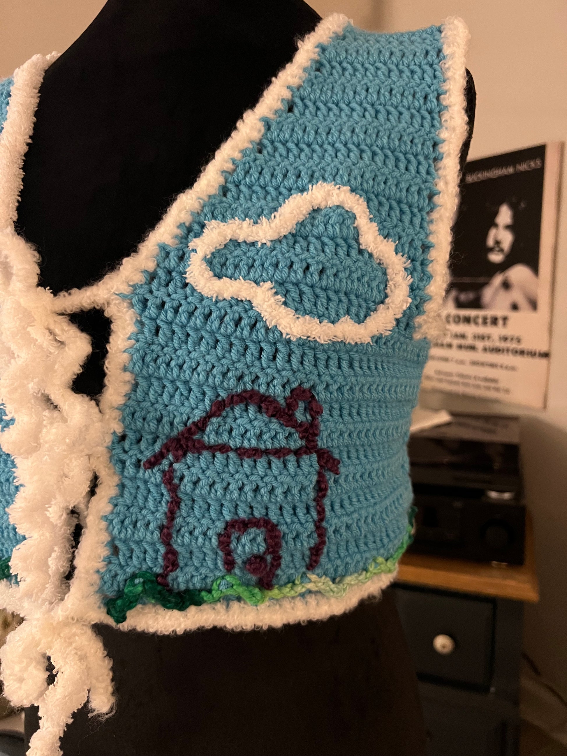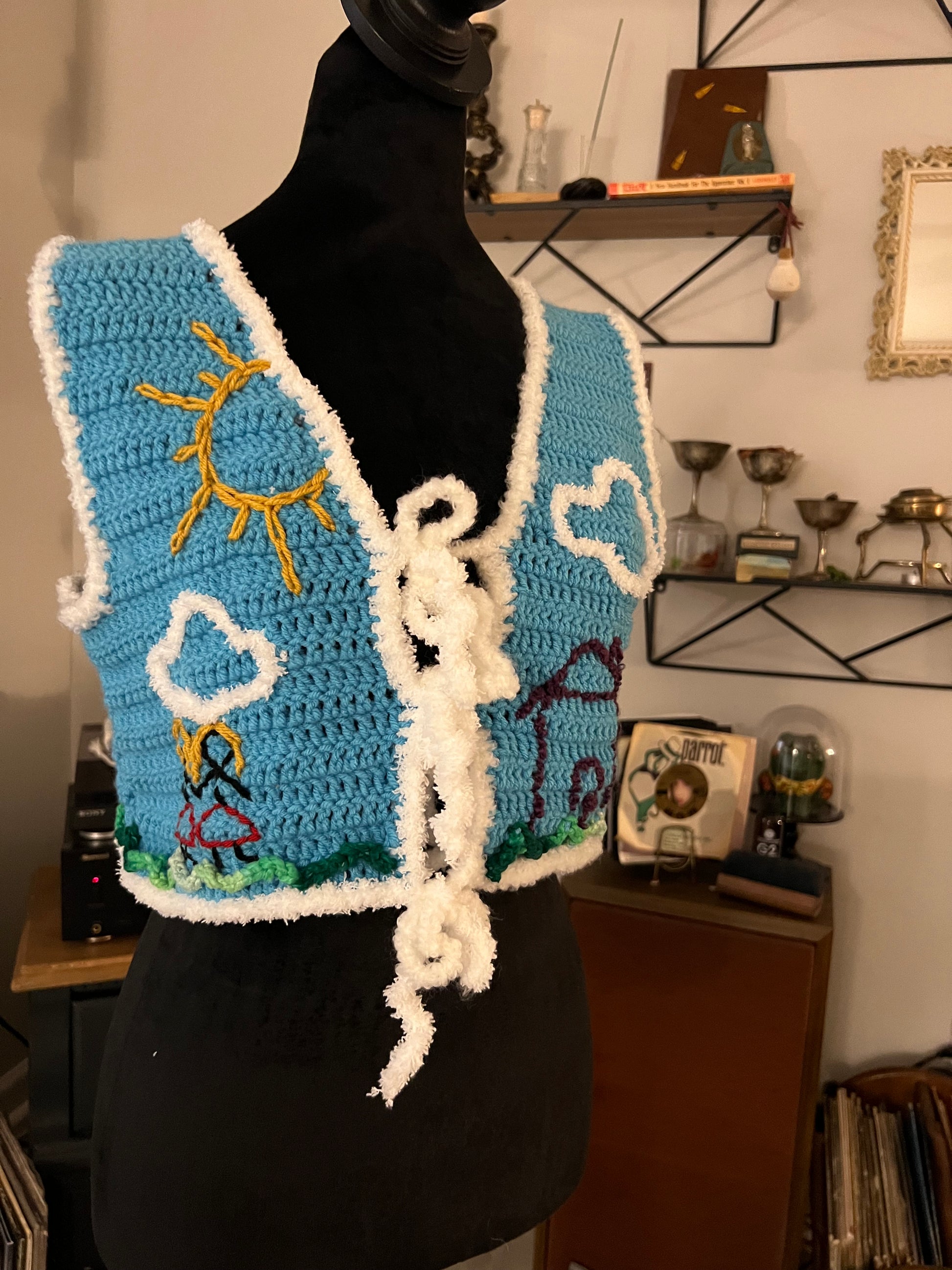 i made this blue vest with the idea of a kids crayon drawing. in those drawings, the skies tend to always be blue and the sun is always shining, with fluffy white clouds floating past. i hope this vest brings you the childlike joy that it brought me as i made it. the vest is crocheted and the drawing details are surface crocheted and hand embroidered.