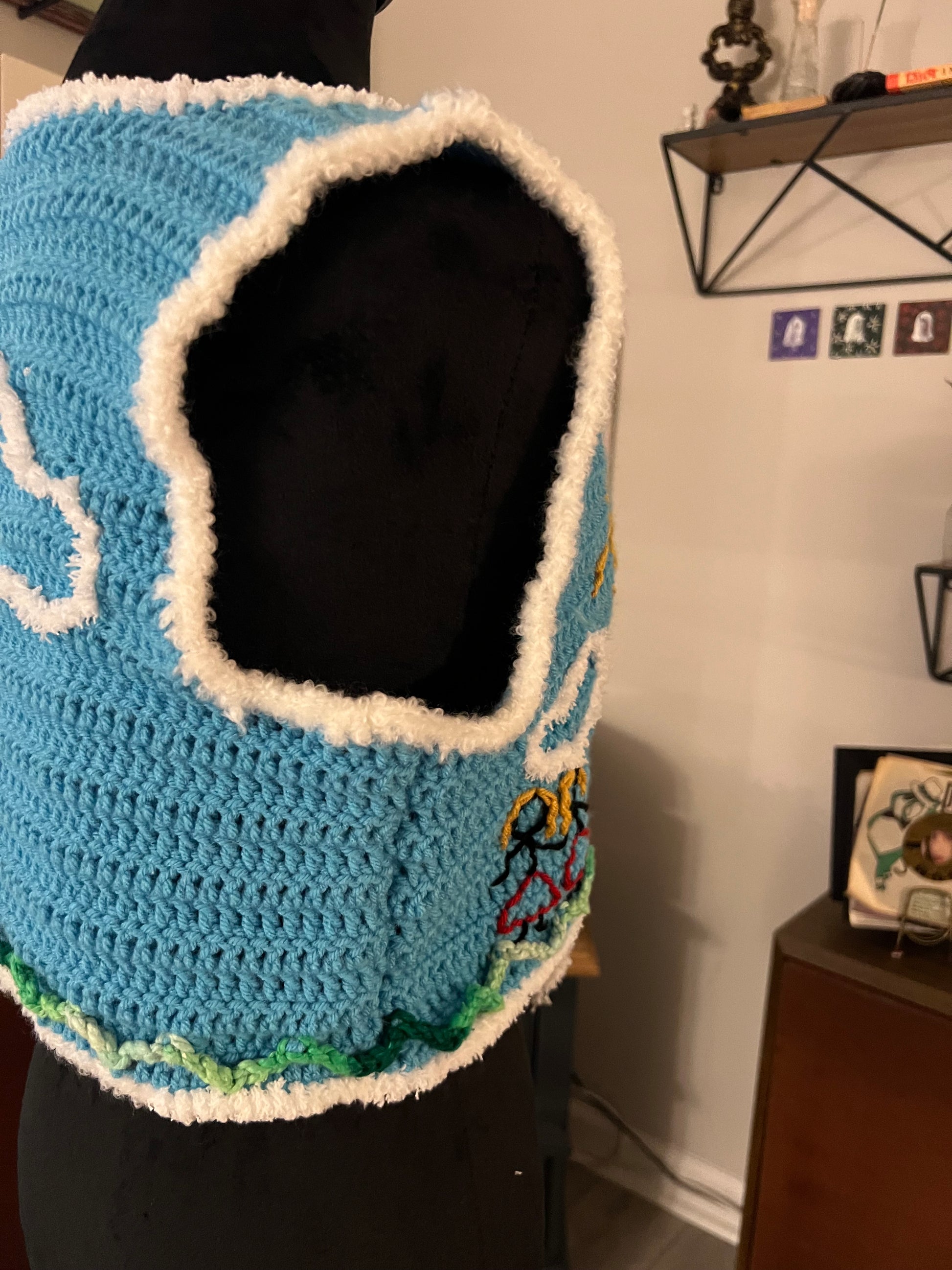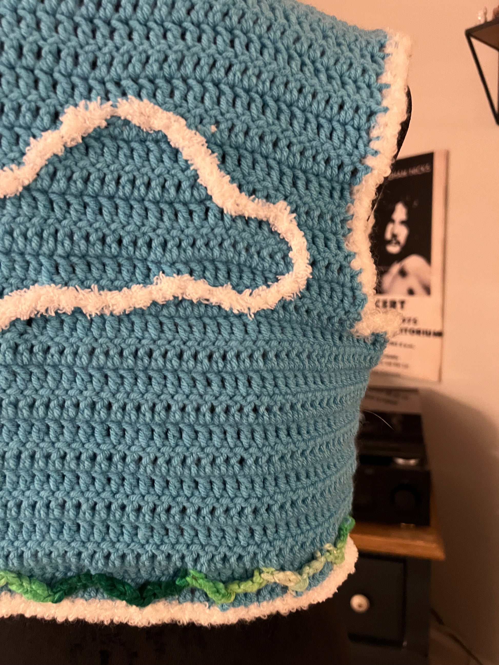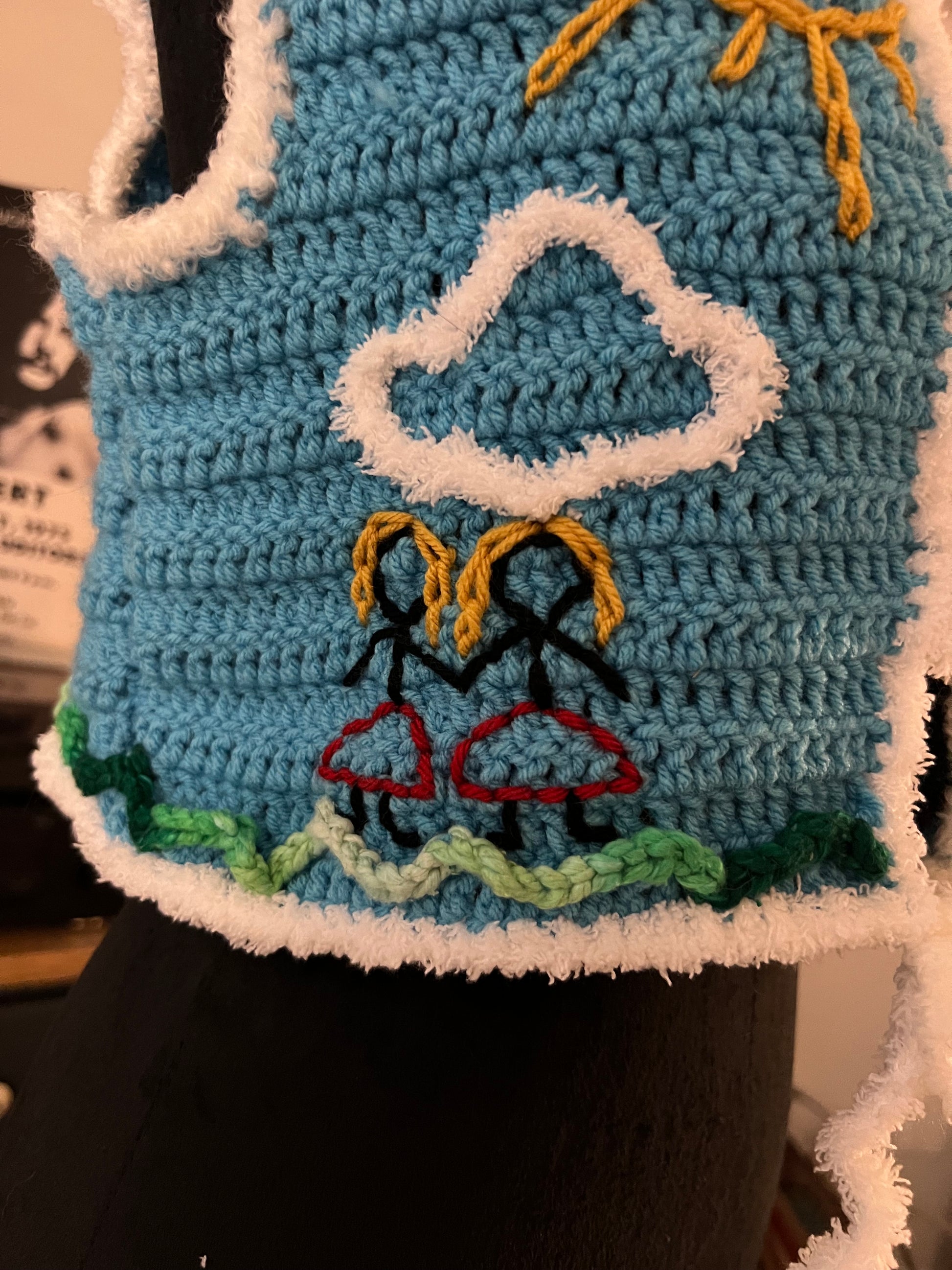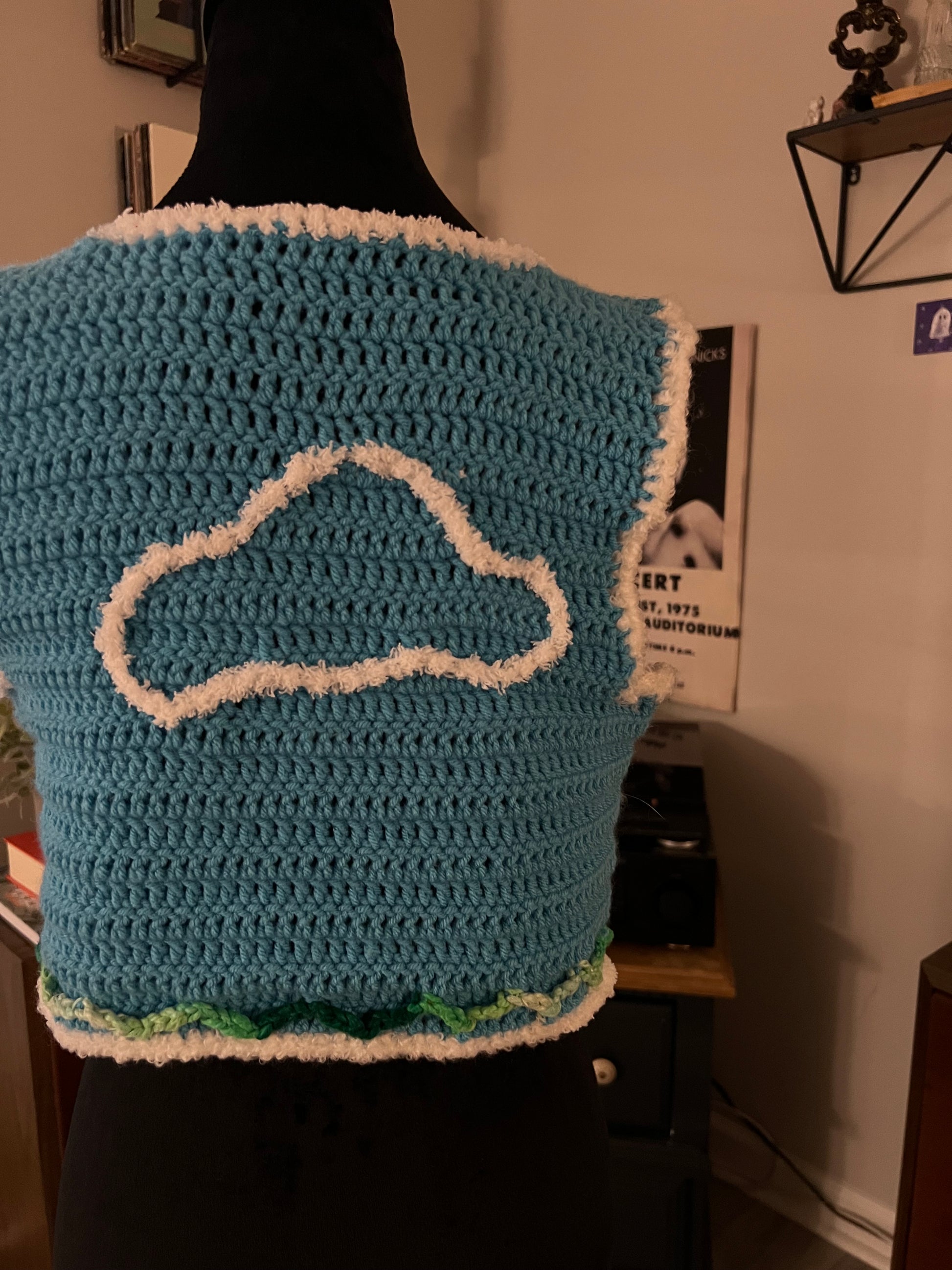 i made this blue vest with the idea of a kids crayon drawing. in those drawings, the skies tend to always be blue and the sun is always shining, with fluffy white clouds floating past. i hope this vest brings you the childlike joy that it brought me as i made it. the vest is crocheted and the drawing details are surface crocheted and hand embroidered.