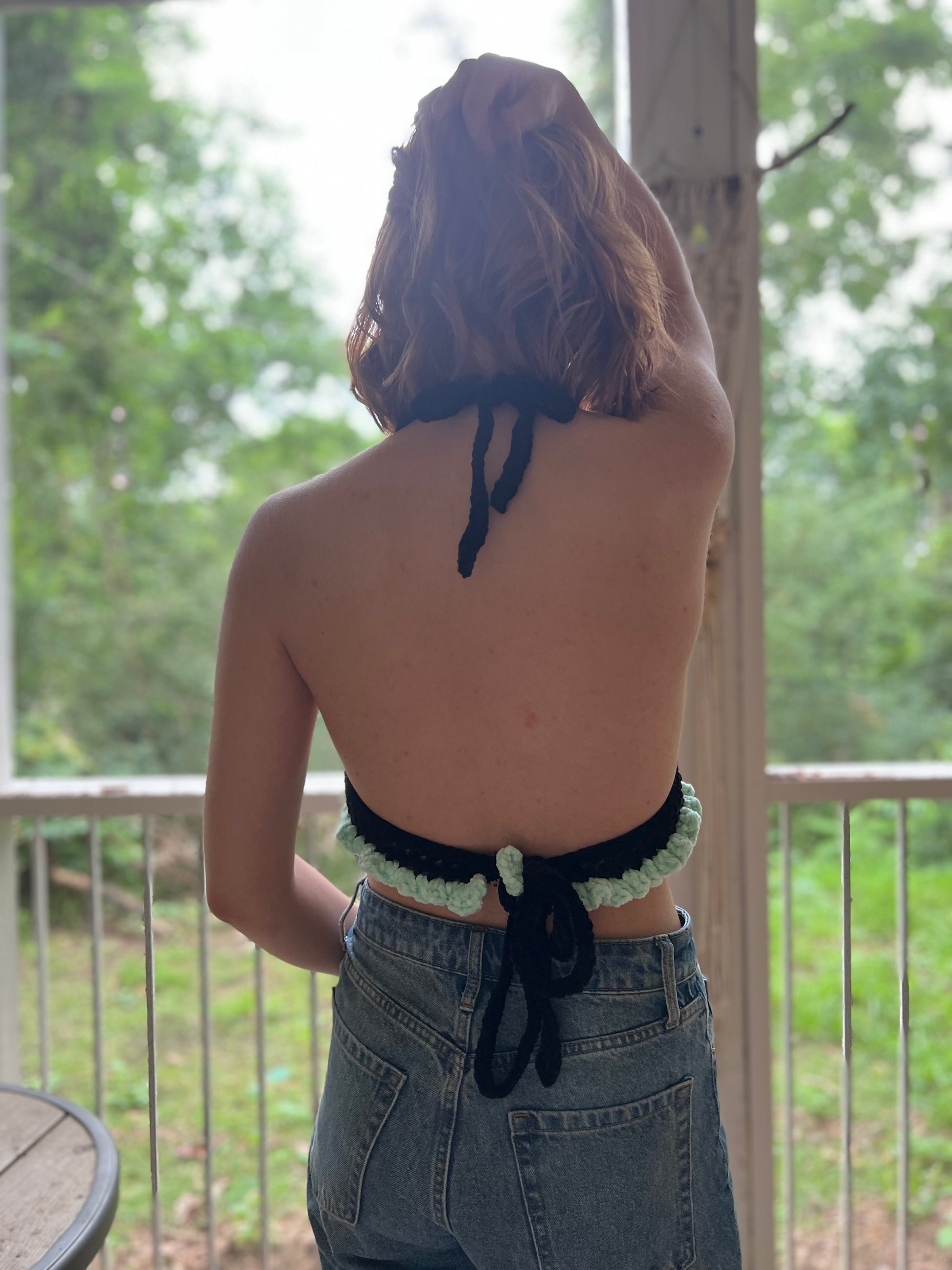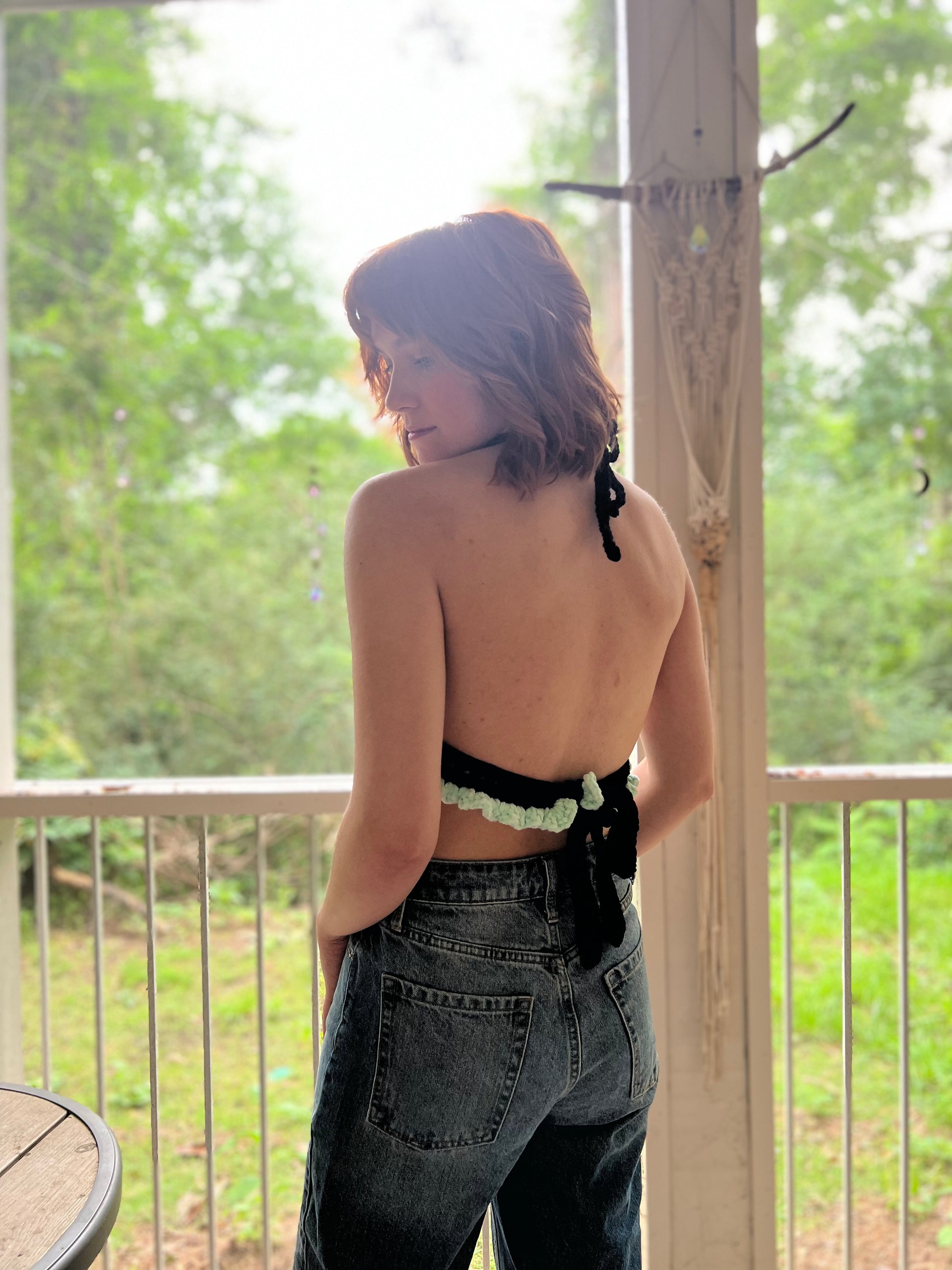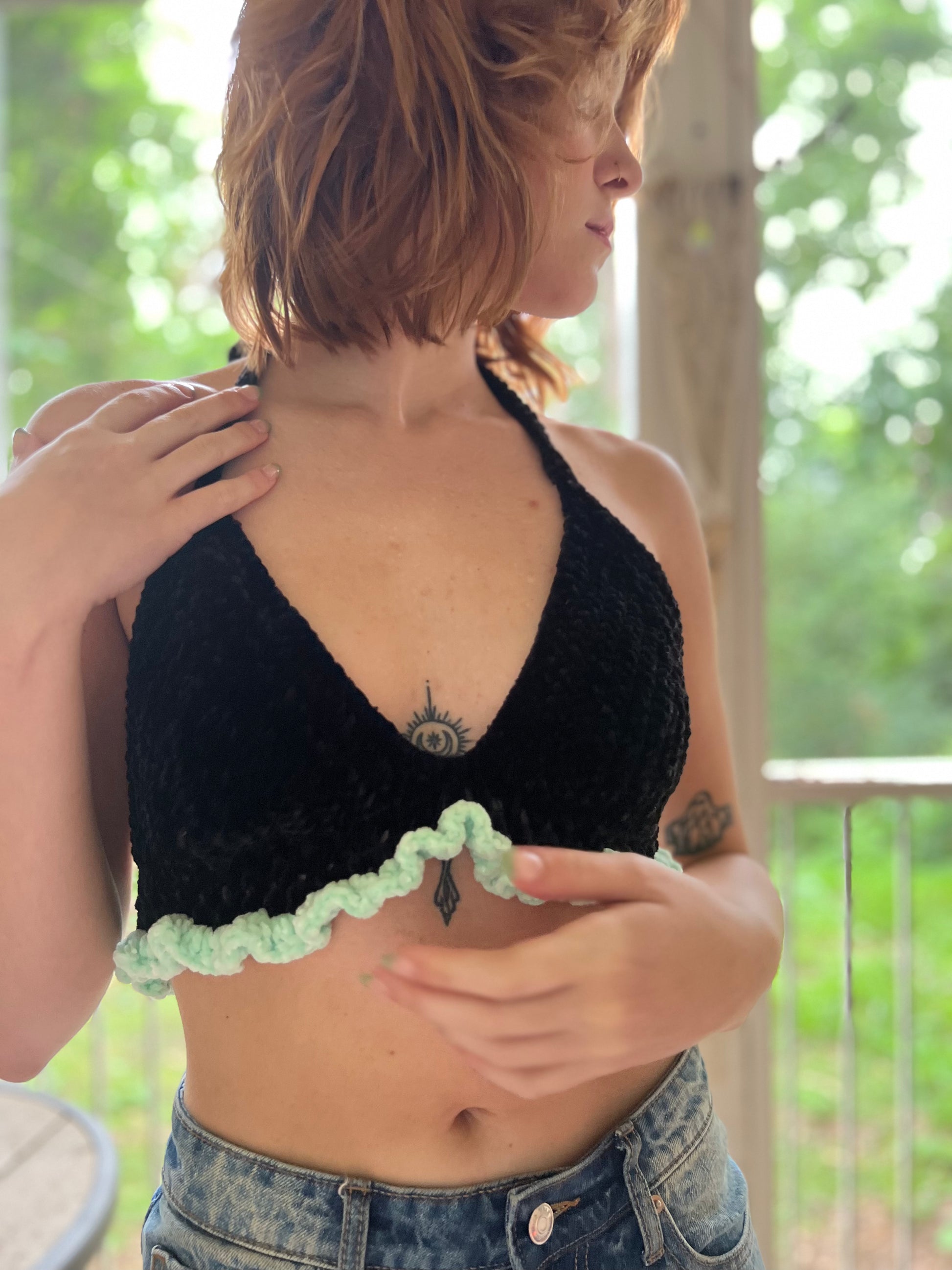 The Lettuce Lover Crop Top is a soft, velvety triangle top that is both adjustable and versatile. Perfect for festivals or a night out, this crocheted top offers comfort and style in one. Stay cool and stylish with this must-have addition to your wardrobe.