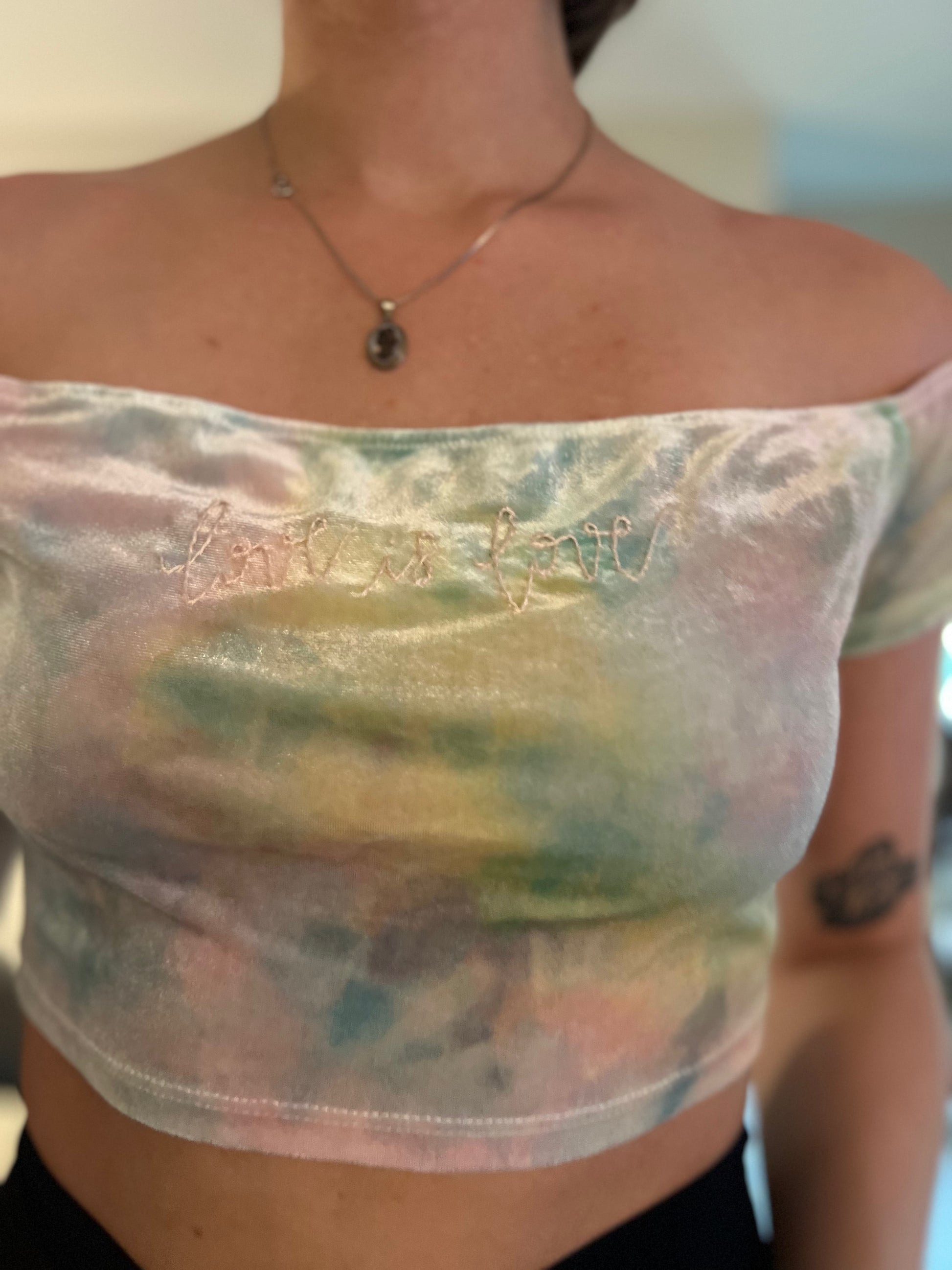 Celebrate Pride with our Love is Love Crop Top! Featuring hand-embroidered cursive stitching on a soft, velvety fabric. This pale rainbow, off-the-shoulder style is perfect for Pride month and beyond. Spread love and joy with this playful and stylish crop top.