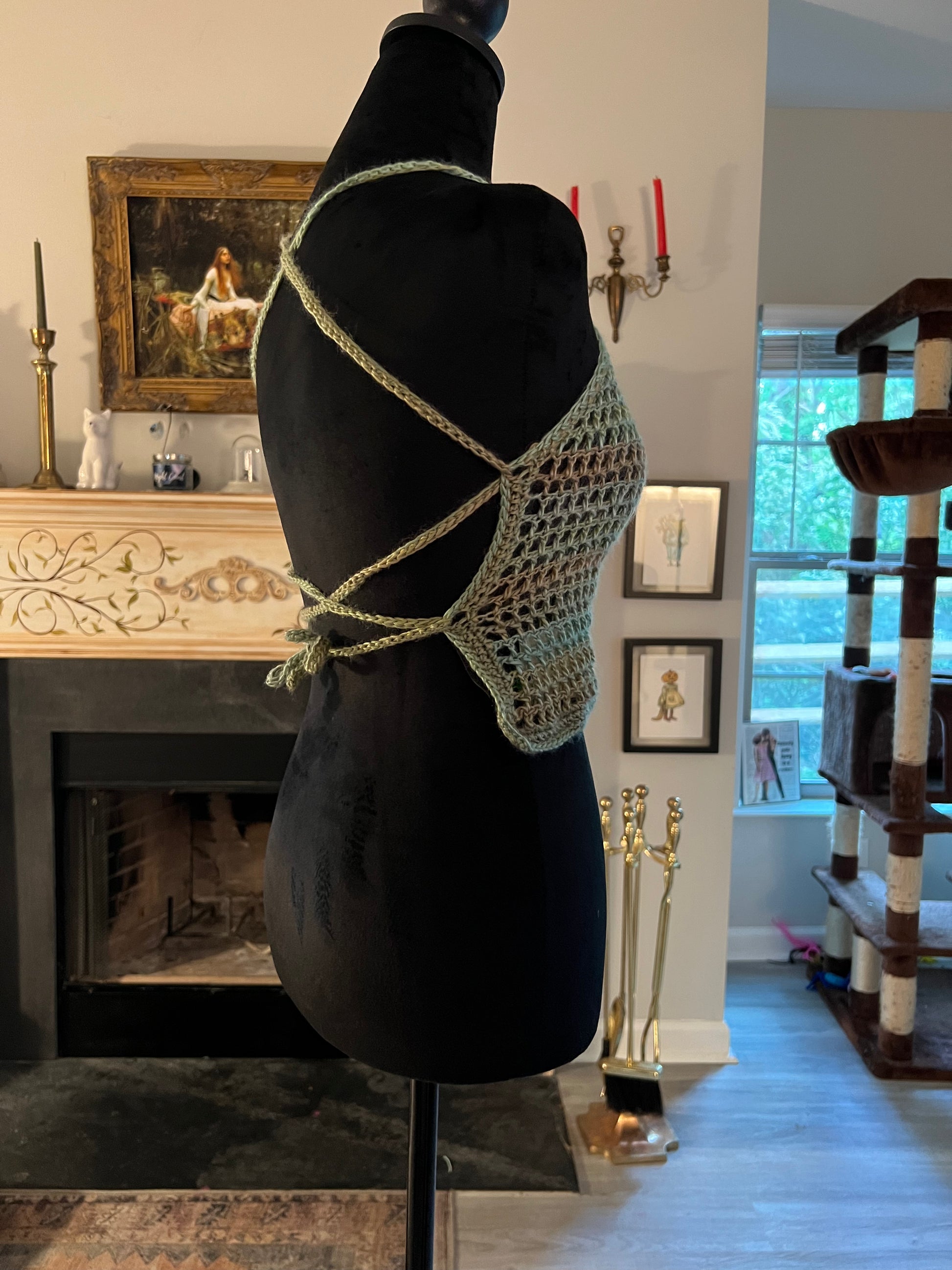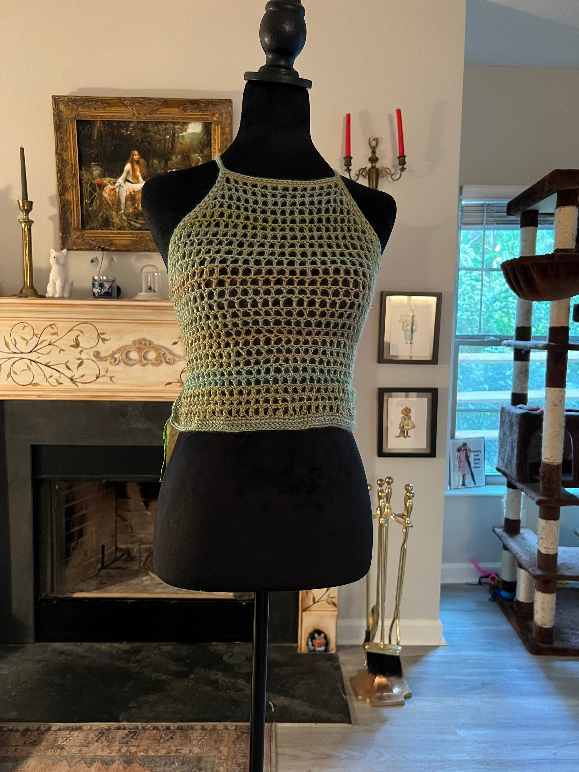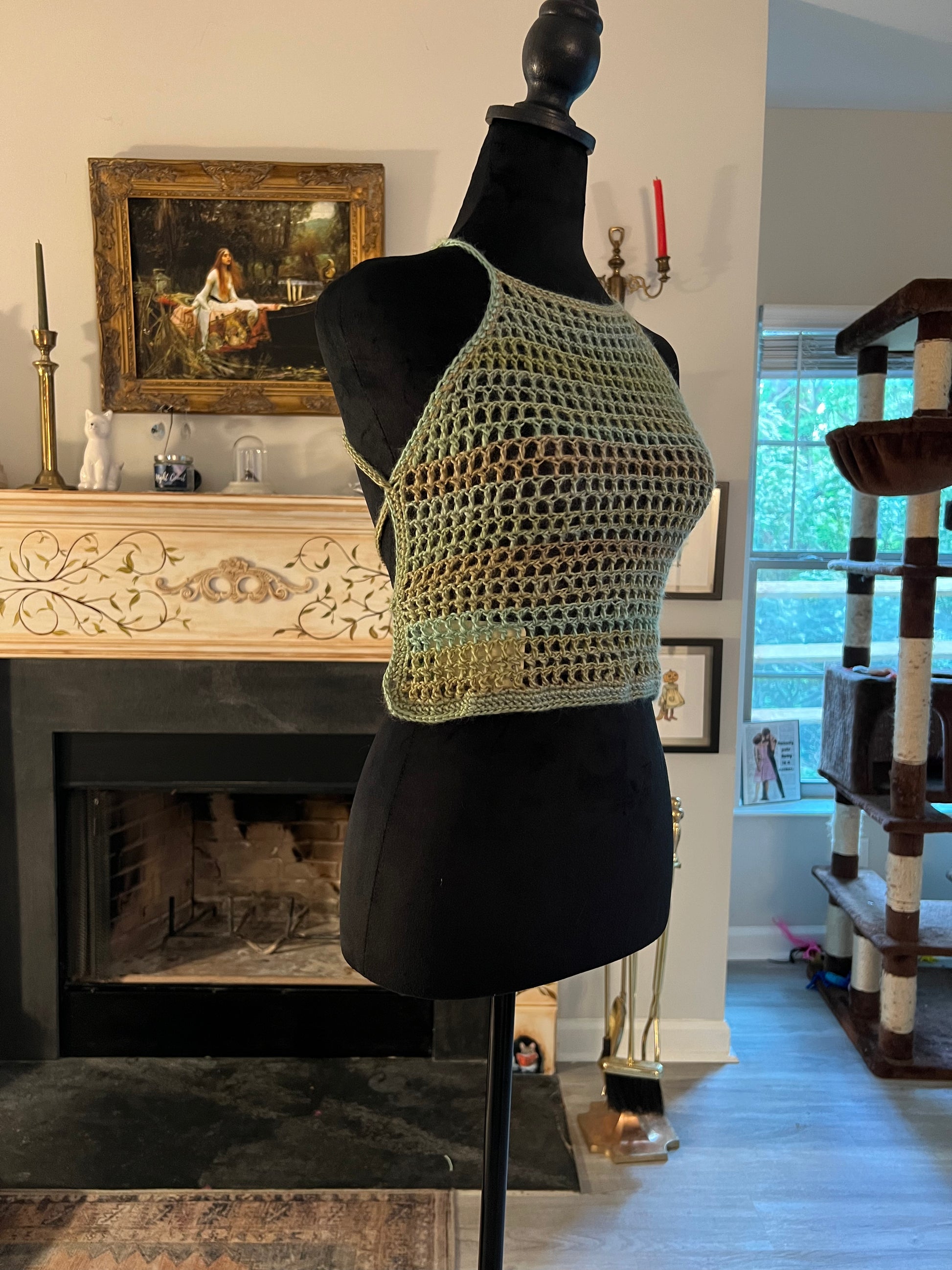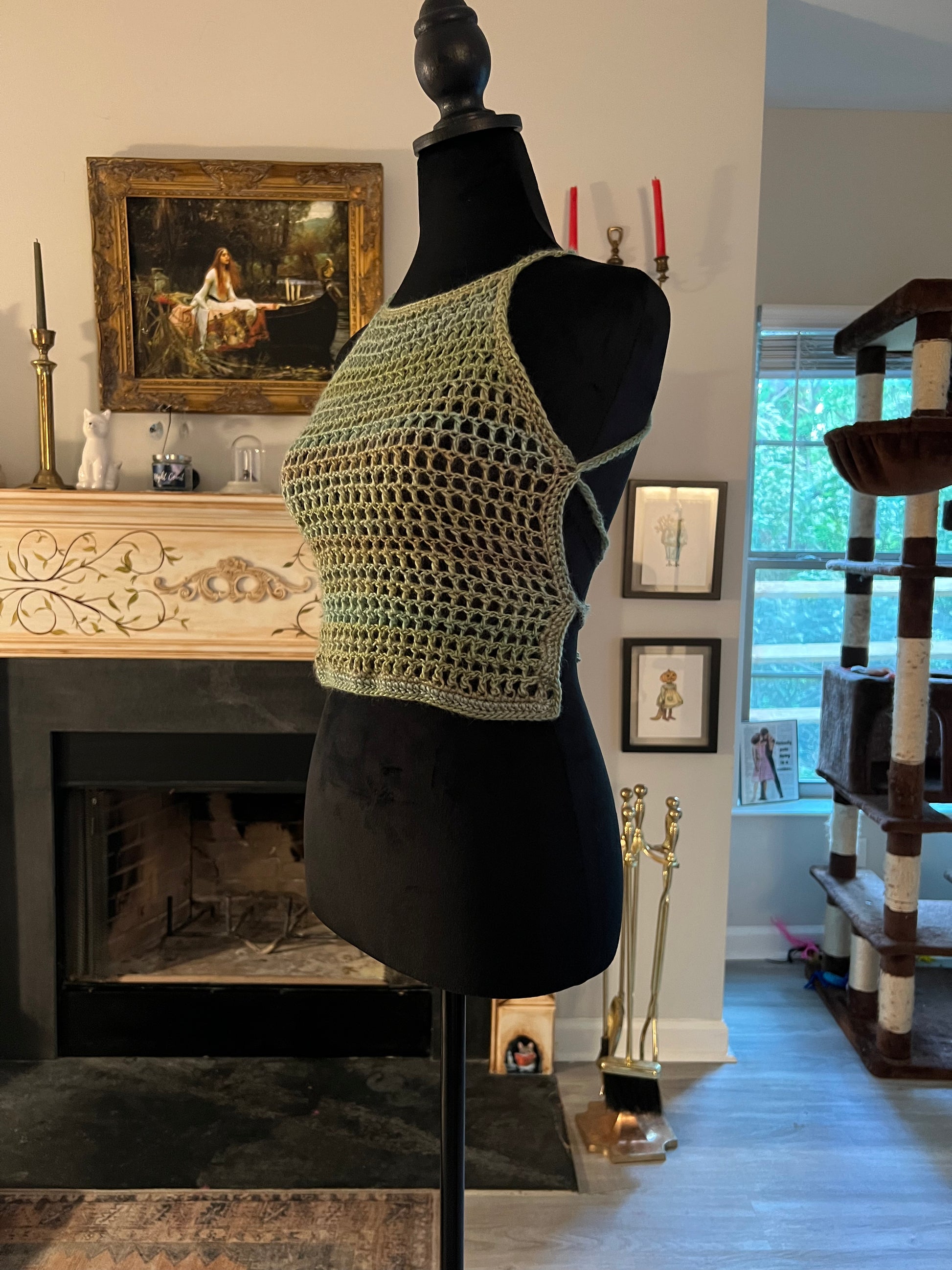 The pattern used was "It's Summer Mesh Halter" by ArtsyMaki on Etsy.