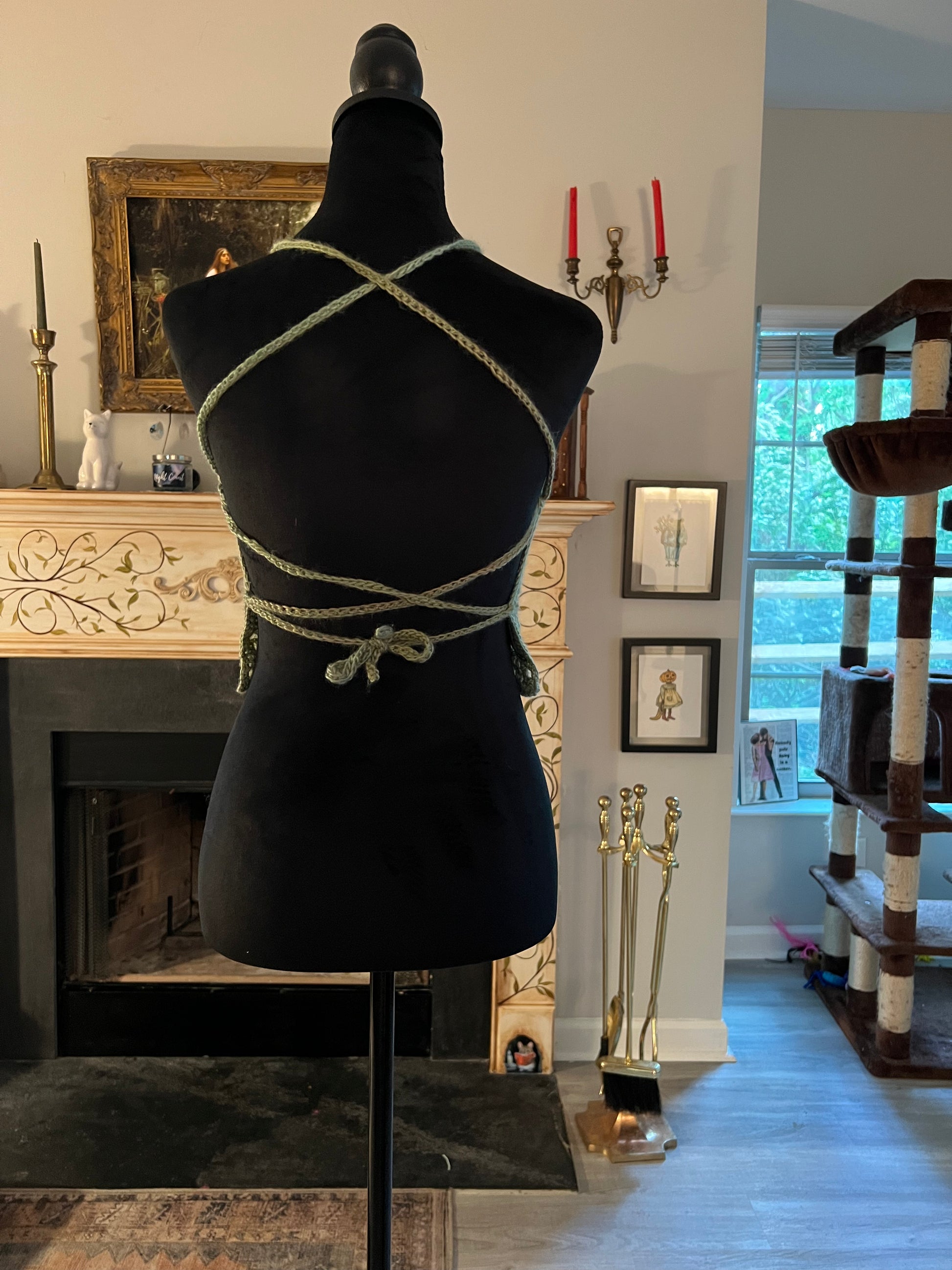 Expertly crafted from a soft wool yarn, this green crocheted corset top features a lightweight mesh design that can be worn year-round with ease. Its versatile fit is ideal for those who wear a size XS.