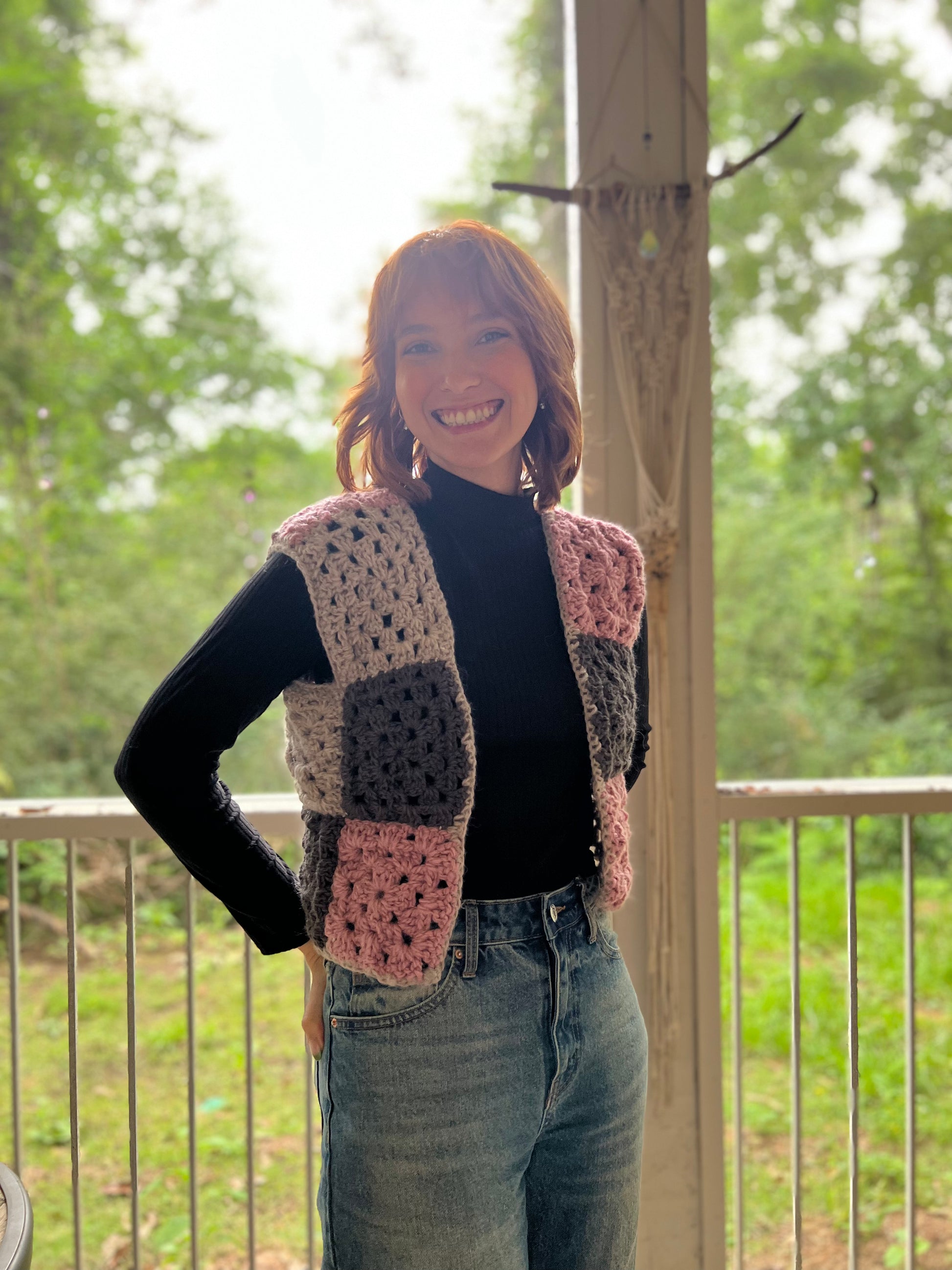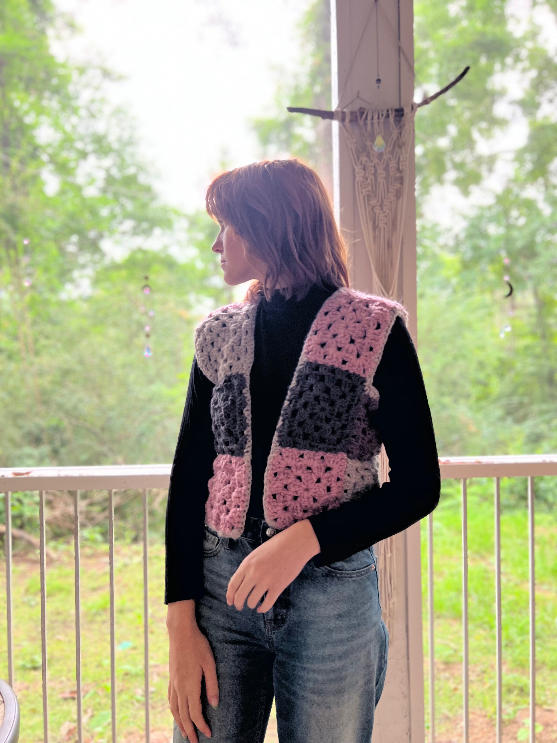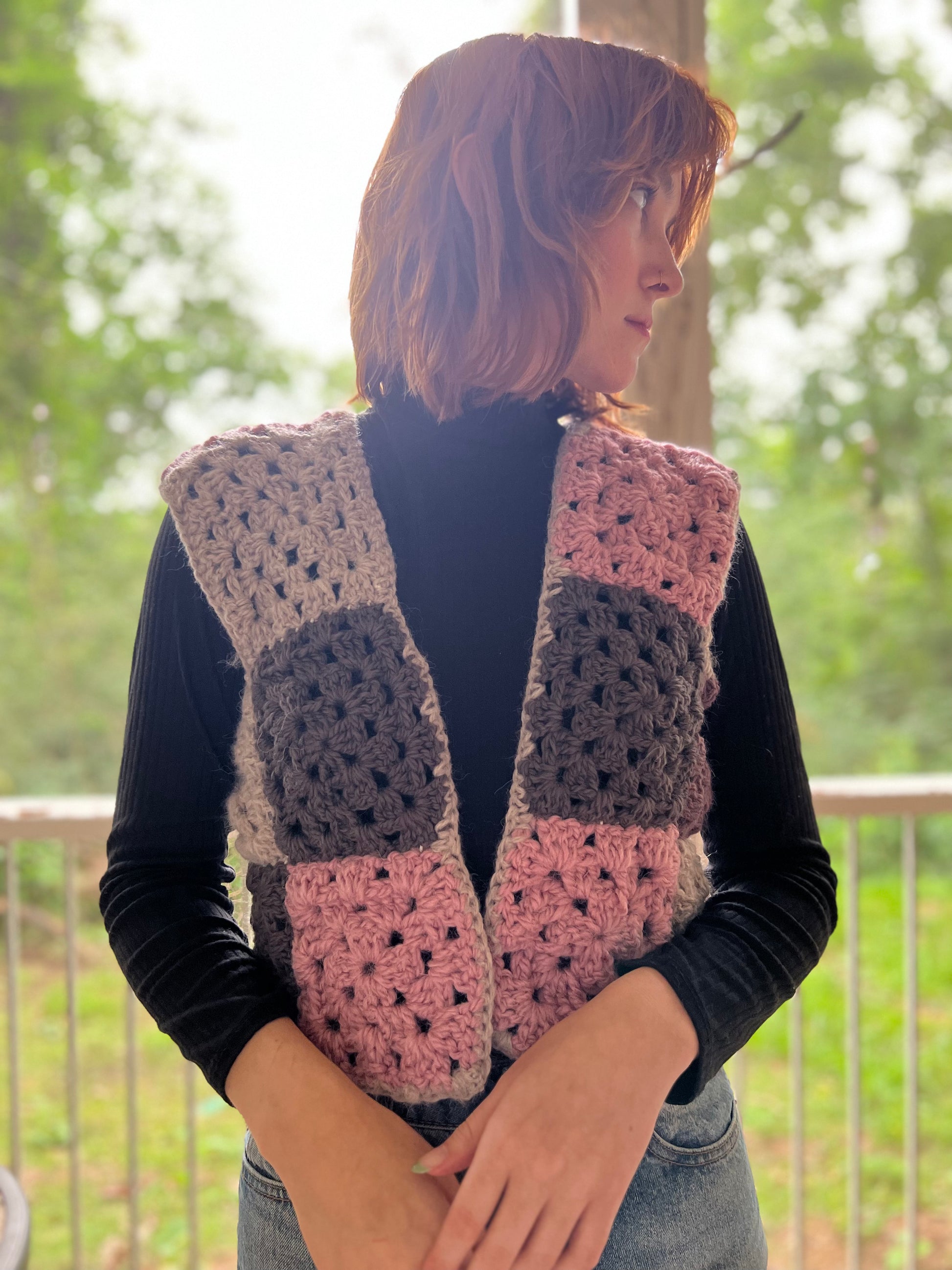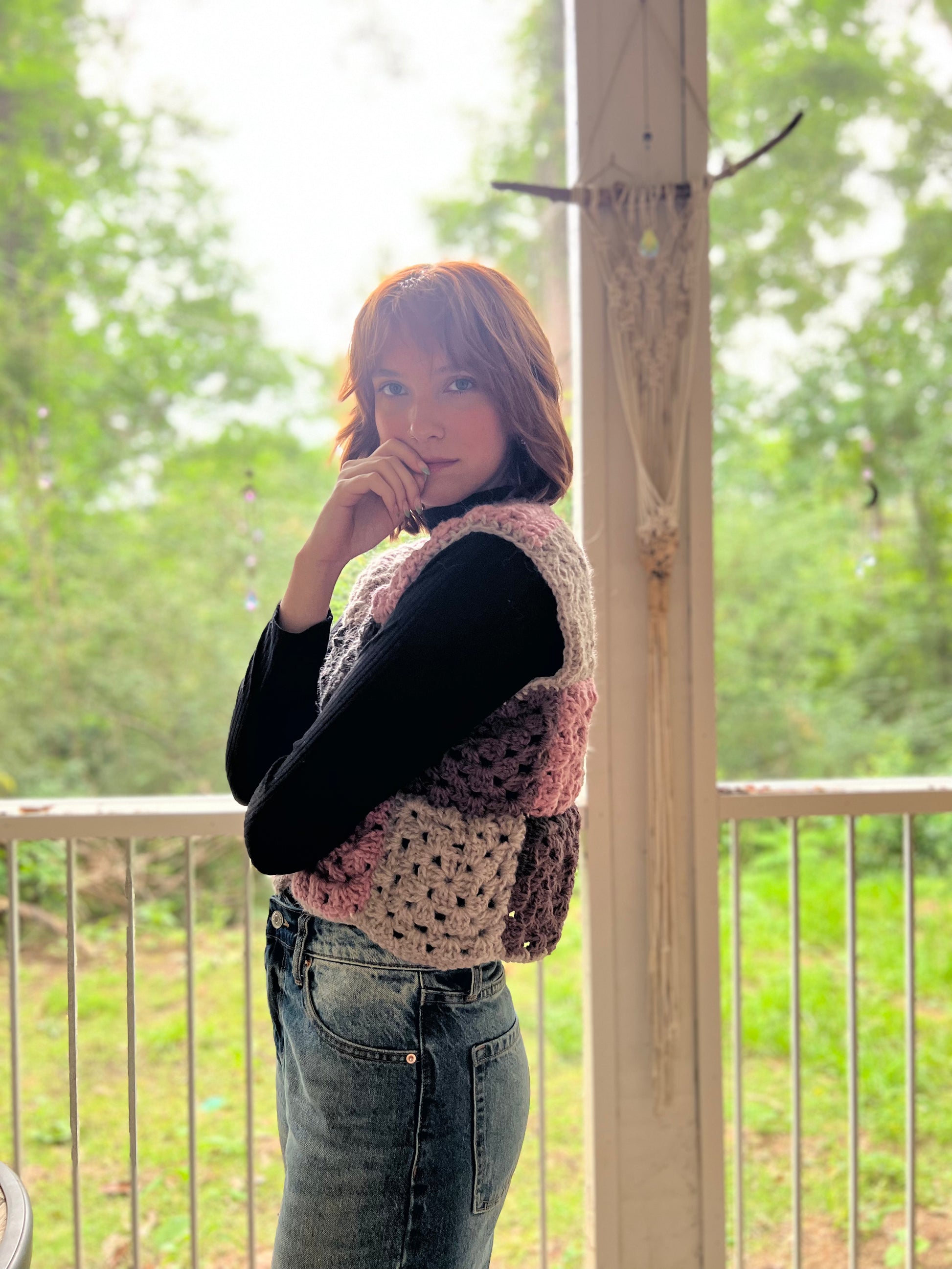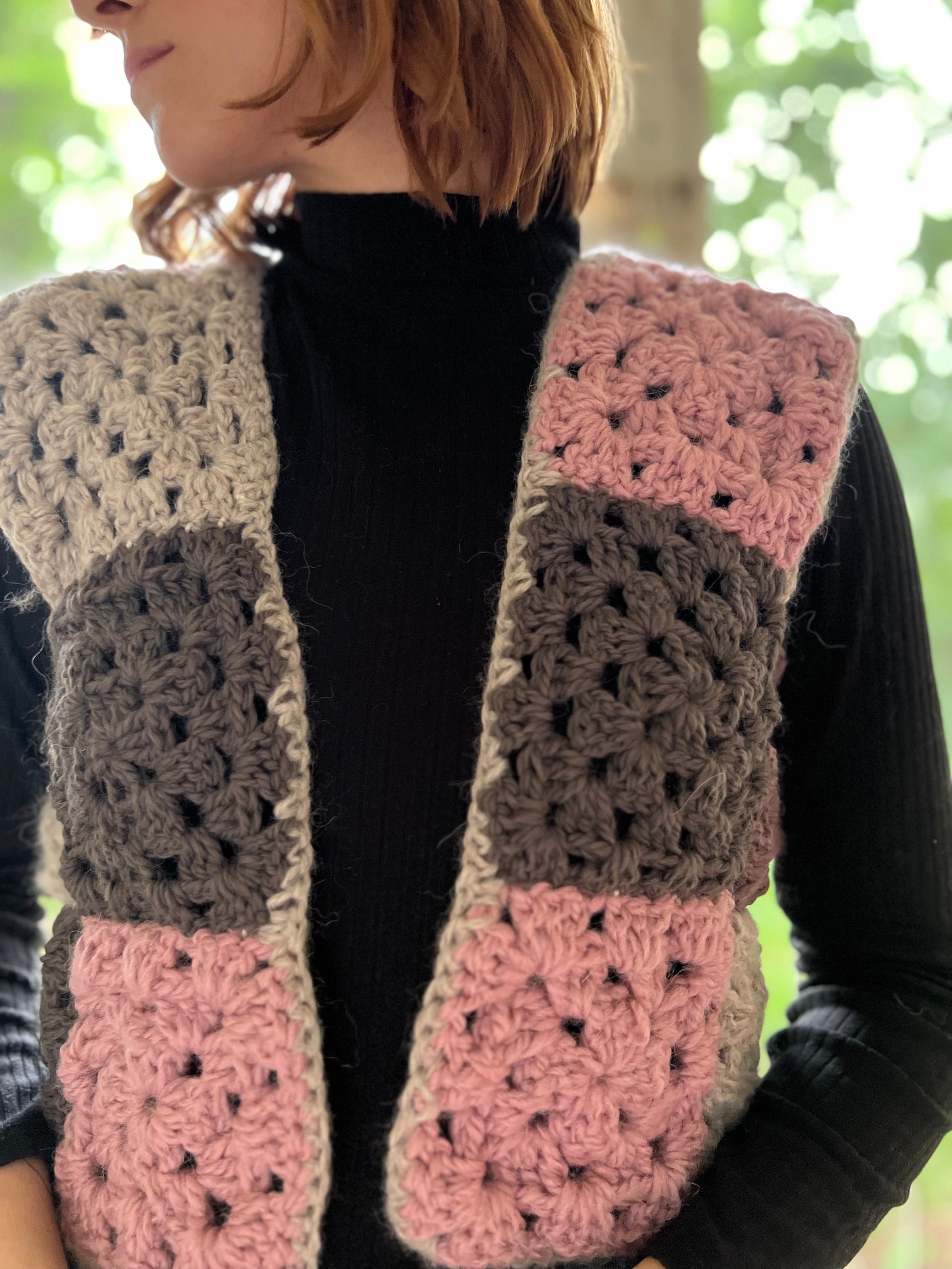 Stay warm and comfortable in our Neapolitan Granny Square Vest. Made with soft wool material and crocheted with care, this vest is perfect for layering in colder weather. In gorgeous pink, brown, and white colors reminiscent of Neapolitan ice cream, you'll look stylish and feel cozy all day long.