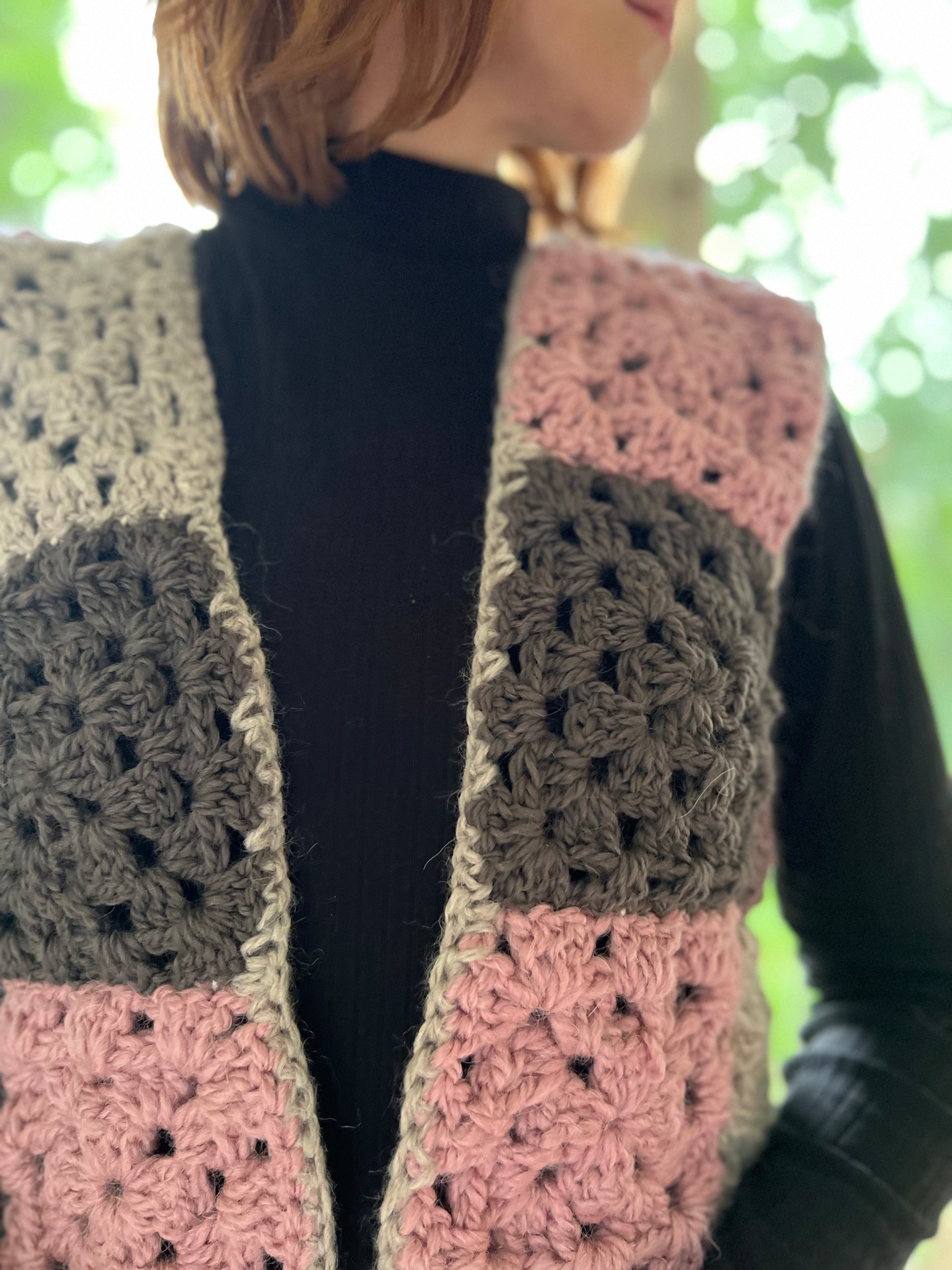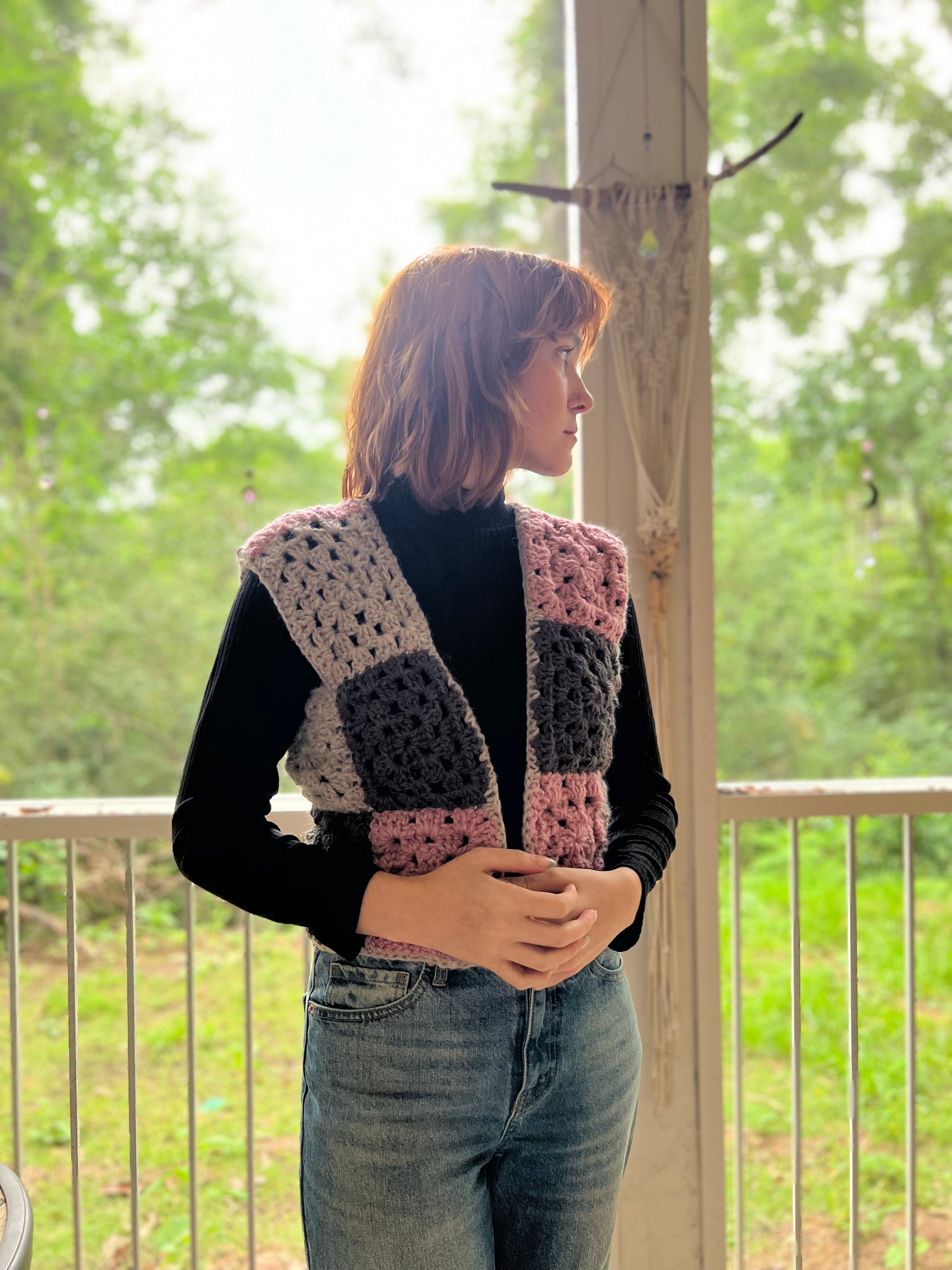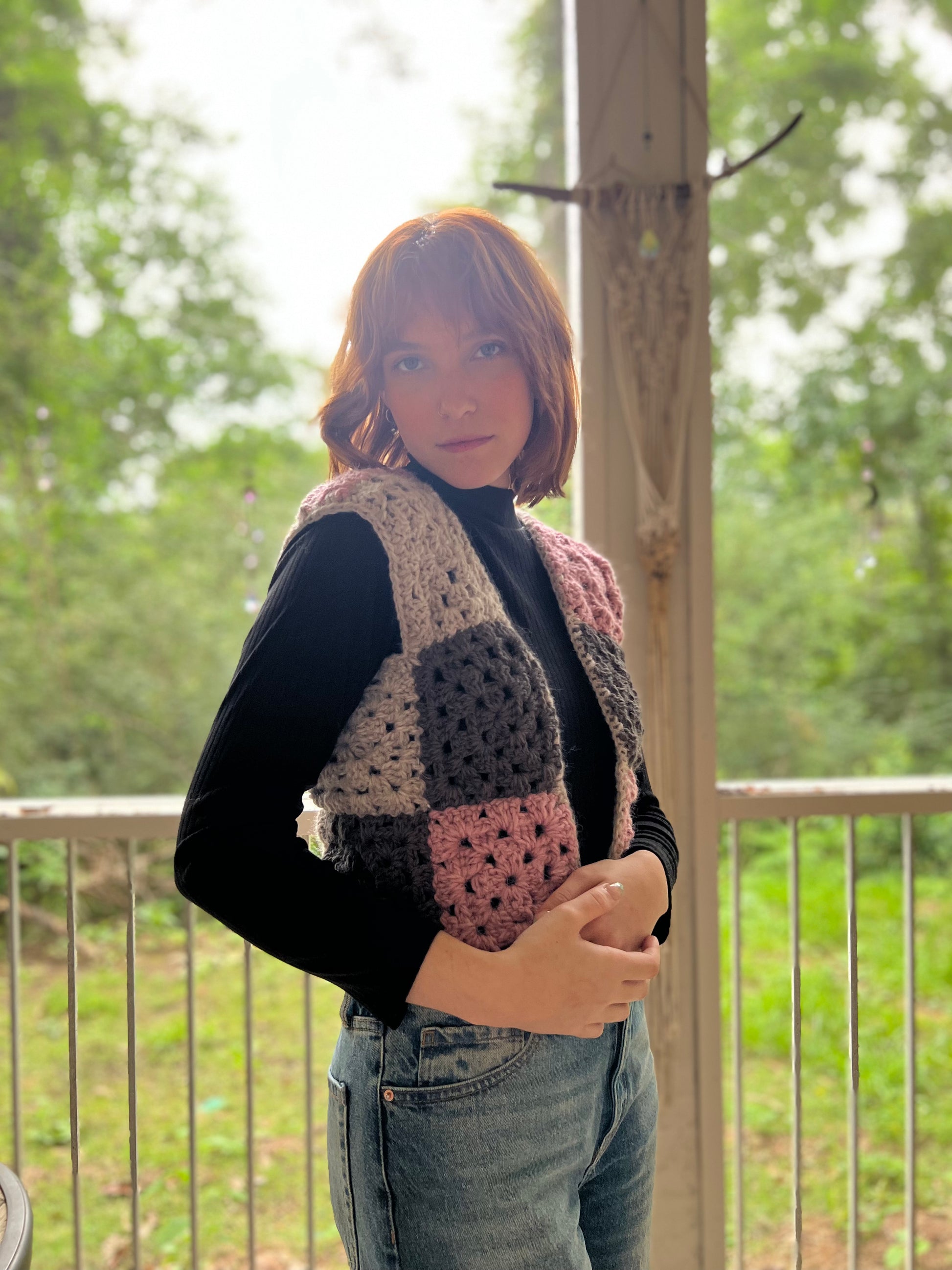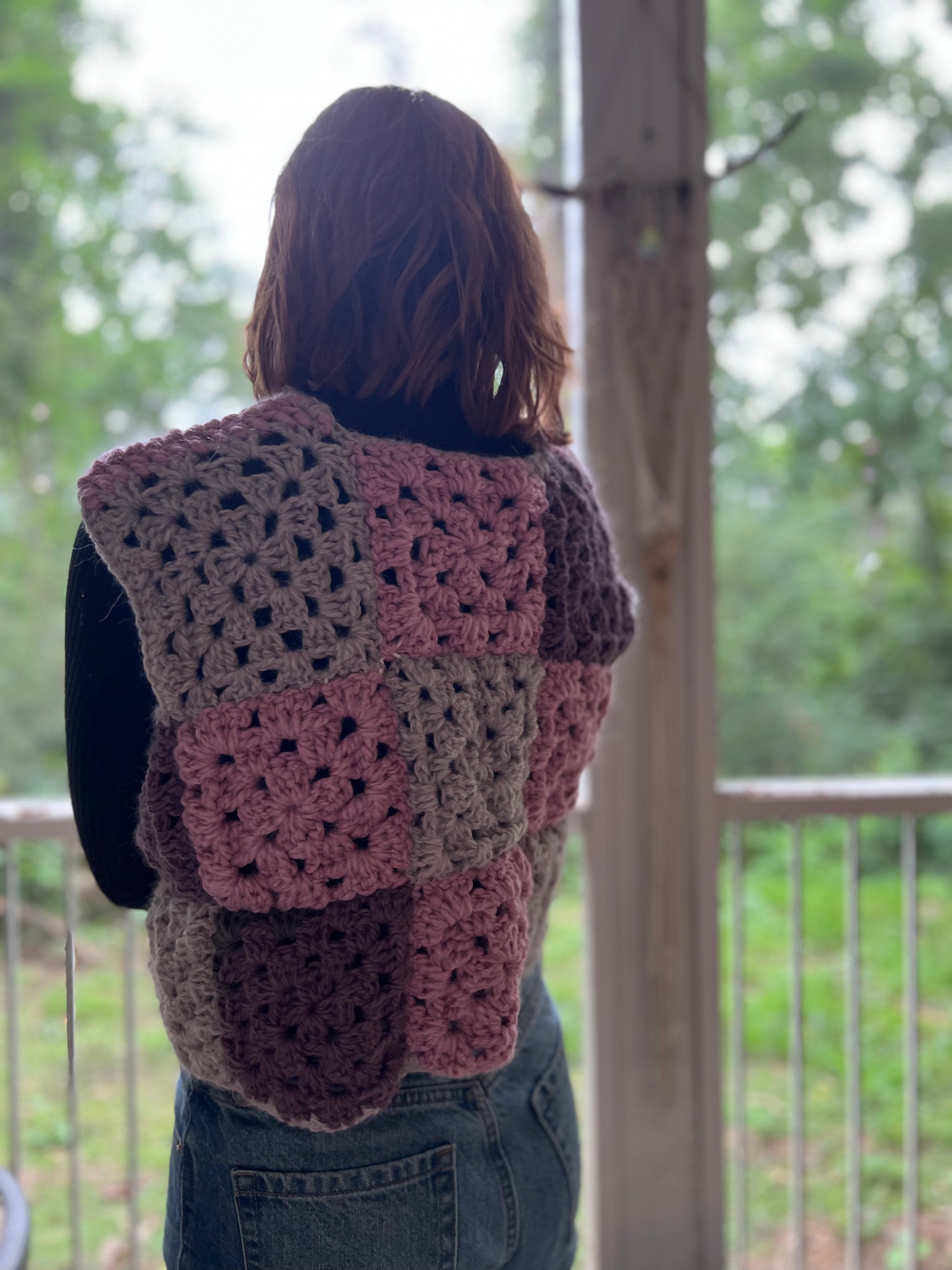 Stay warm and comfortable in our Neapolitan Granny Square Vest. Made with soft wool material and crocheted with care, this vest is perfect for layering in colder weather. In gorgeous pink, brown, and white colors reminiscent of Neapolitan ice cream, you'll look stylish and feel cozy all day long.