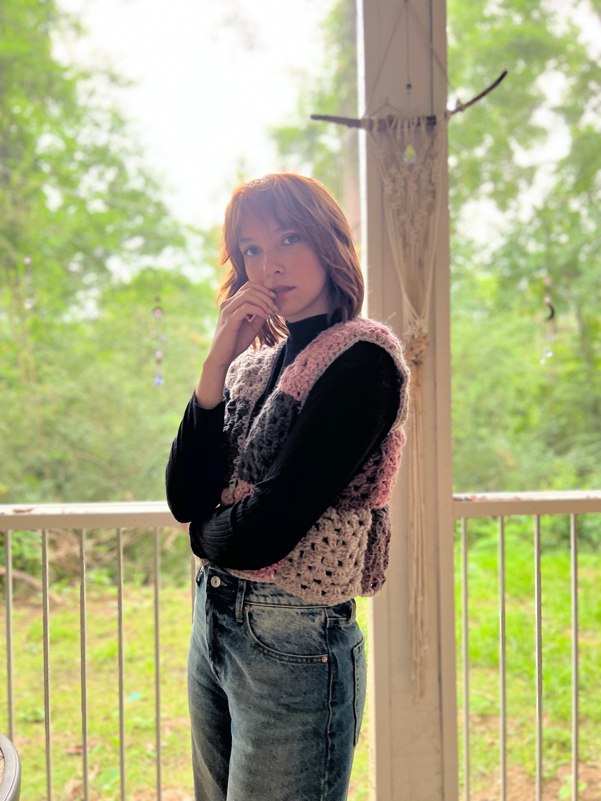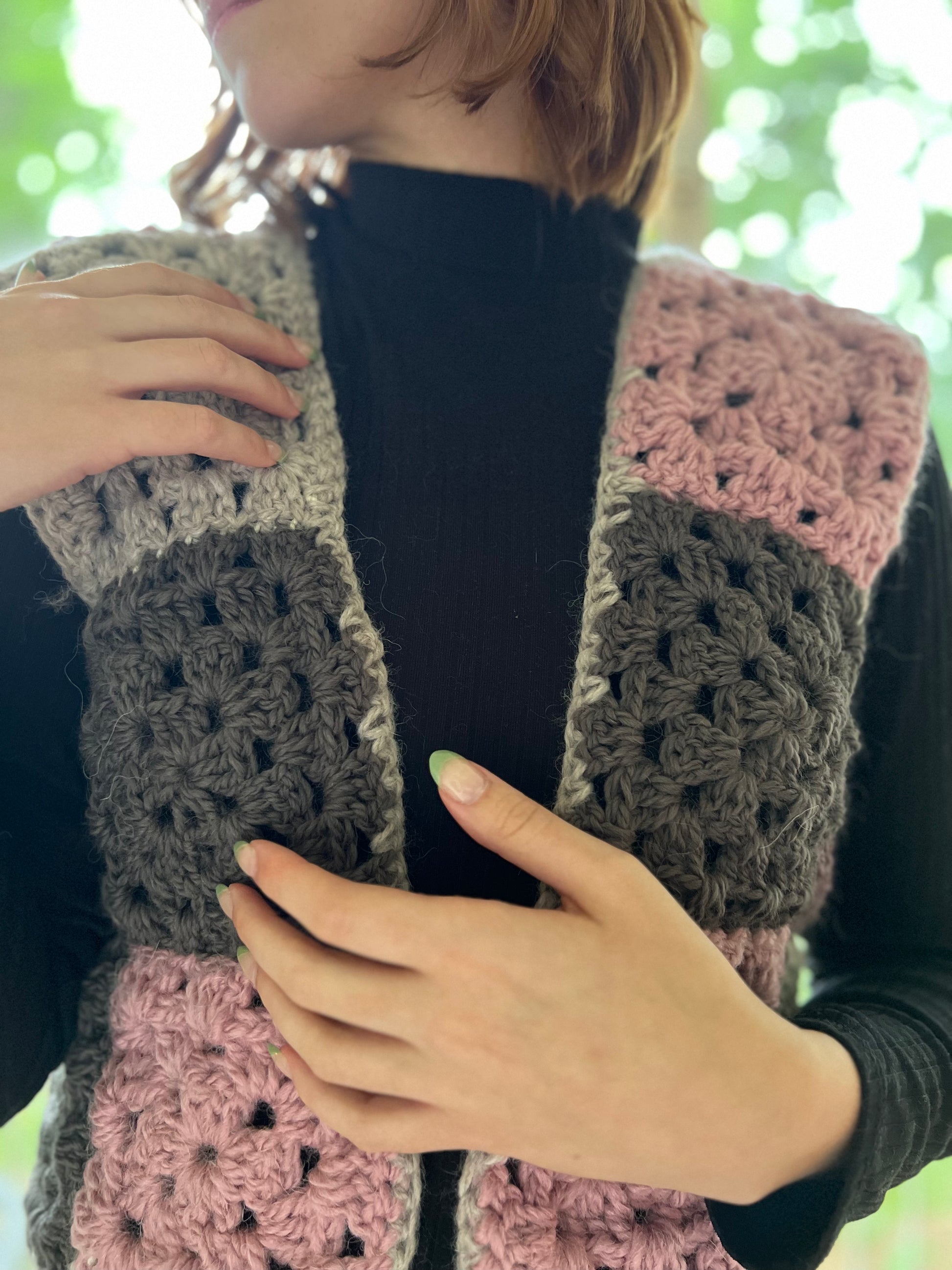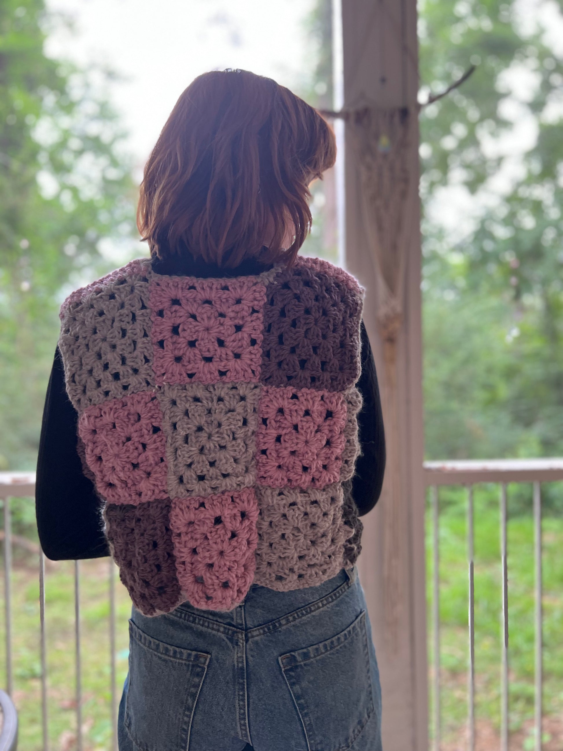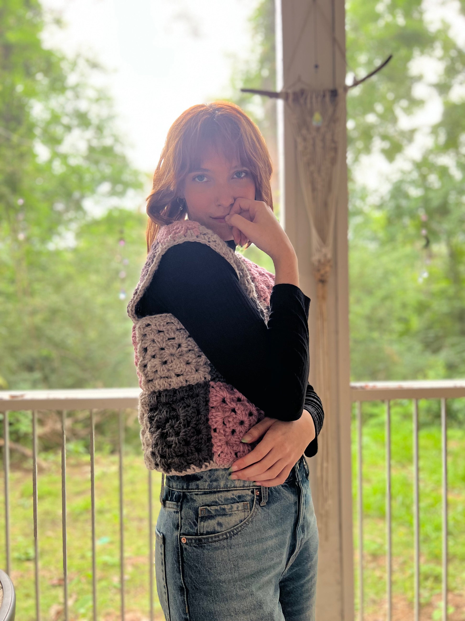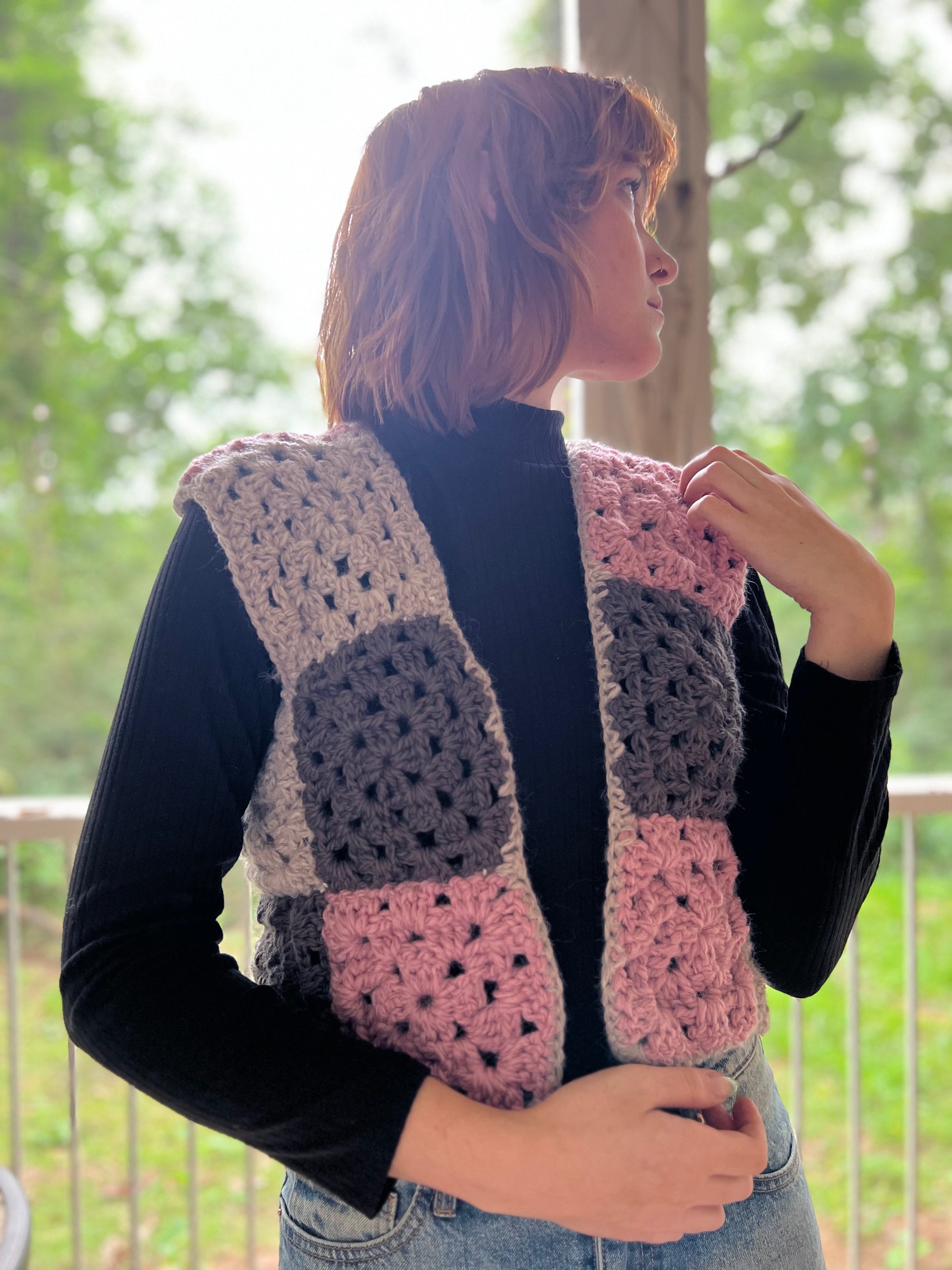 Stay warm and comfortable in our Neapolitan Granny Square Vest. Made with soft wool material and crocheted with care, this vest is perfect for layering in colder weather. In gorgeous pink, brown, and white colors reminiscent of Neapolitan ice cream, you'll look stylish and feel cozy all day long.
