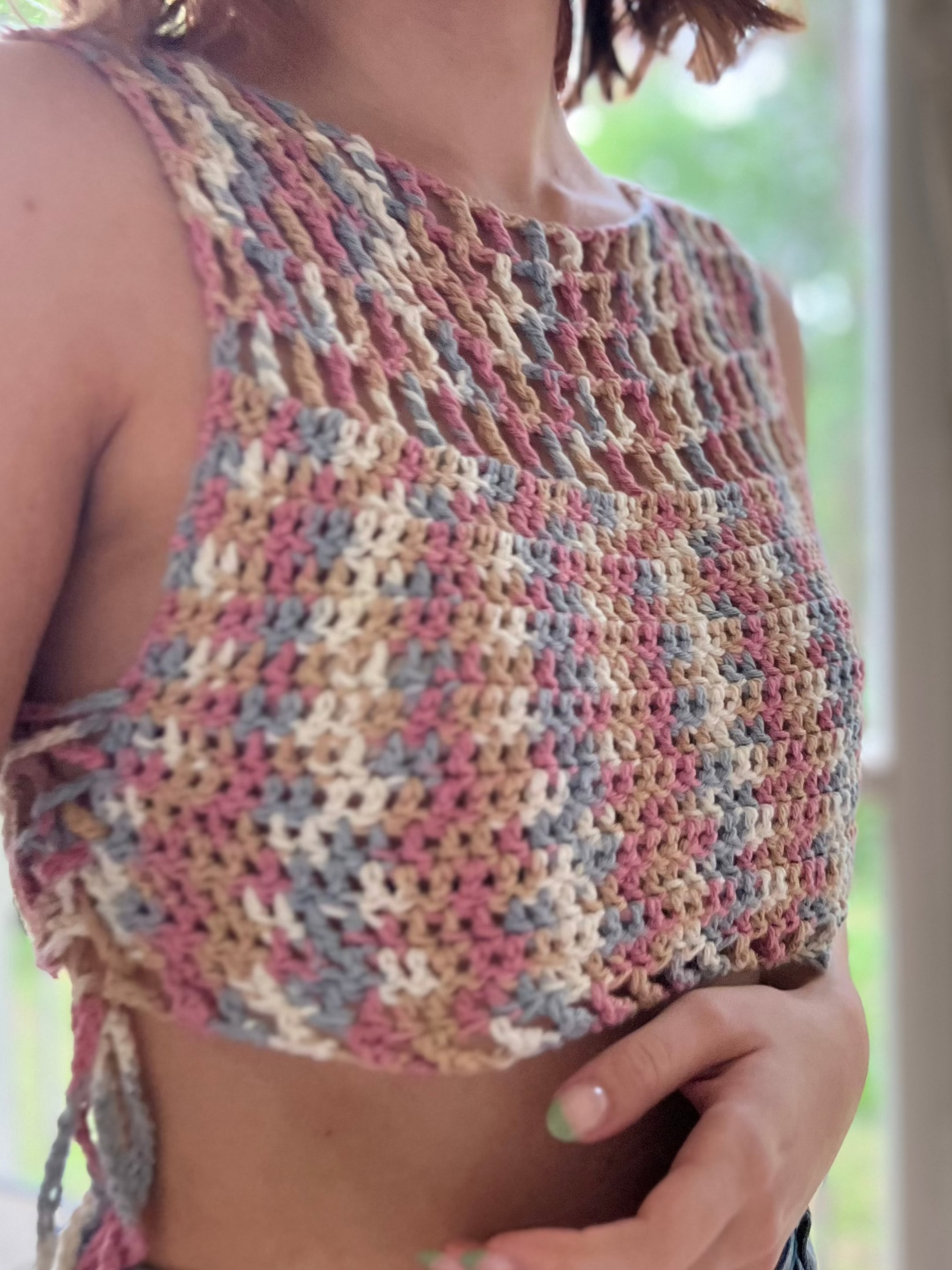 Stay cool and stylish this summer with the Pink & Blue Crop Top. Loosely crocheted and with adjustable corset sides, this top is perfect for any summer occasion. The muted colors are perfect for any outing. With a solid panel in front, this top offers both style and coverage. Upgrade your summer wardrobe with the Pink & Blue Crop Top