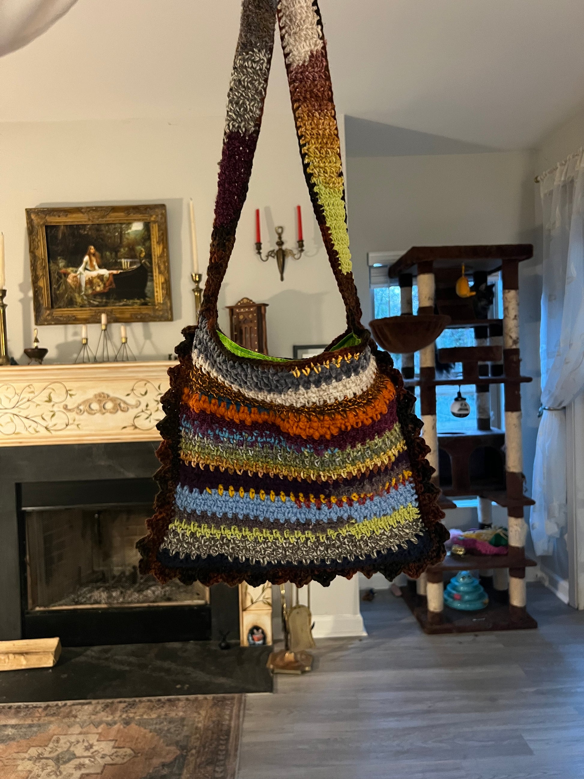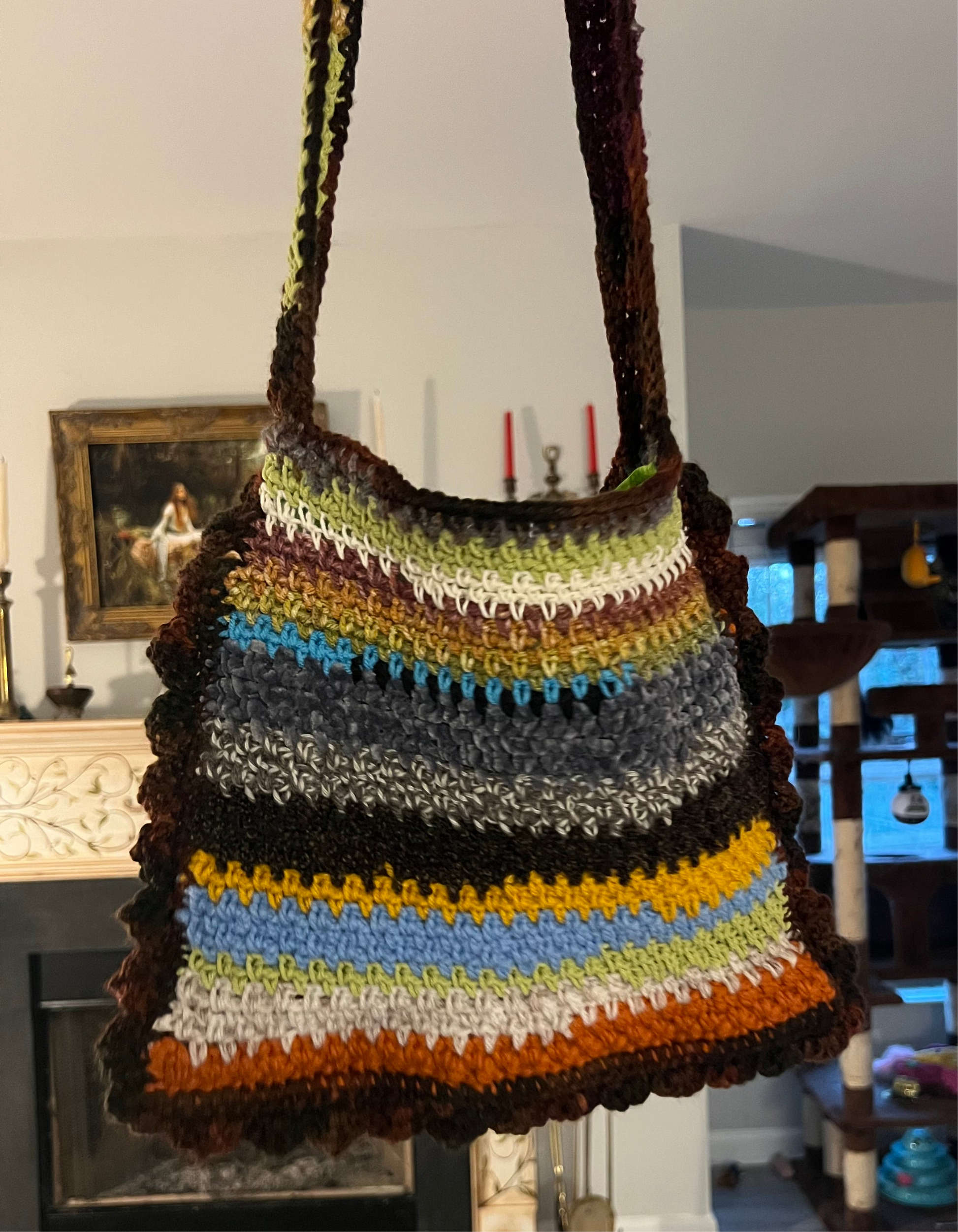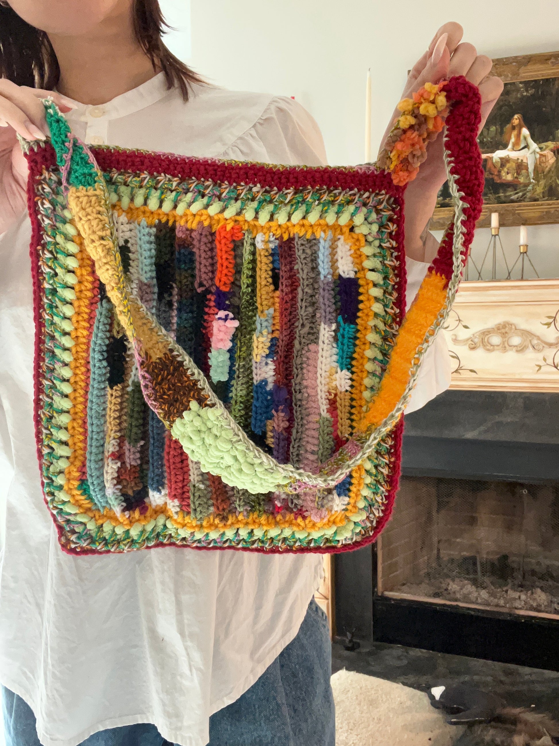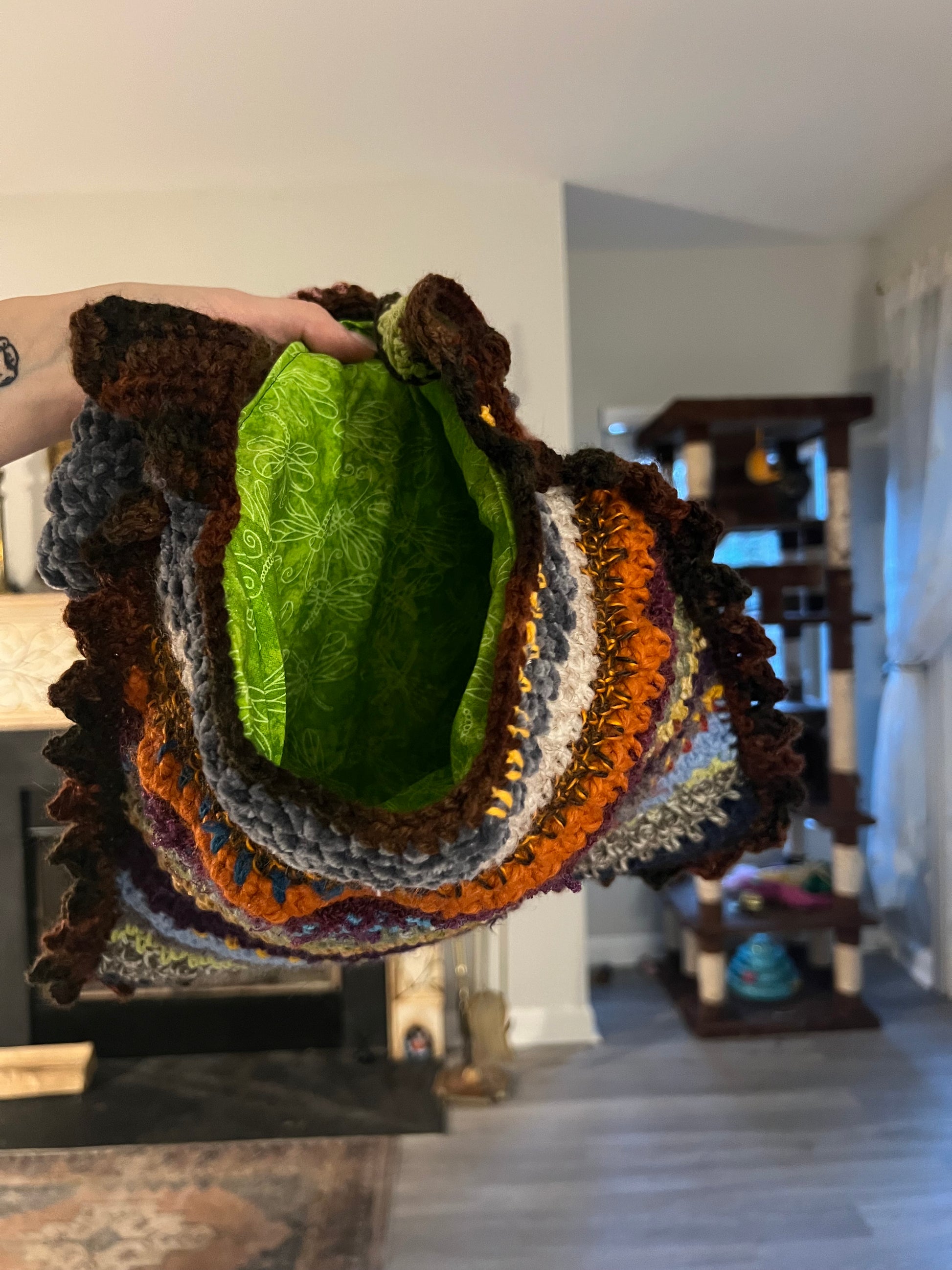 Remember how my bio says I try to make things as sustainably as possible? This bag, (like the Scrappy Beanies!), is a by-product of that endeavor. Unavoidably, every time I finish a project I have a tiny amount of yarn left that’s just enough to not want to throw away (that shit can be expensive!) but not enough for another full pattern. So I keep all the scraps in a little basket and when it starts looking full enough, a new tote or beanie is born! Each one is unique! The front and back is completely different and can be reversed! The texture is all over the place! It’s lined with, (thrifted), fabric! It’s fun! And it’s keeping yarn out of landfills! Yay!