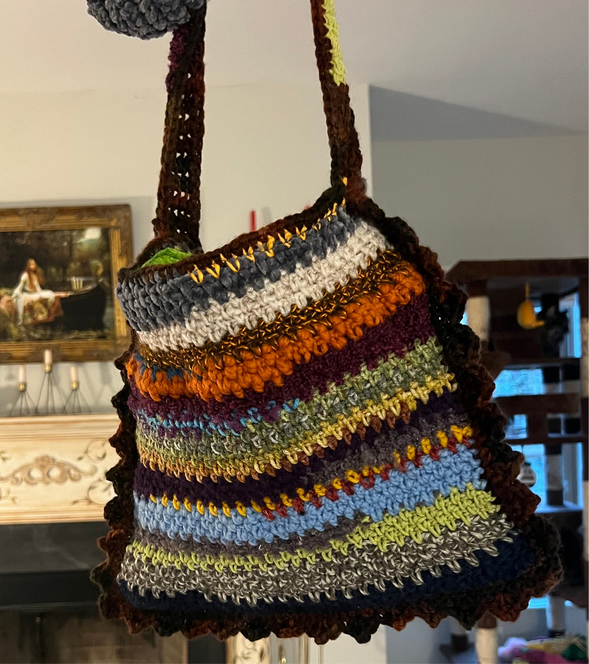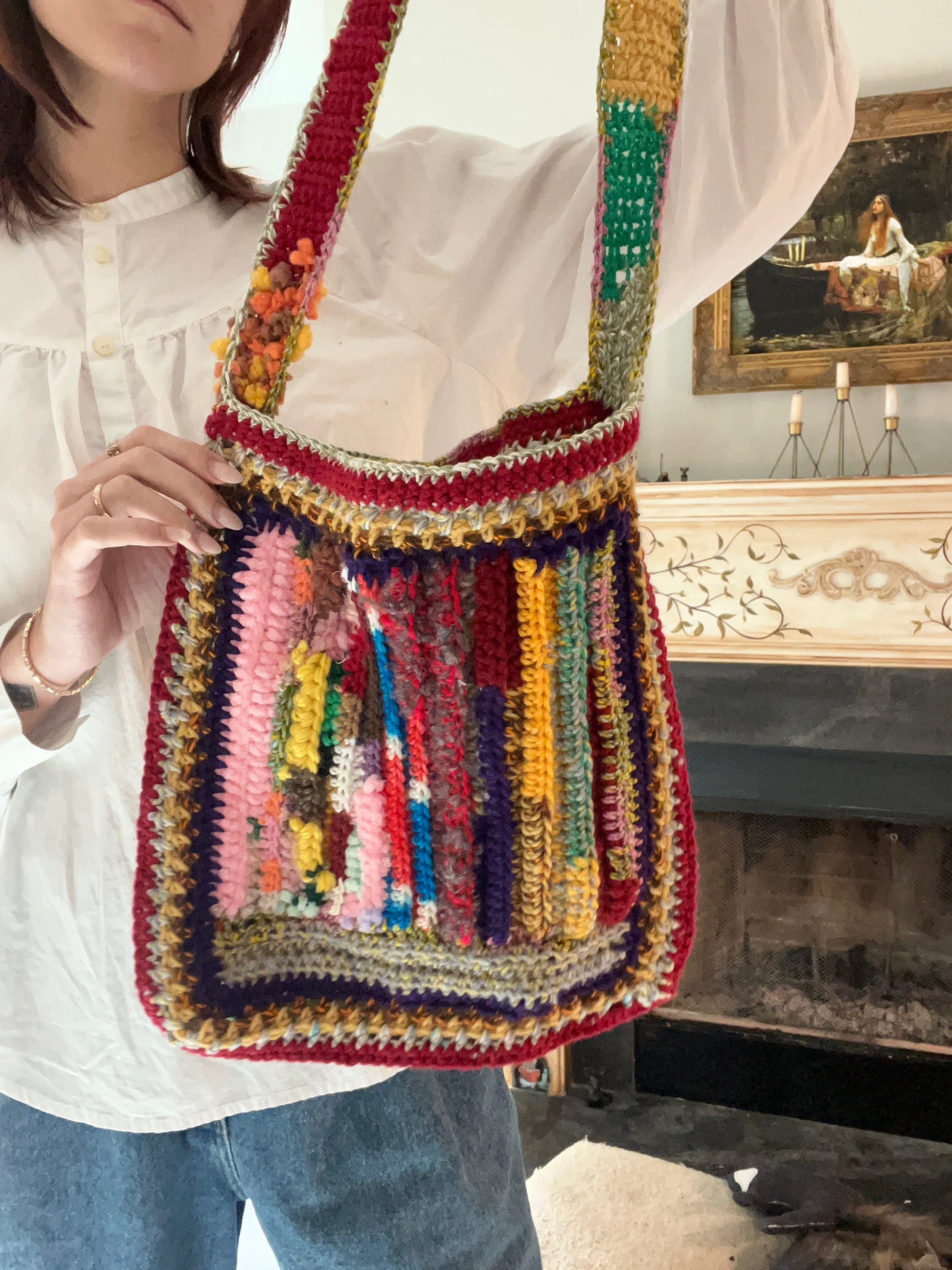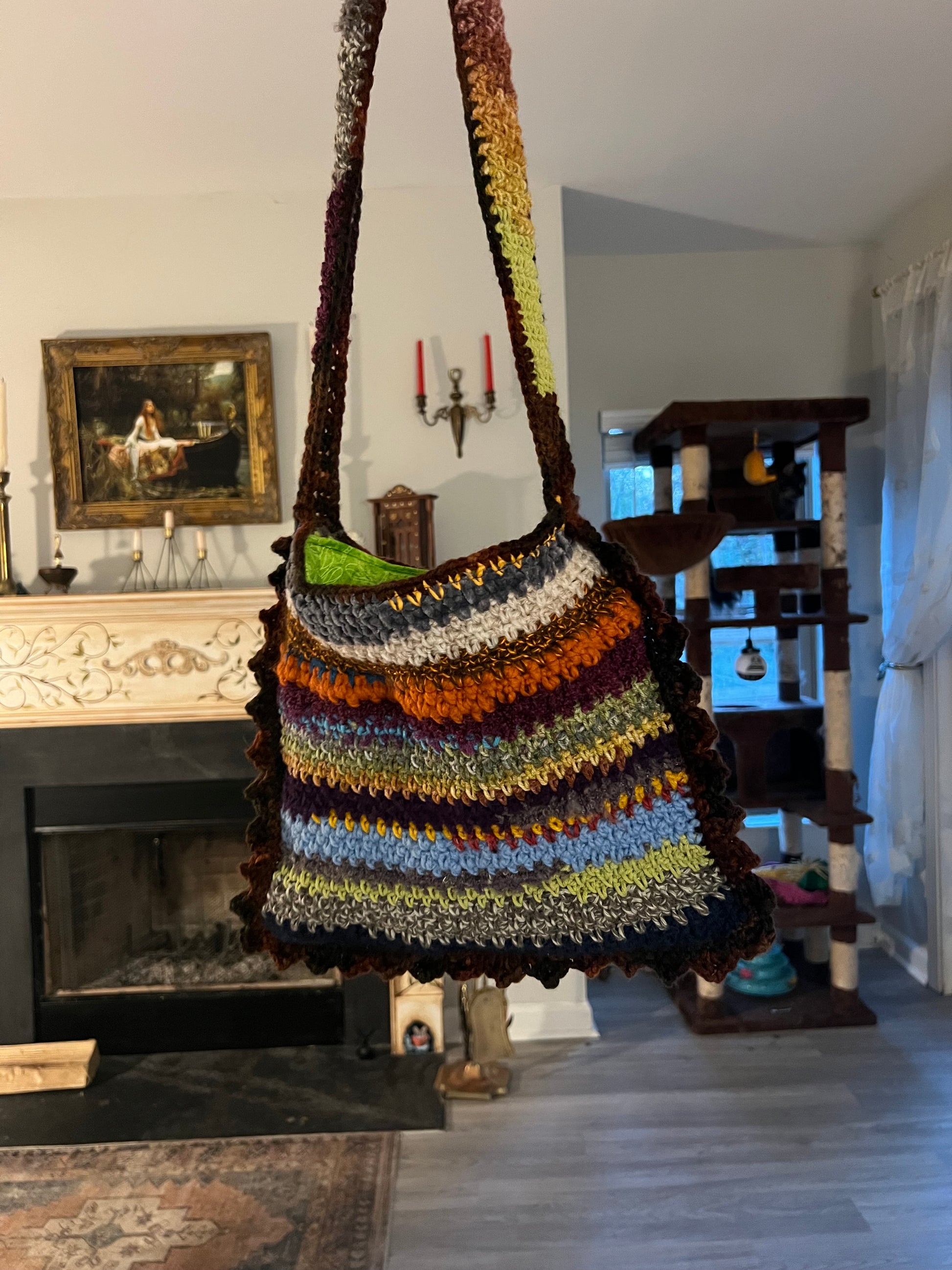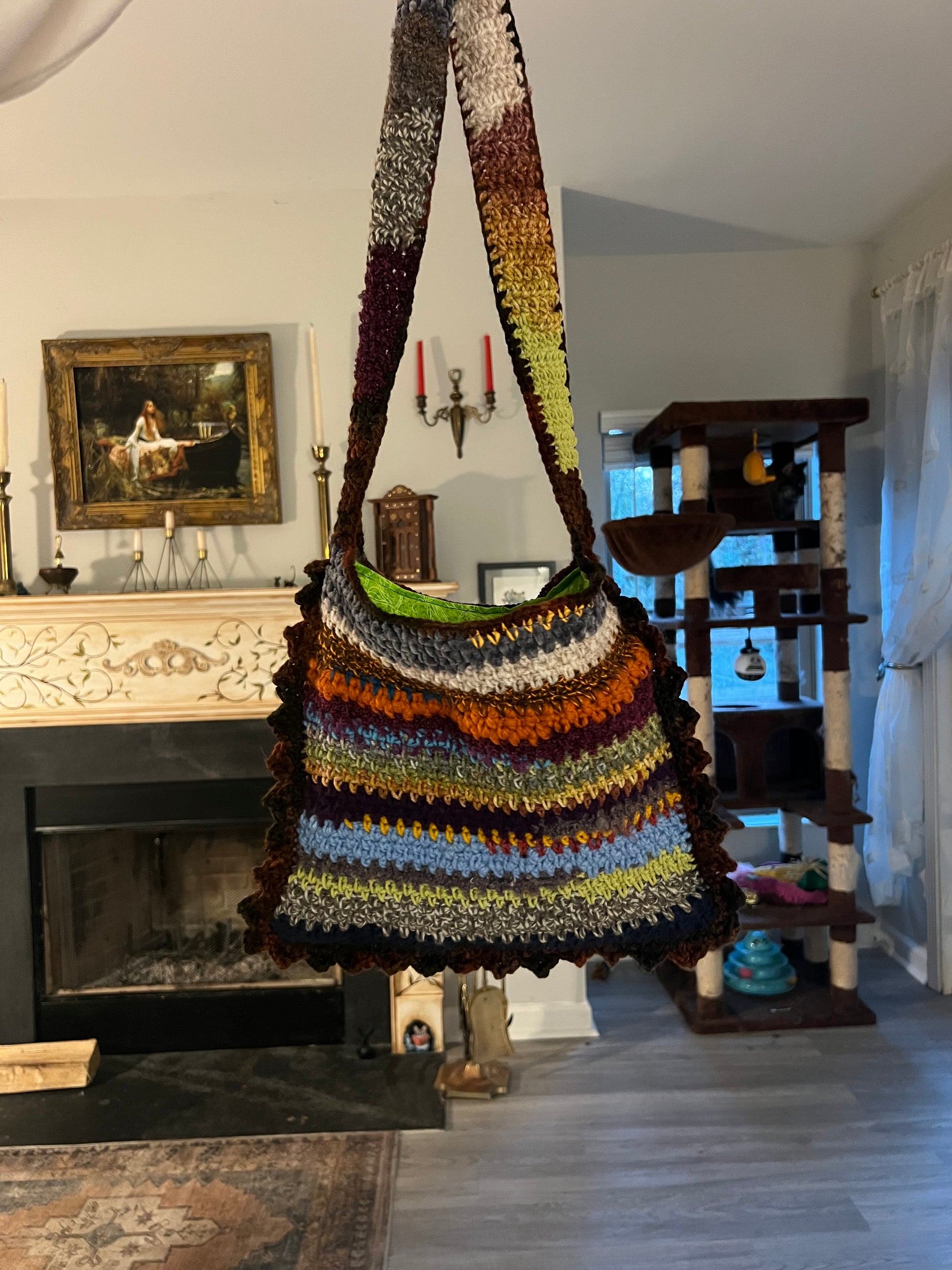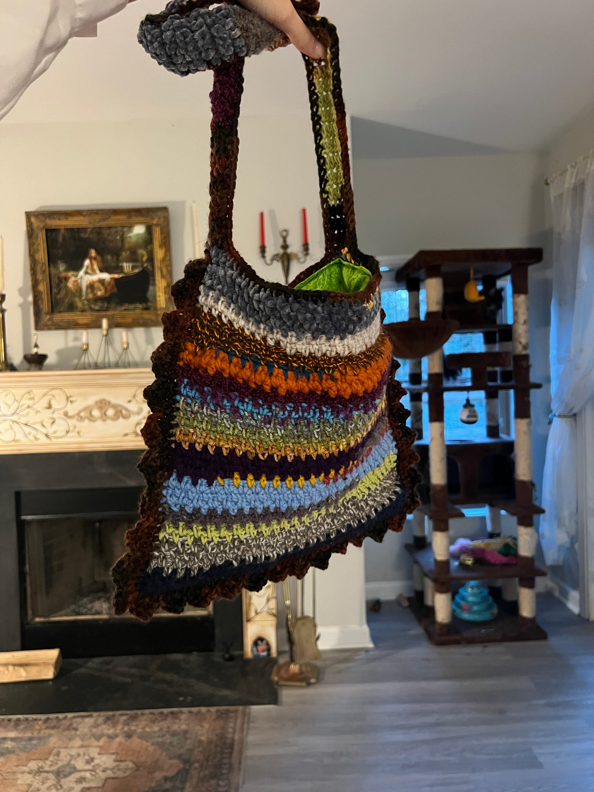 Remember how my bio says I try to make things as sustainably as possible? This bag, (like the Scrappy Beanies!), is a by-product of that endeavor. Unavoidably, every time I finish a project I have a tiny amount of yarn left that’s just enough to not want to throw away (that shit can be expensive!) but not enough for another full pattern. So I keep all the scraps in a little basket and when it starts looking full enough, a new tote or beanie is born! Each one is unique! The front and back is completely different and can be reversed! The texture is all over the place! It’s lined with, (thrifted), fabric! It’s fun! And it’s keeping yarn out of landfills! Yay!