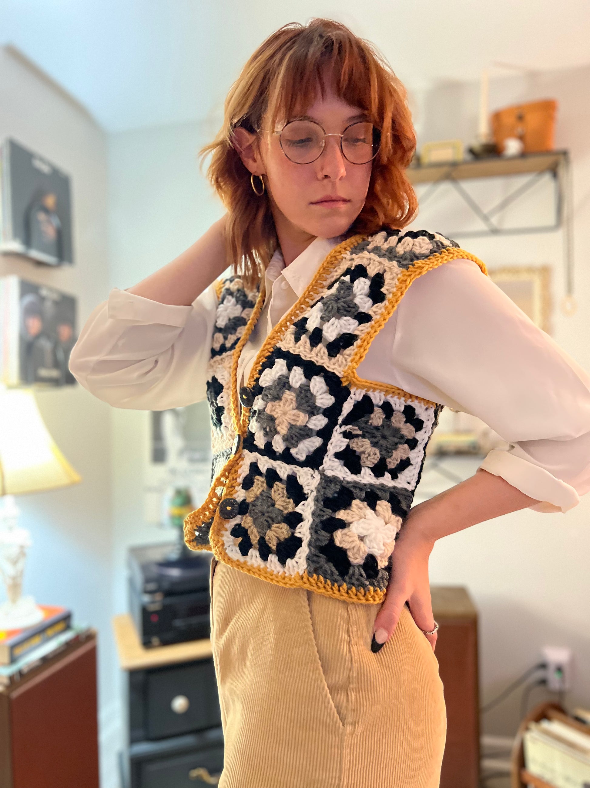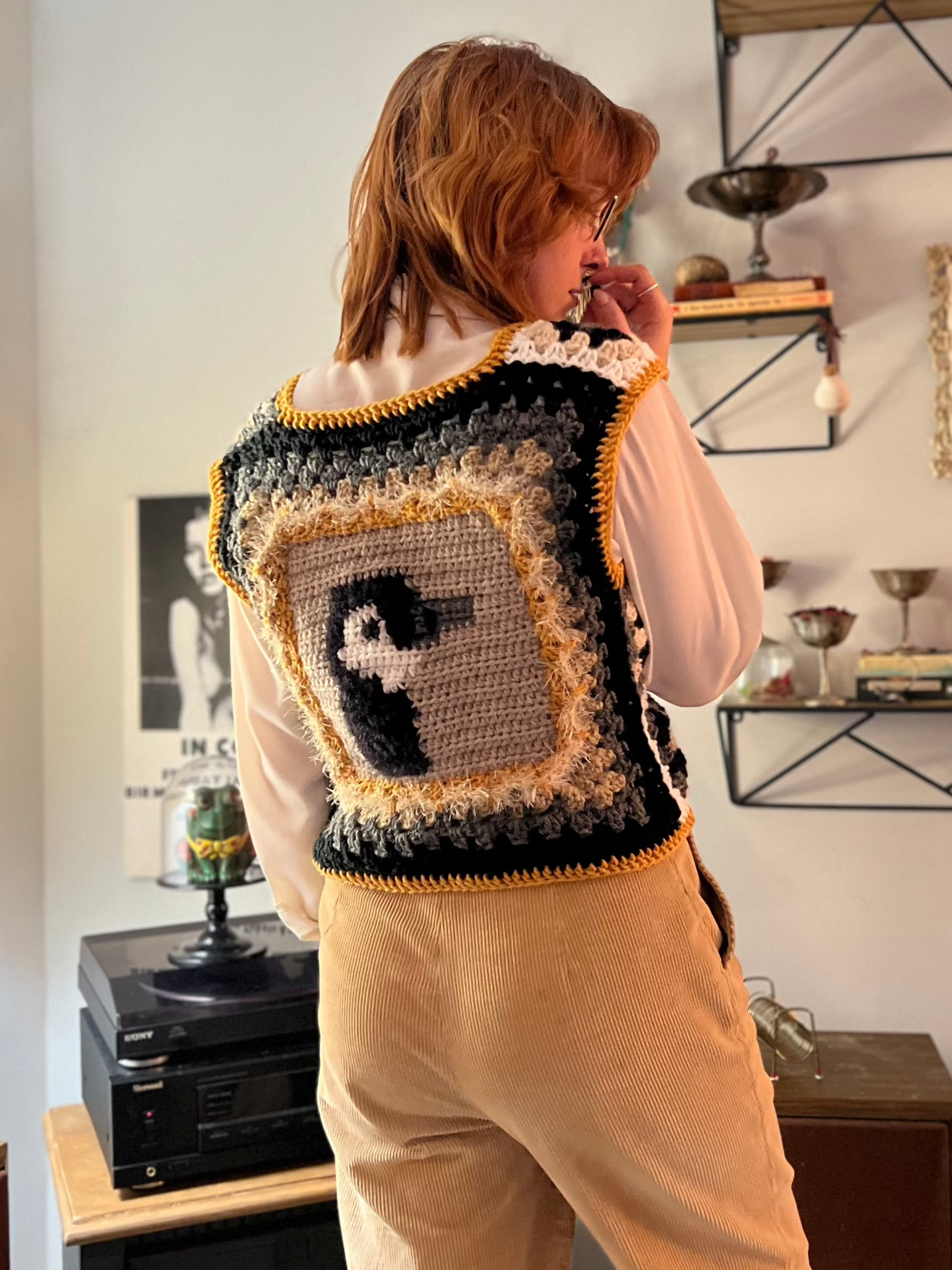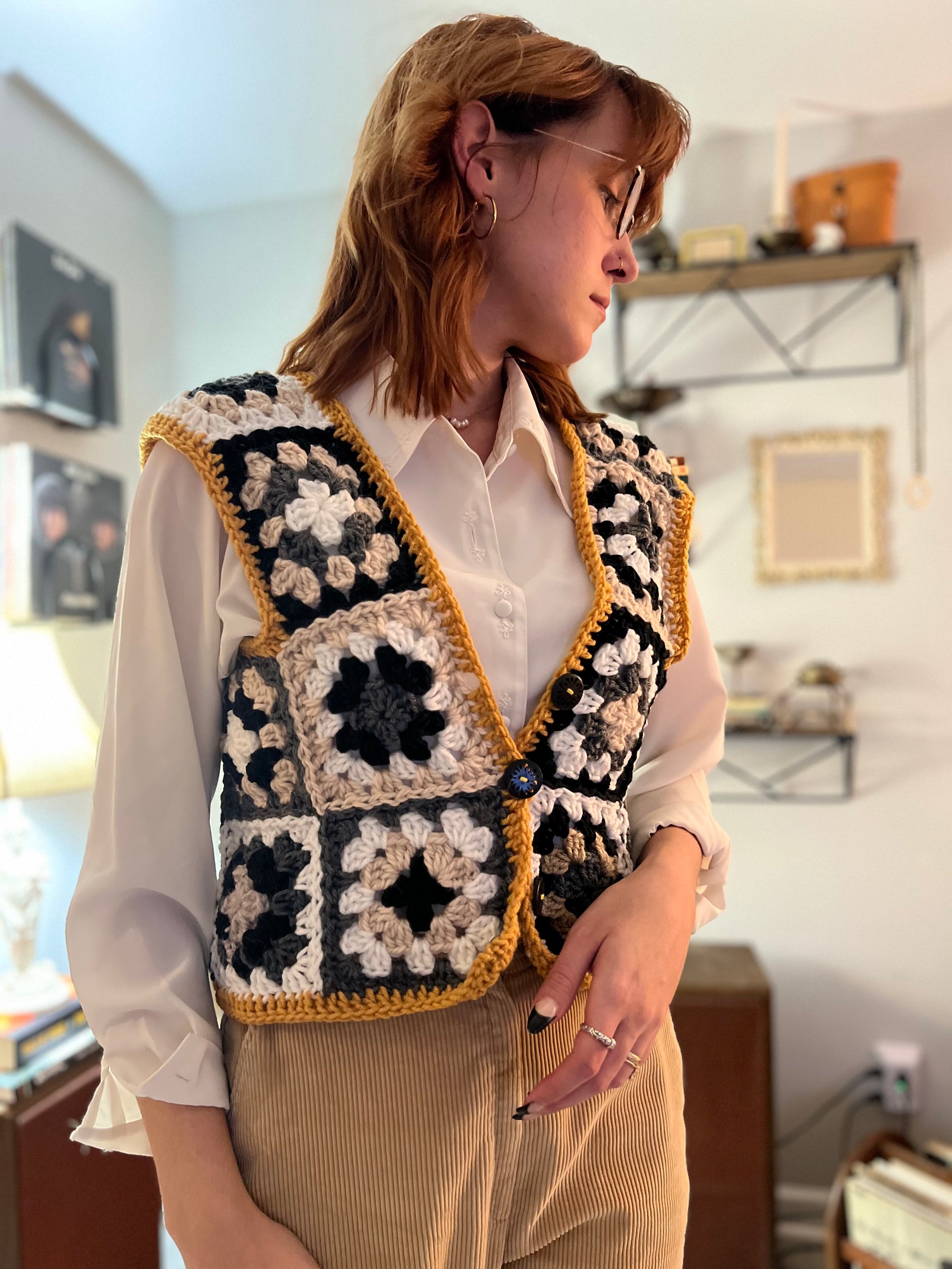 Introducing the Silly Goose Vest - a statement piece for any wardrobe! This crocheted vest features a playful goose pattern in black and white, accented by a bright gold border. Made with soft materials, it's both comfortable and eye-catching. Easily fasten with the little buttons on the front. Fits a size medium.