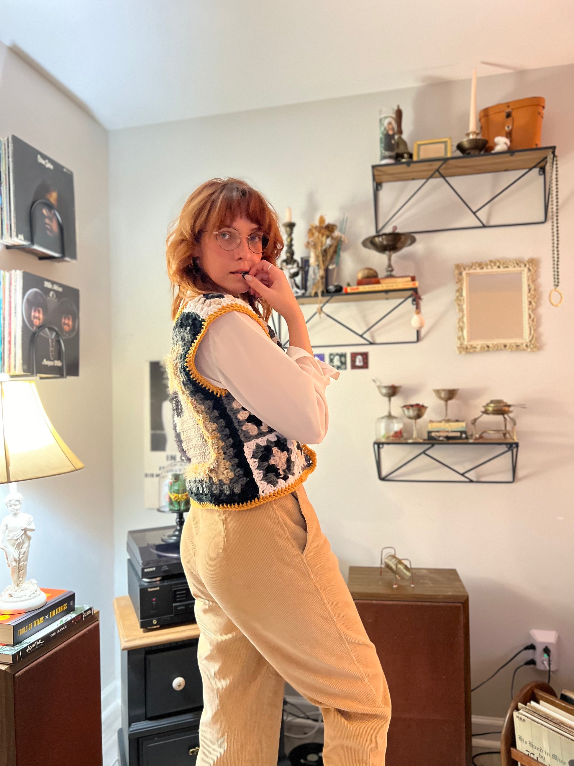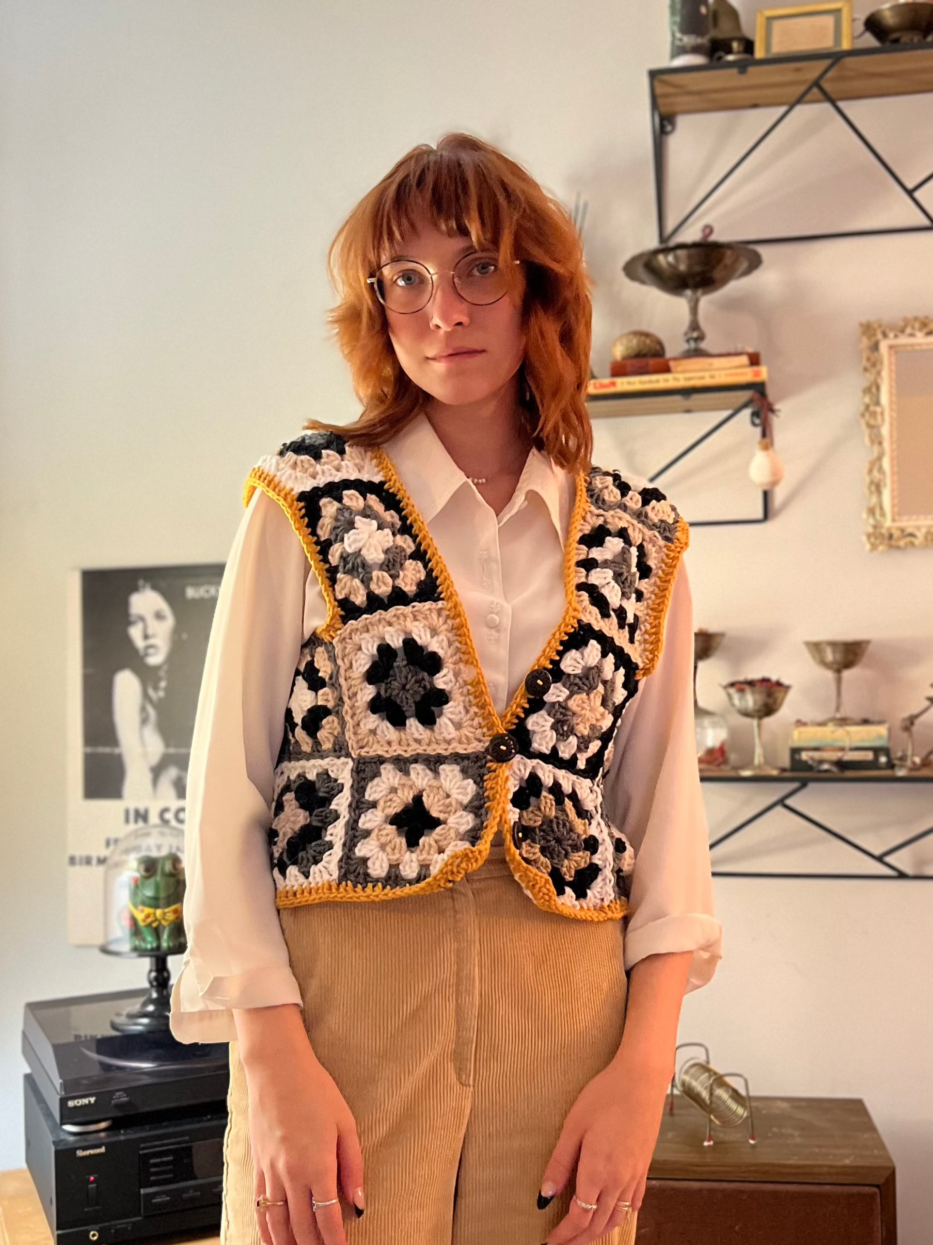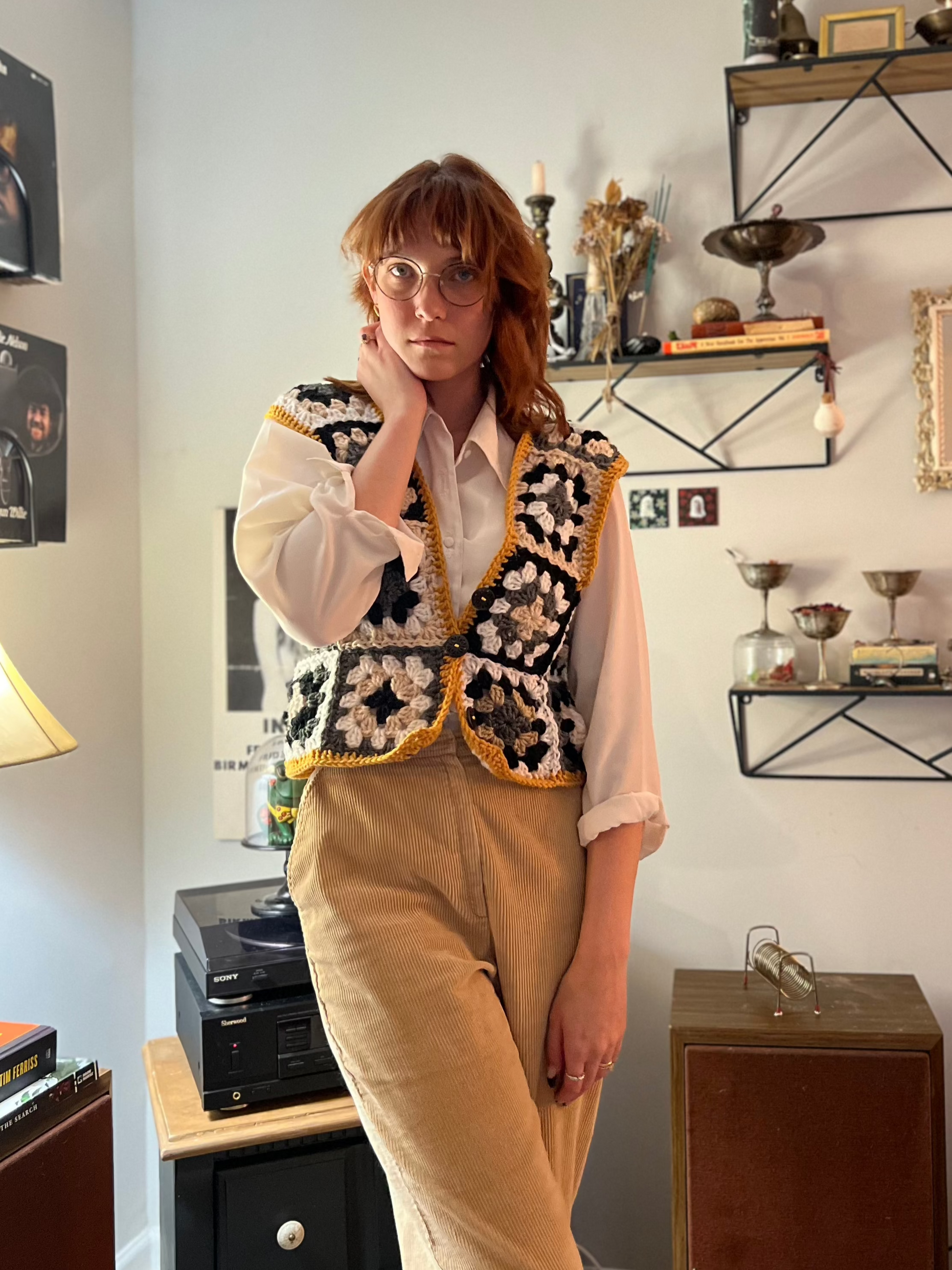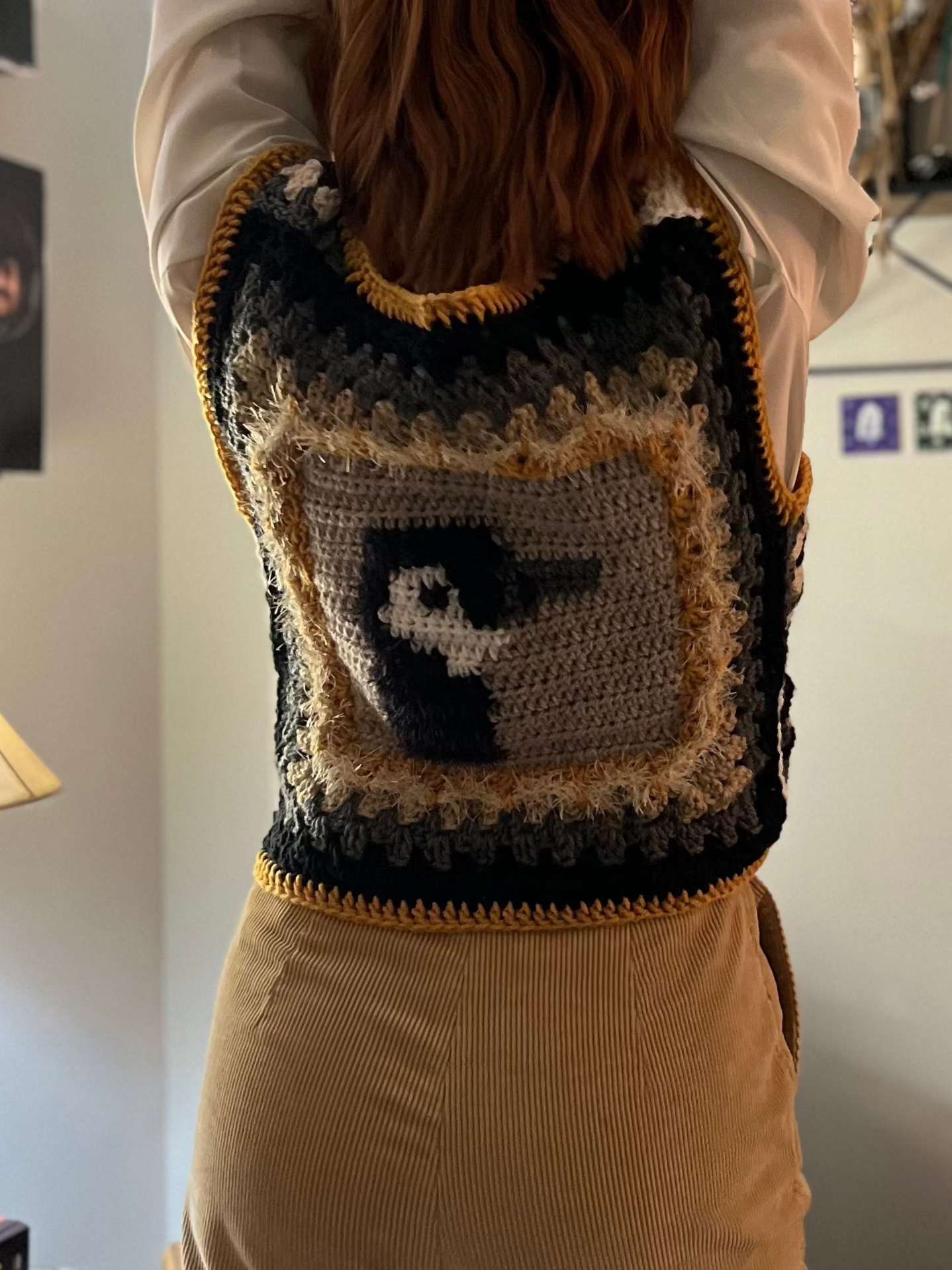 Introducing the Silly Goose Vest - a statement piece for any wardrobe! This crocheted vest features a playful goose pattern in black and white, accented by a bright gold border. Made with soft materials, it's both comfortable and eye-catching. Easily fasten with the little buttons on the front. Fits a size medium.