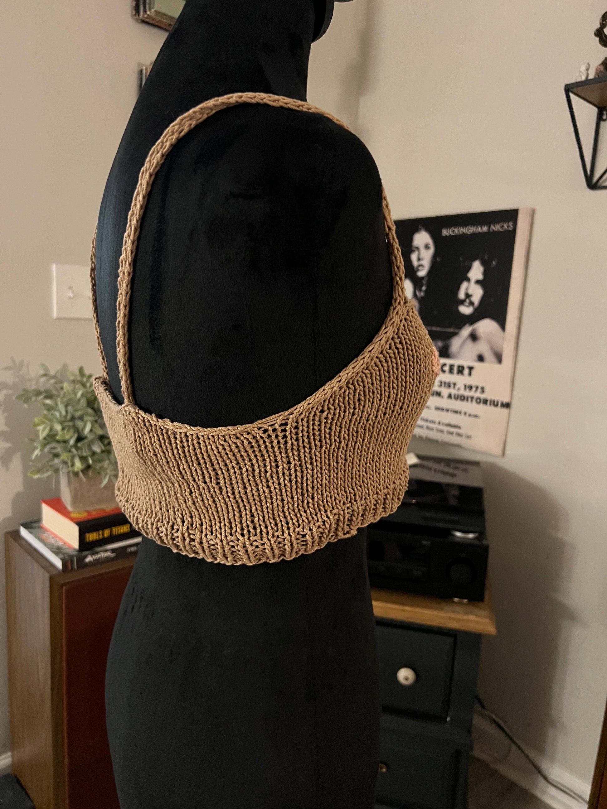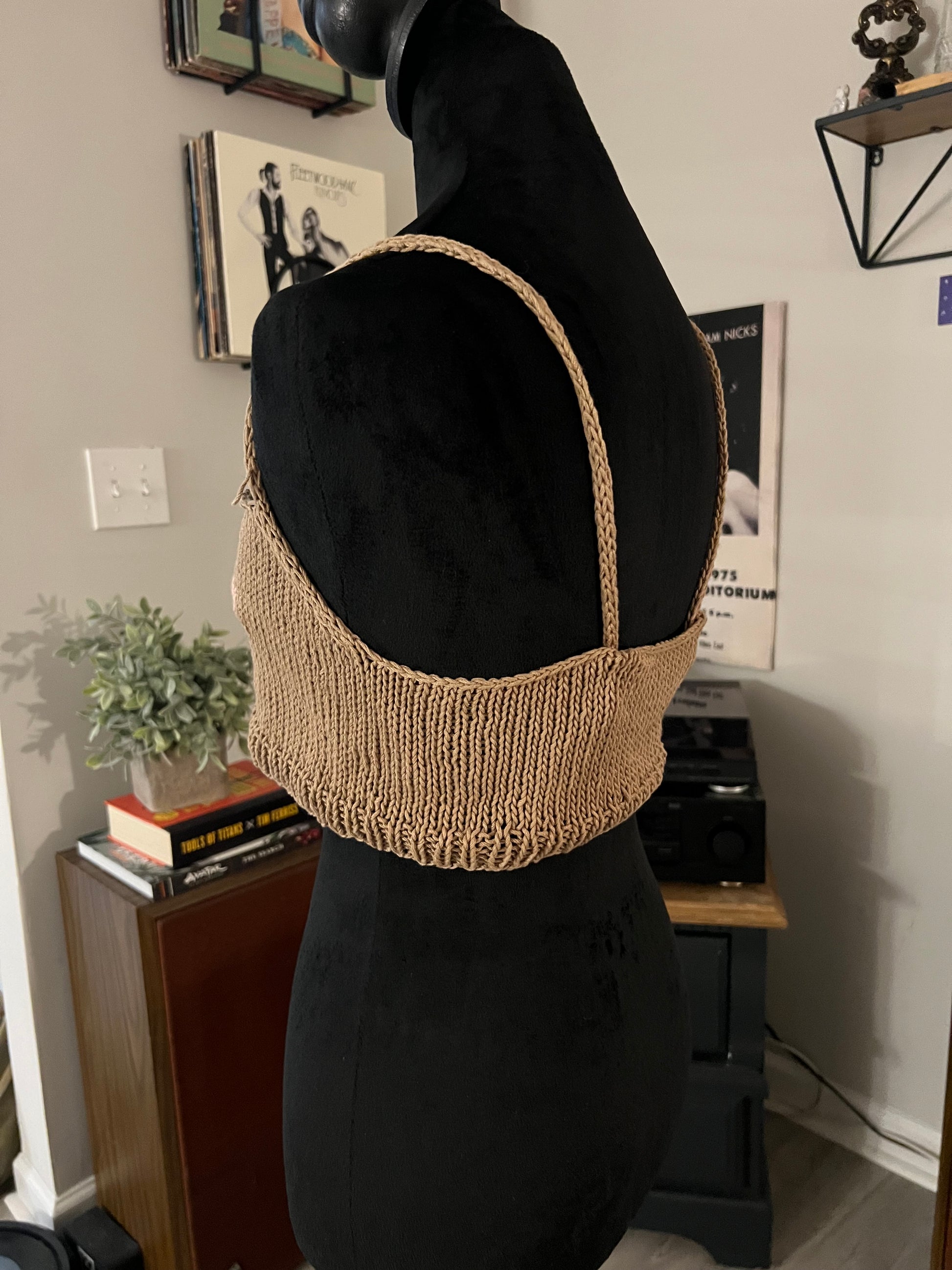 this titty tank top is one of the first things i ever made for myself when i began this crazy journey of subversive fiber art. while she holds a special place in my heart, (and bears some signs of love), i think it’s time for someone else to have her and love her now. as mentioned, she is preowned and worn by me, so i have heavily marked her down due to that. she is 100% hand knit and made of soft cotton. if i had made this to sell, you could expect it to be priced closer to $65 or $75. feel free to reach out with any questions!
