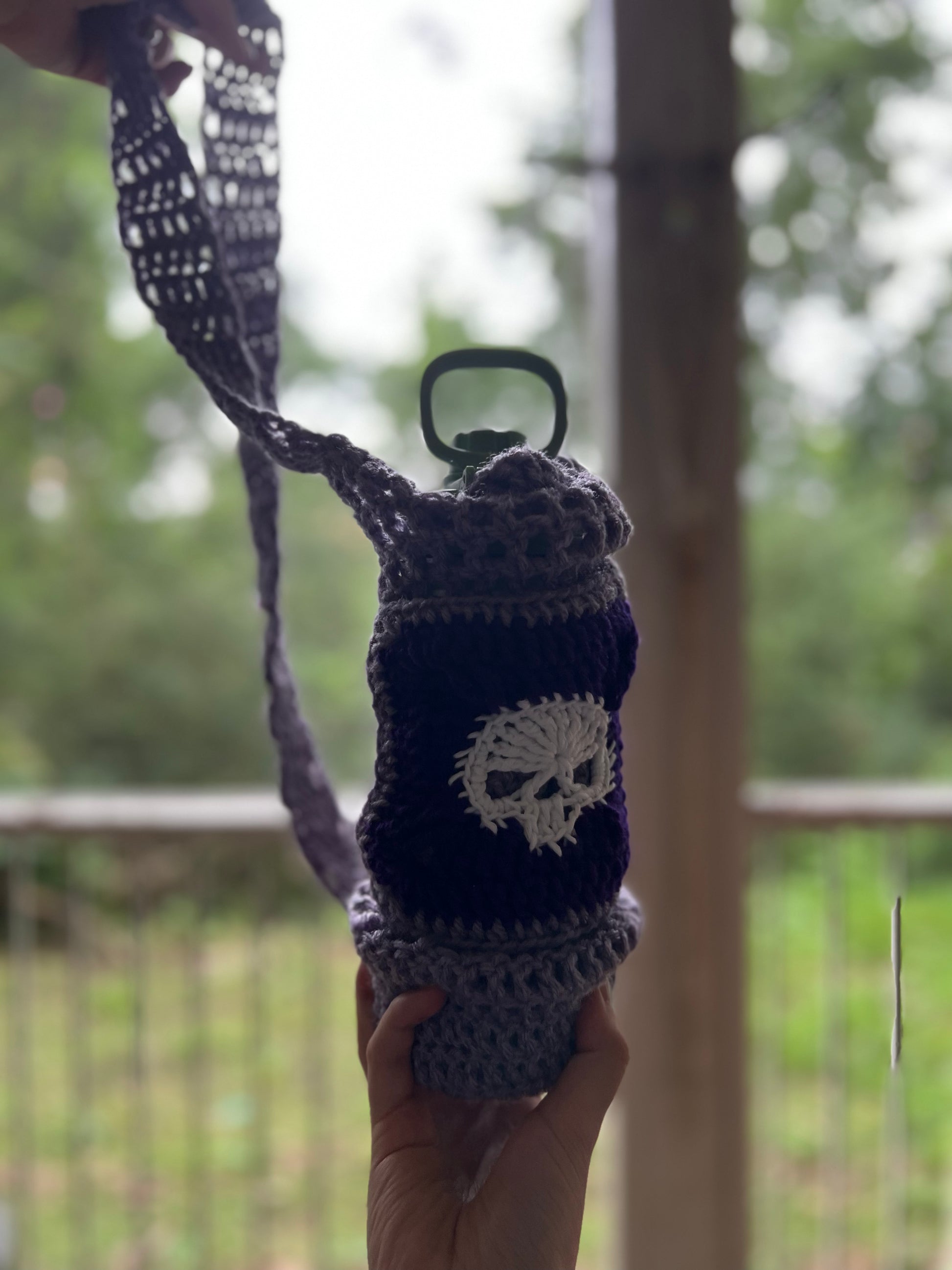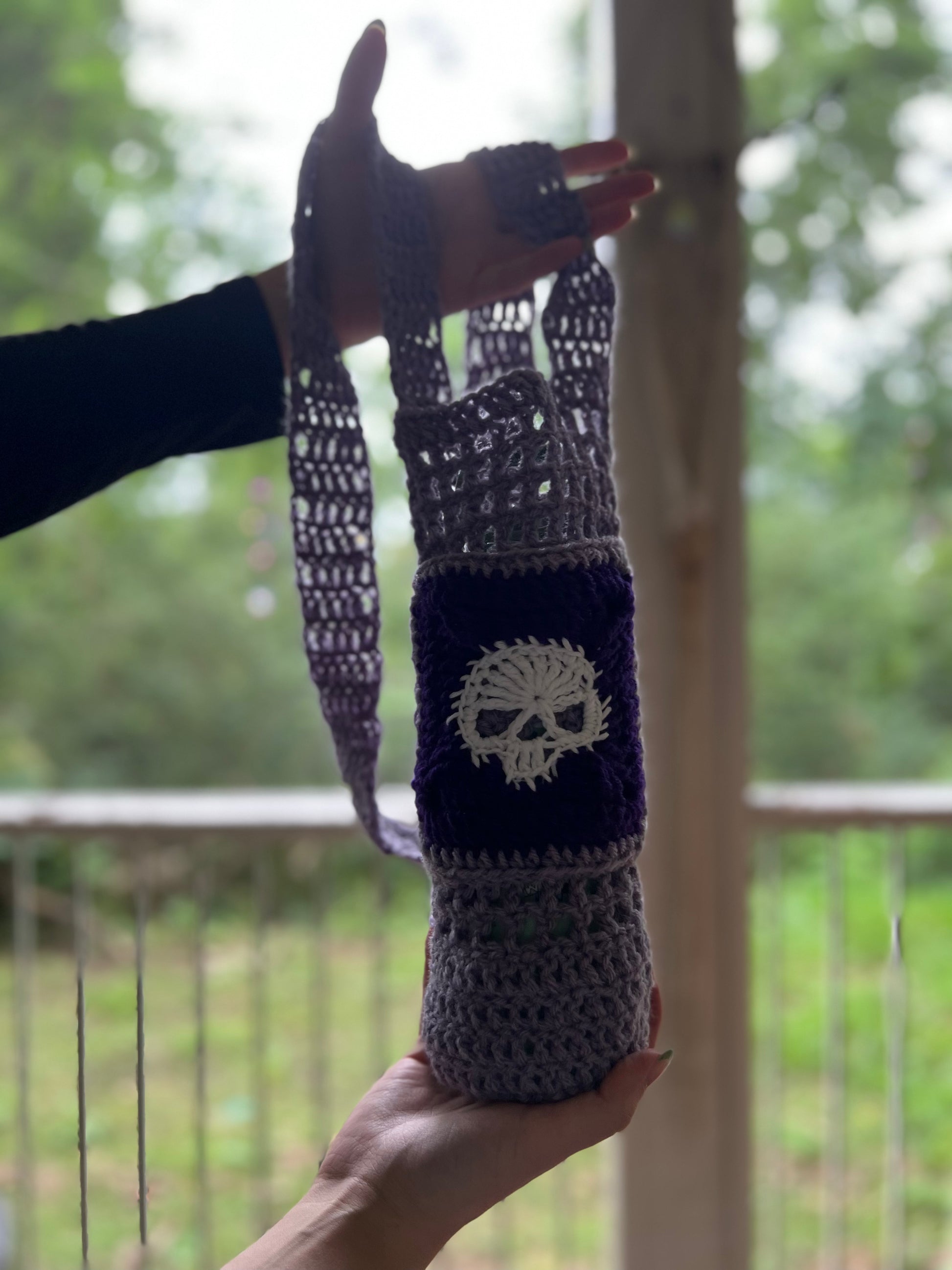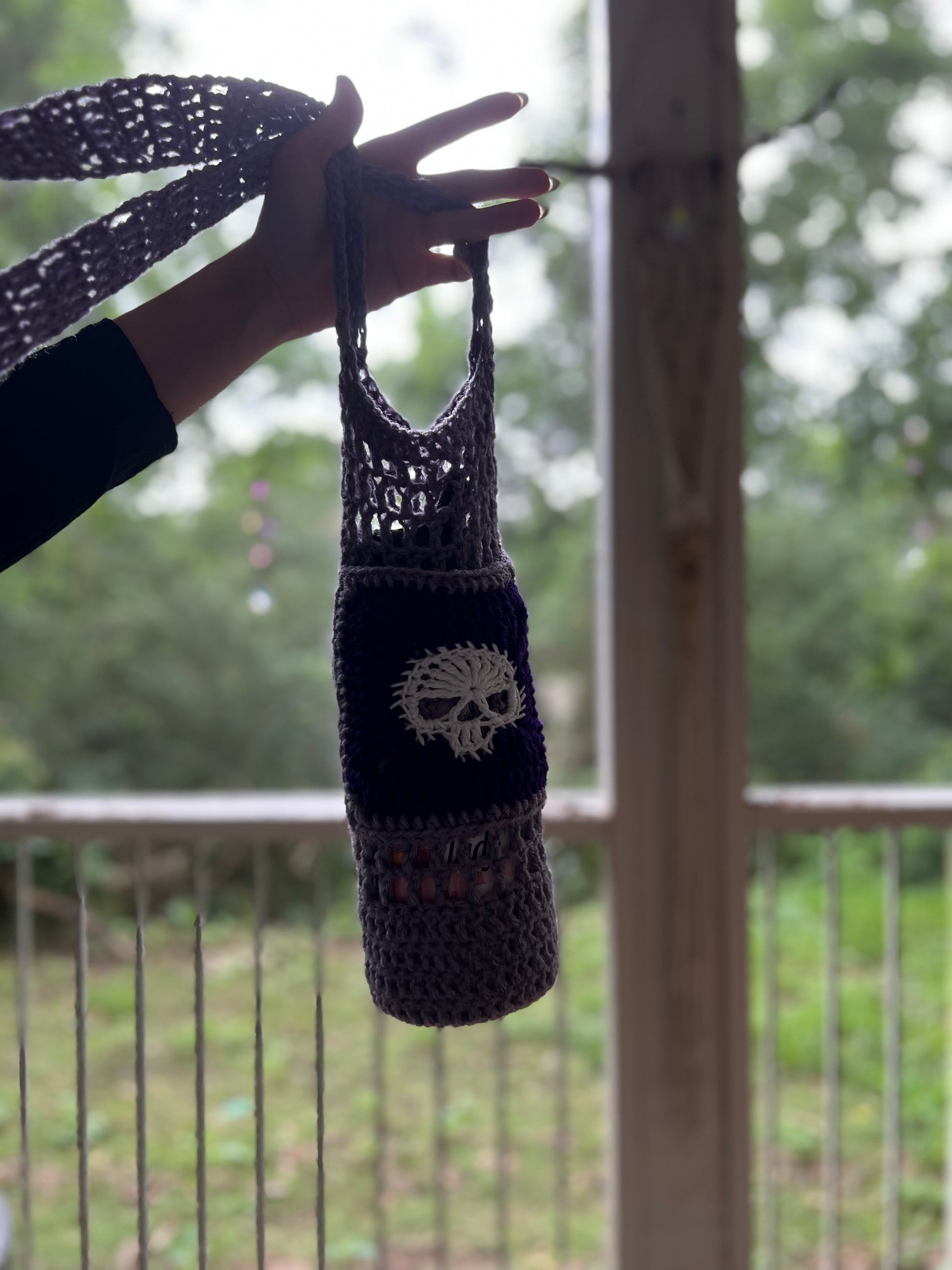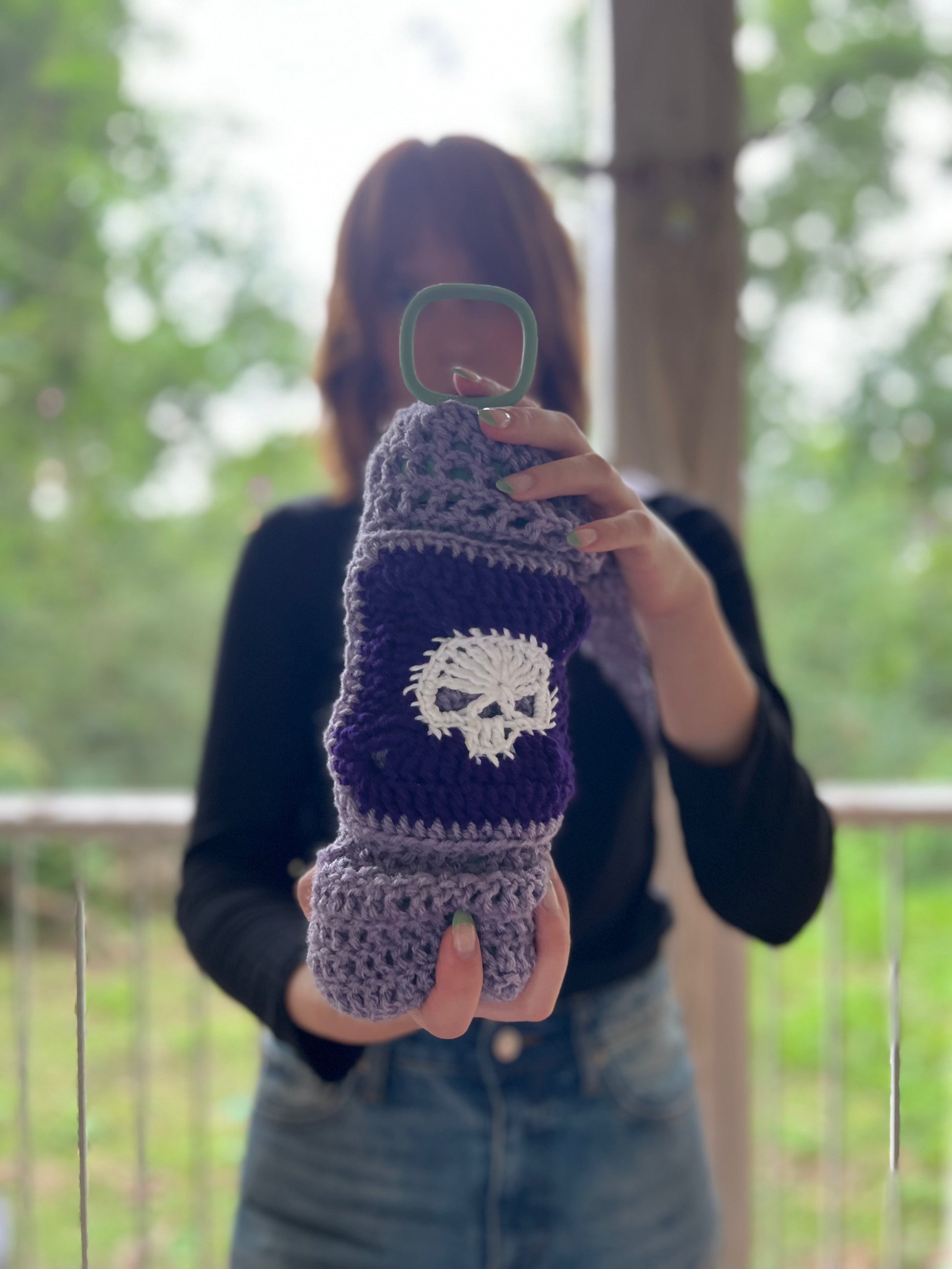 This Water or Wine Bottle Purse is the perfect solution for staying hydrated on the go. Made from soft, flexible material, it features a cute skull pattern. With a convenient pocket on the front for your phone or ID, it's a must-have for walks and makes a great gift.