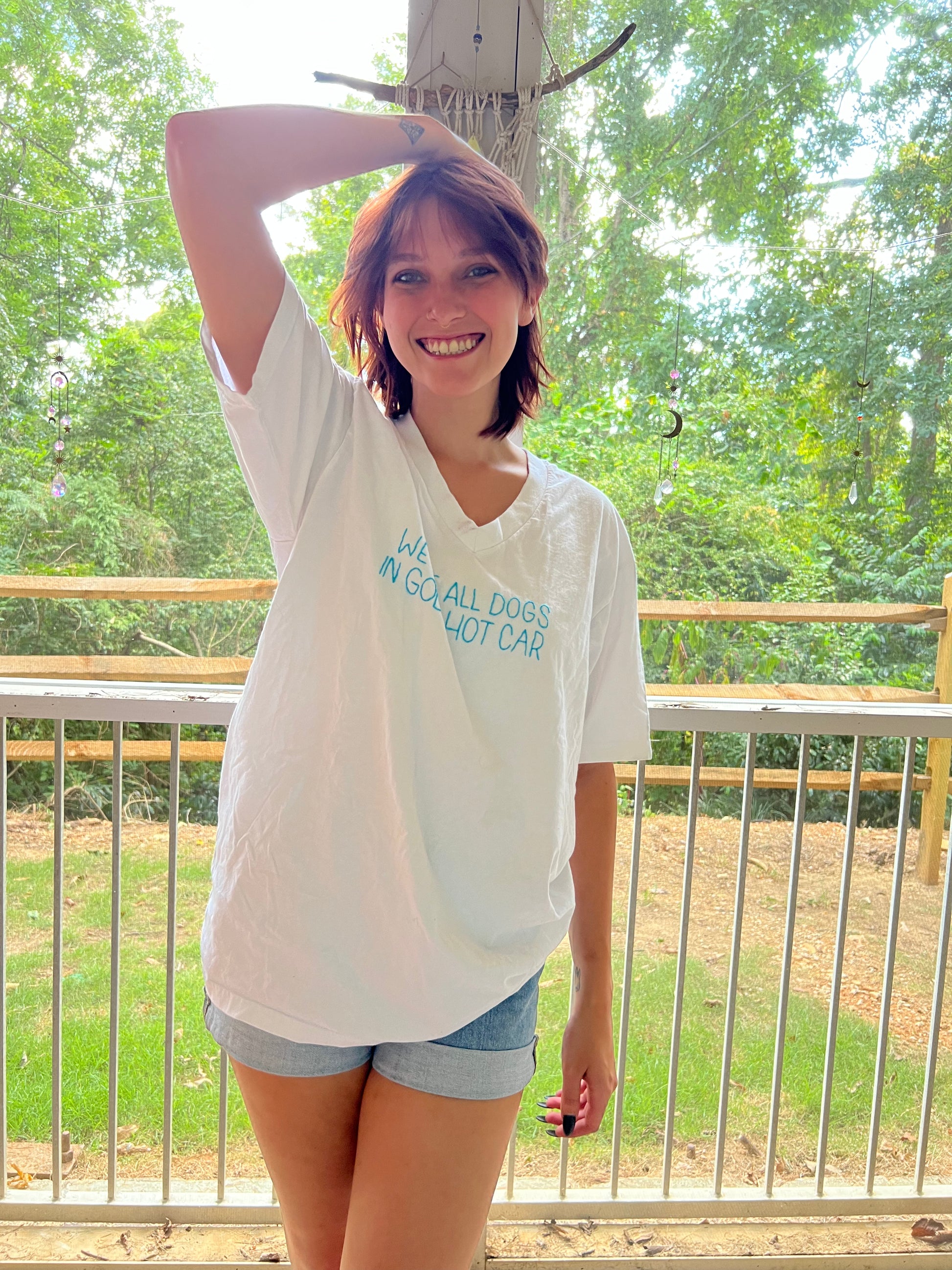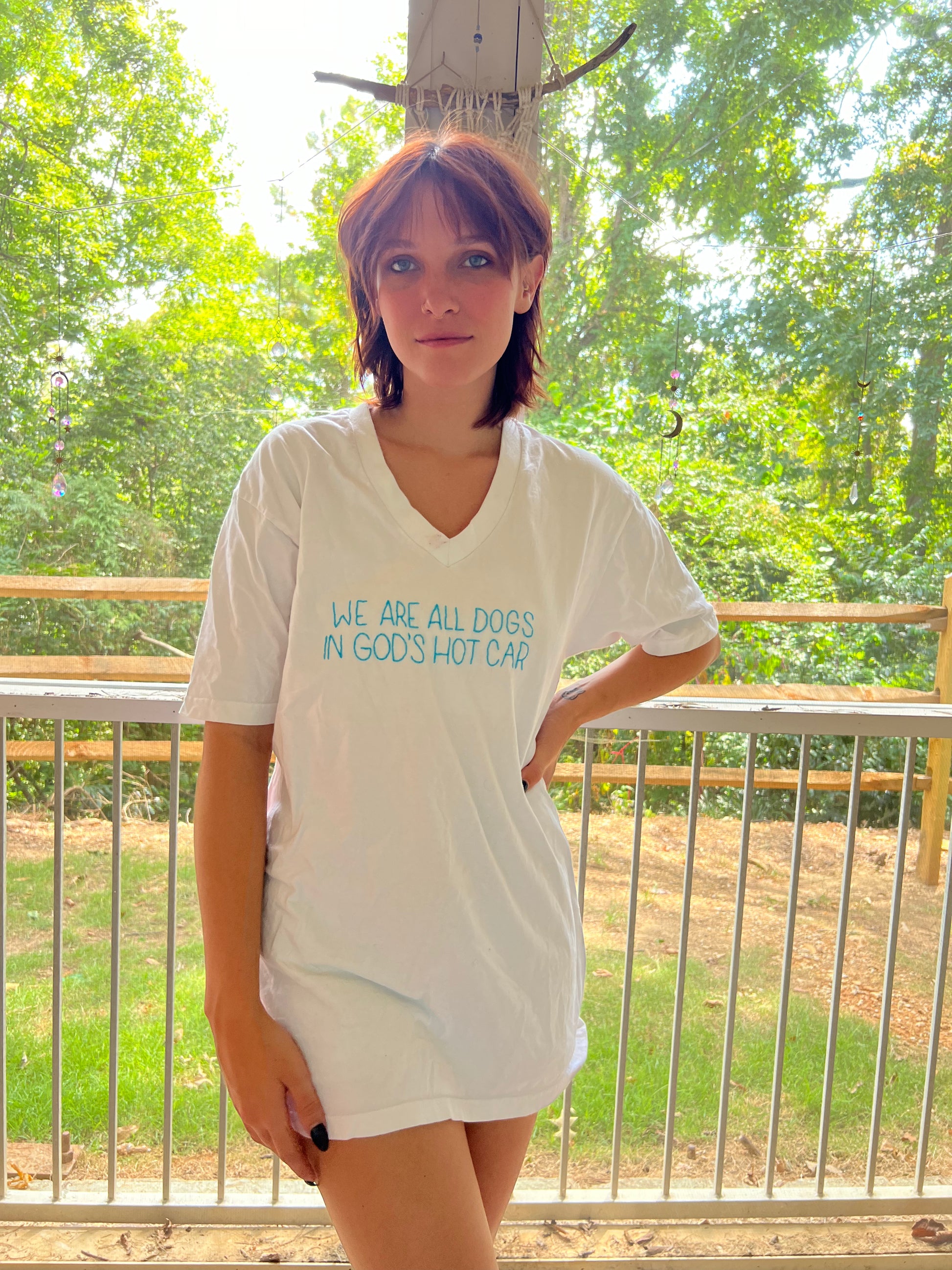 Show off your sense of humor and make a statement with our We Are All Dogs In God's Hot Car Shirt. With its attention-grabbing blue hand embroidered lettering, this large shirt is the perfect way to share your thoughts on religious trauma. Get ready to turn heads and spark conversations with this clever and bold design.